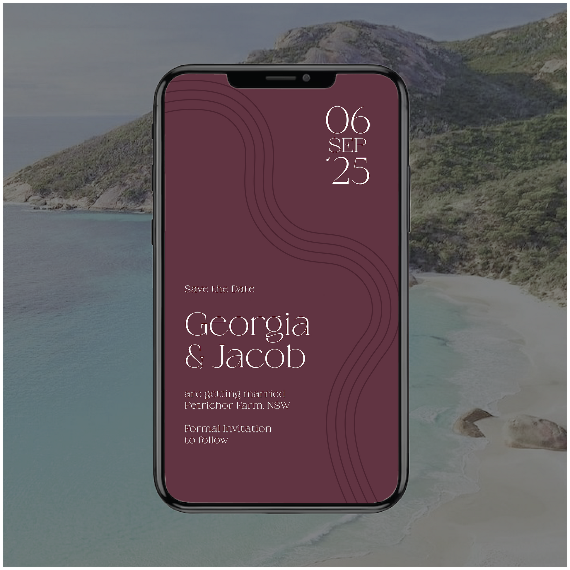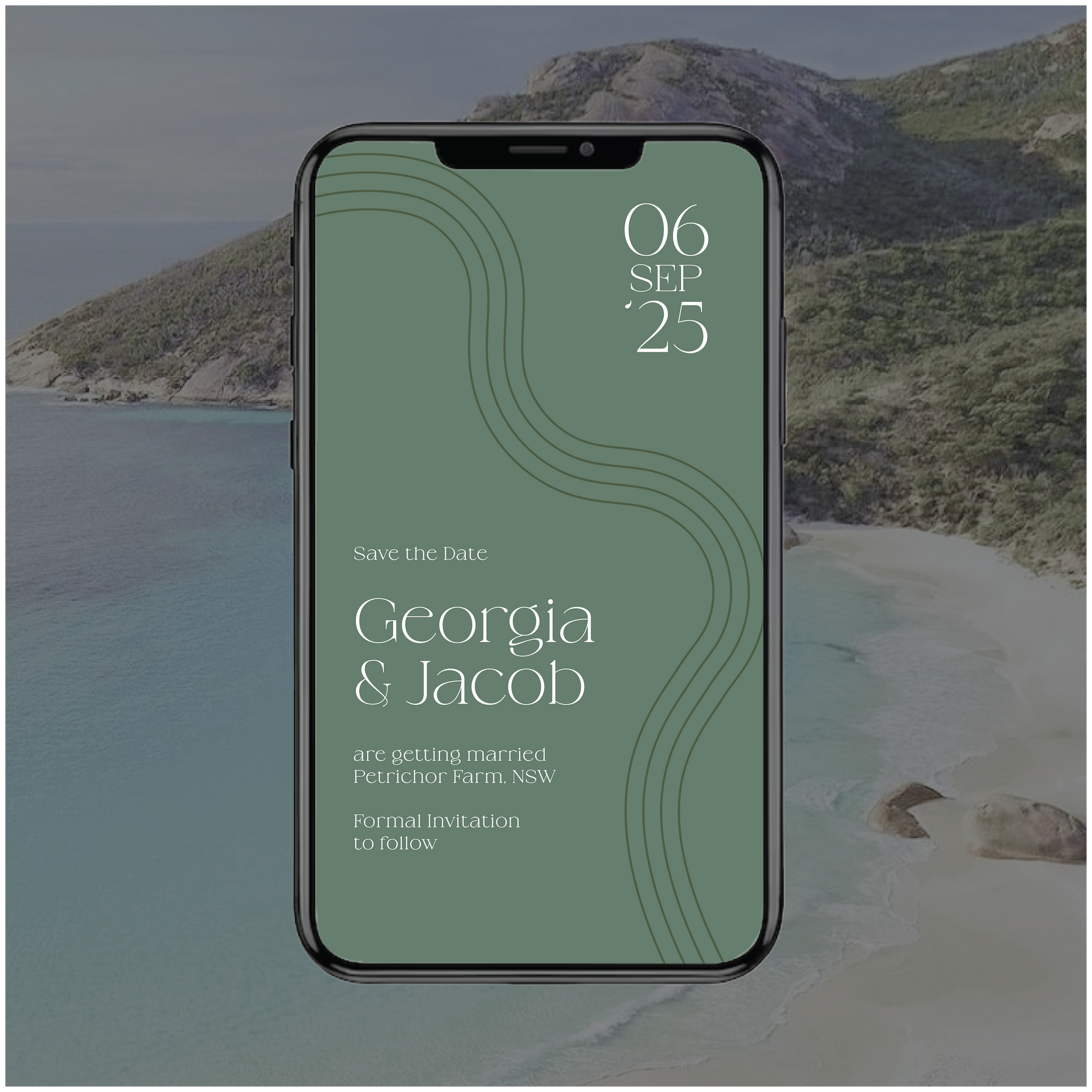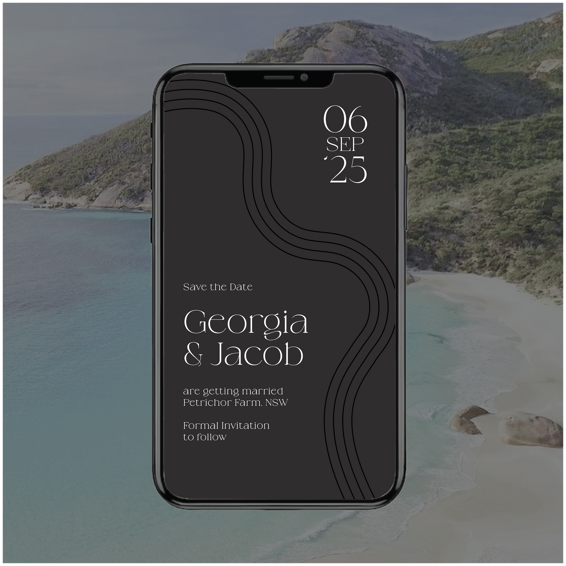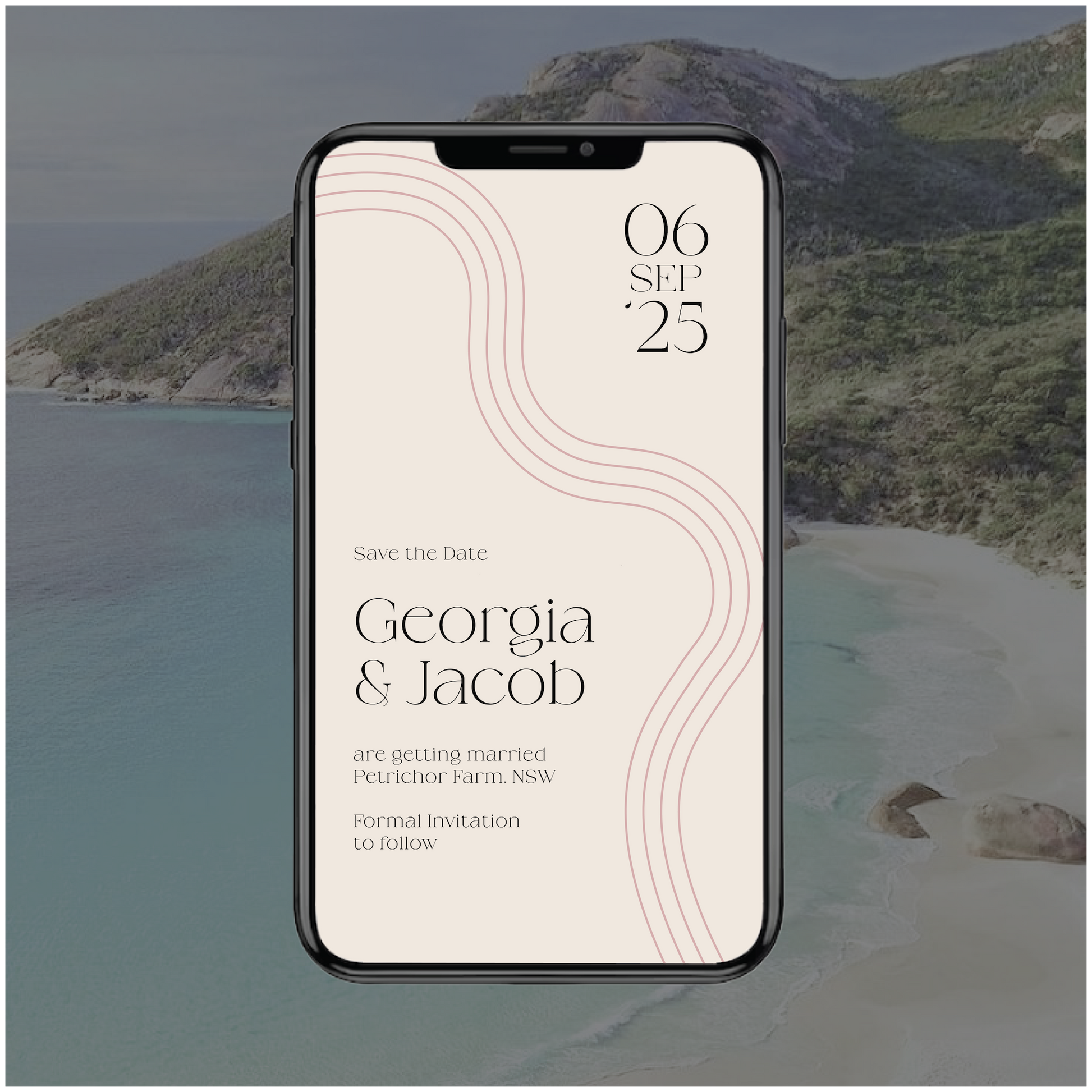 Part of the Australia collection, this digital save the date wedding invite features wavy lines that flow down the page to mimic our many iconic beaches rivers.