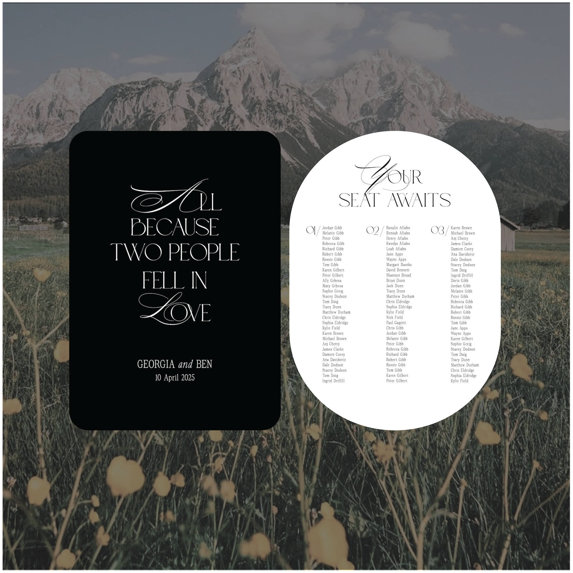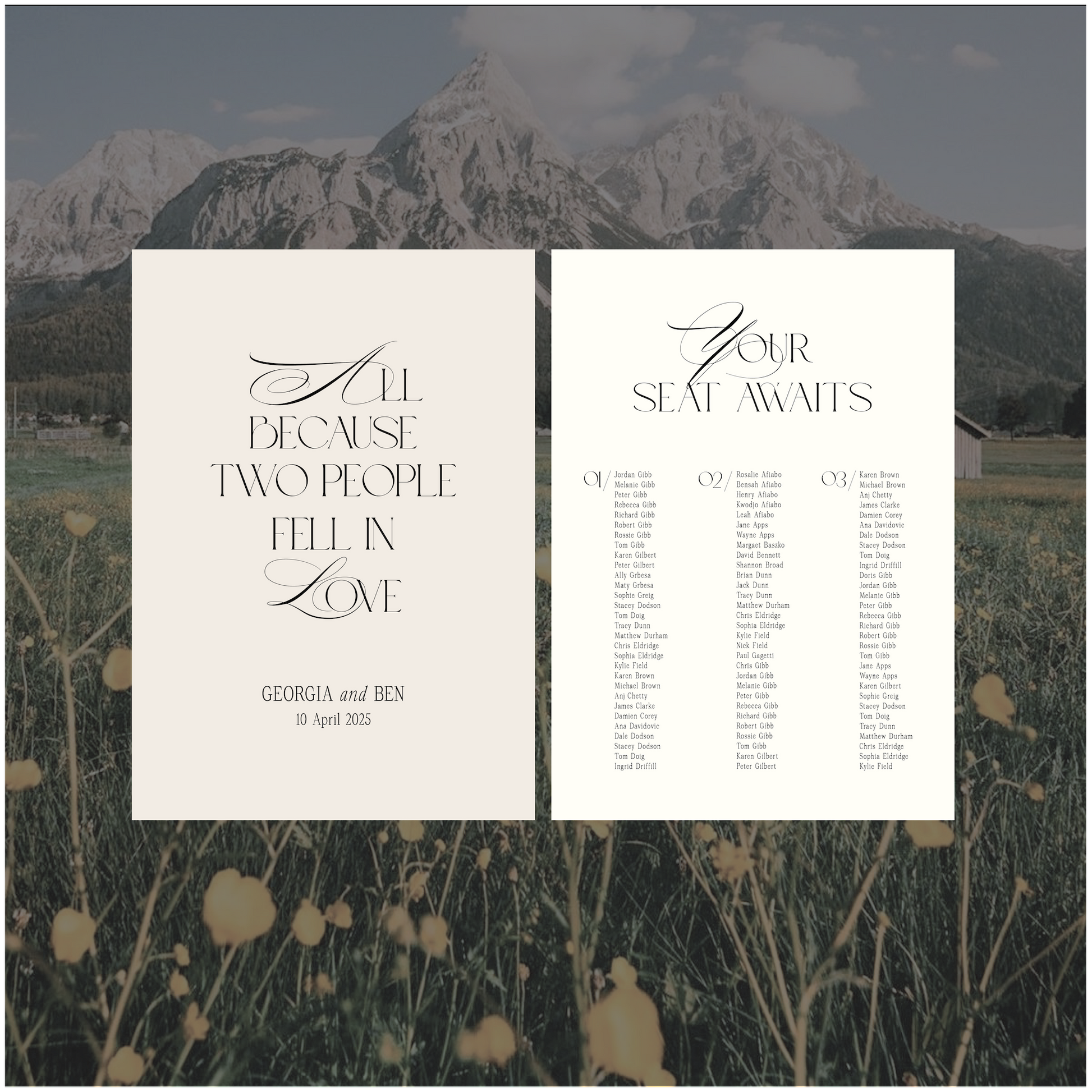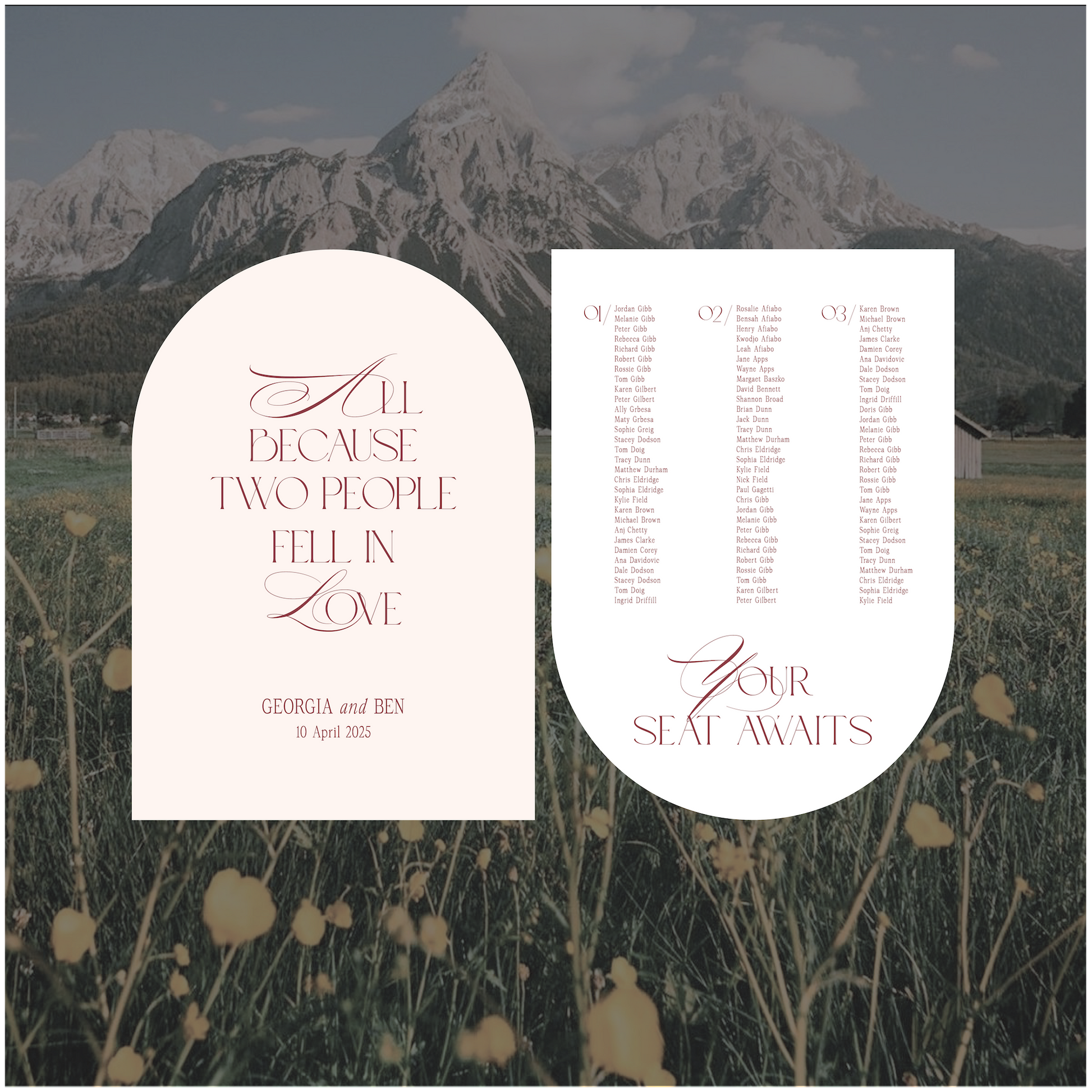 This Austria wedding welcome and seating chart signage package is a modern take on the traditional style and encompasses romantic elements.