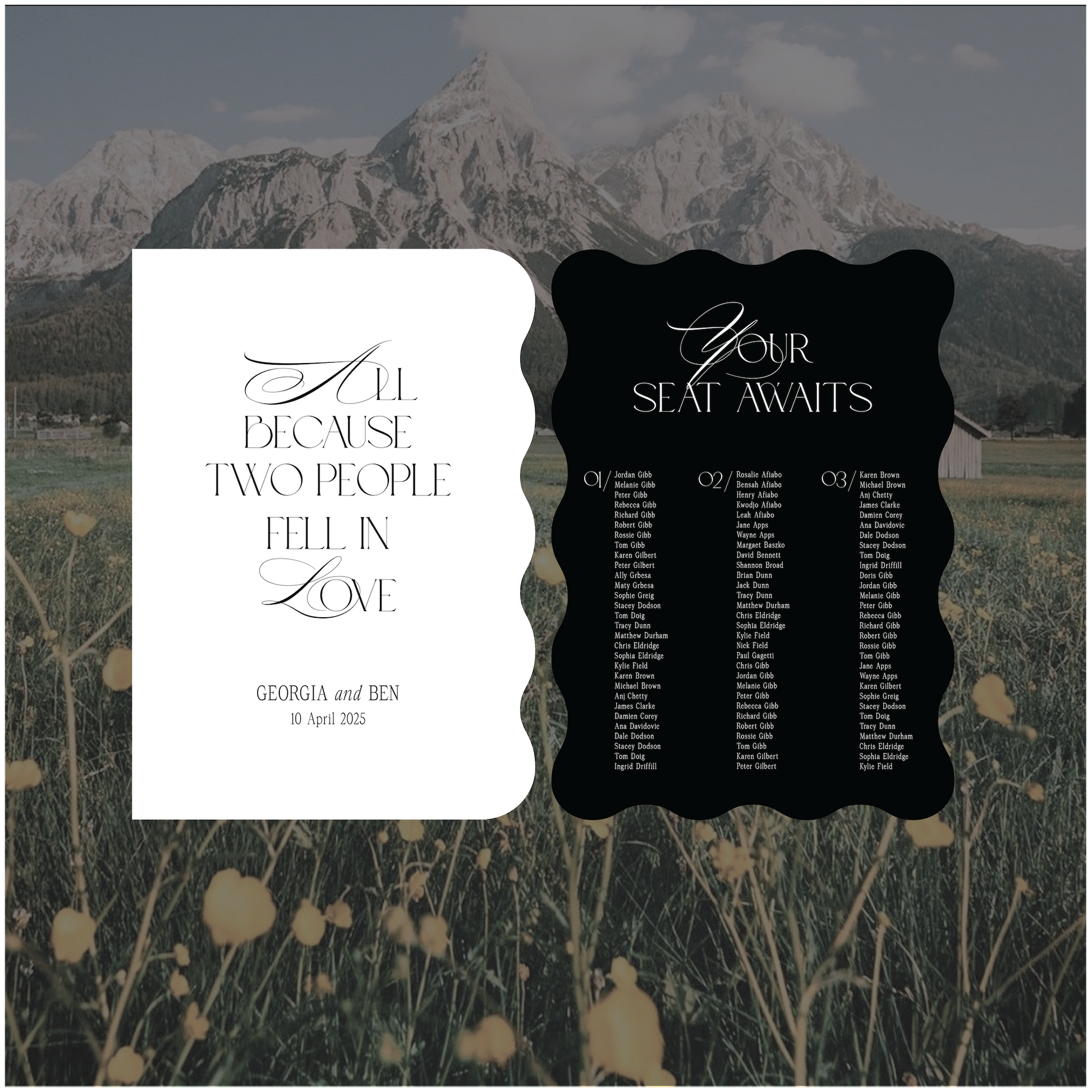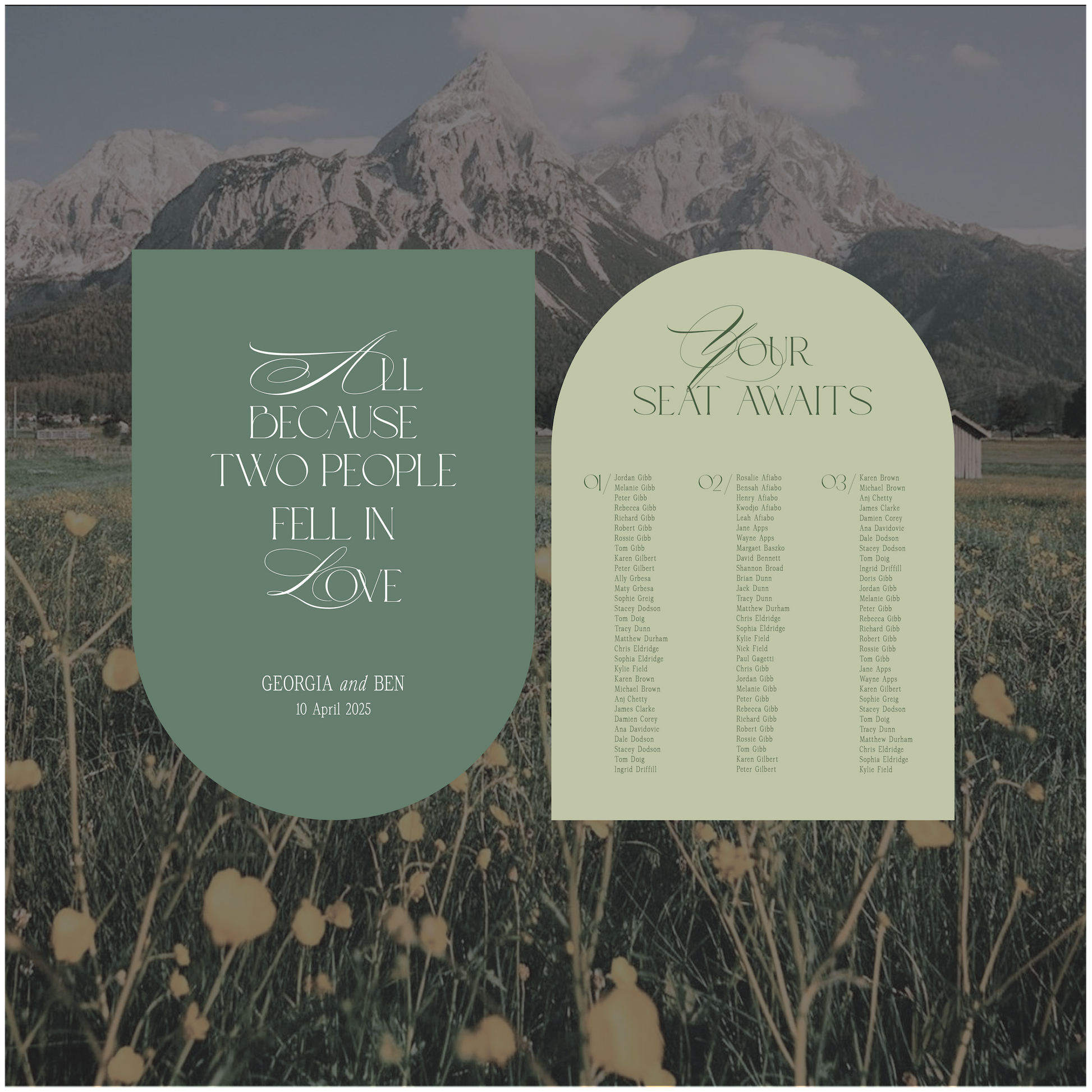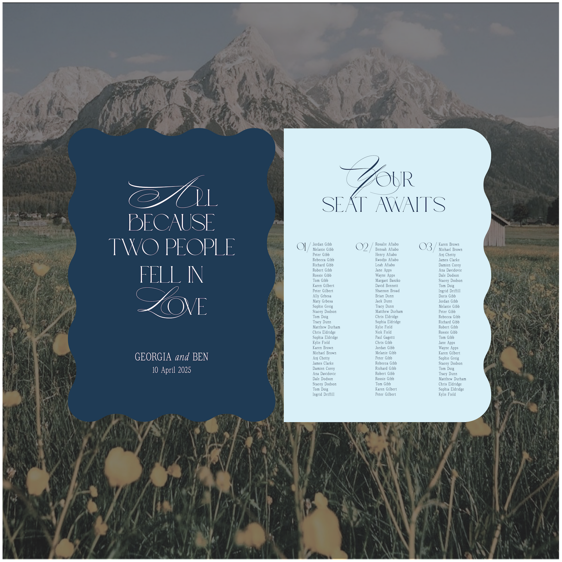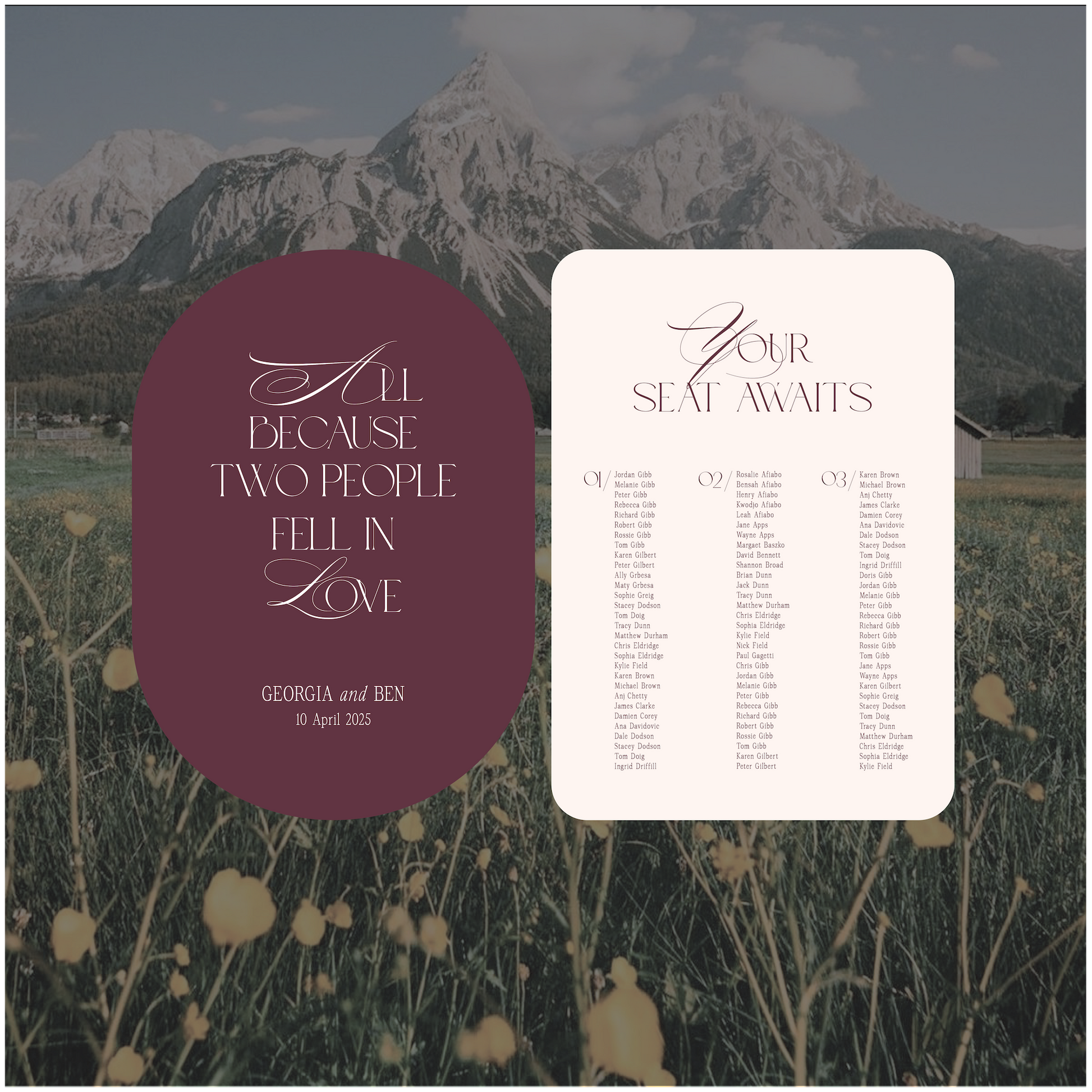 This Austria wedding welcome and seating chart signage package is a modern take on the traditional style and encompasses romantic elements.