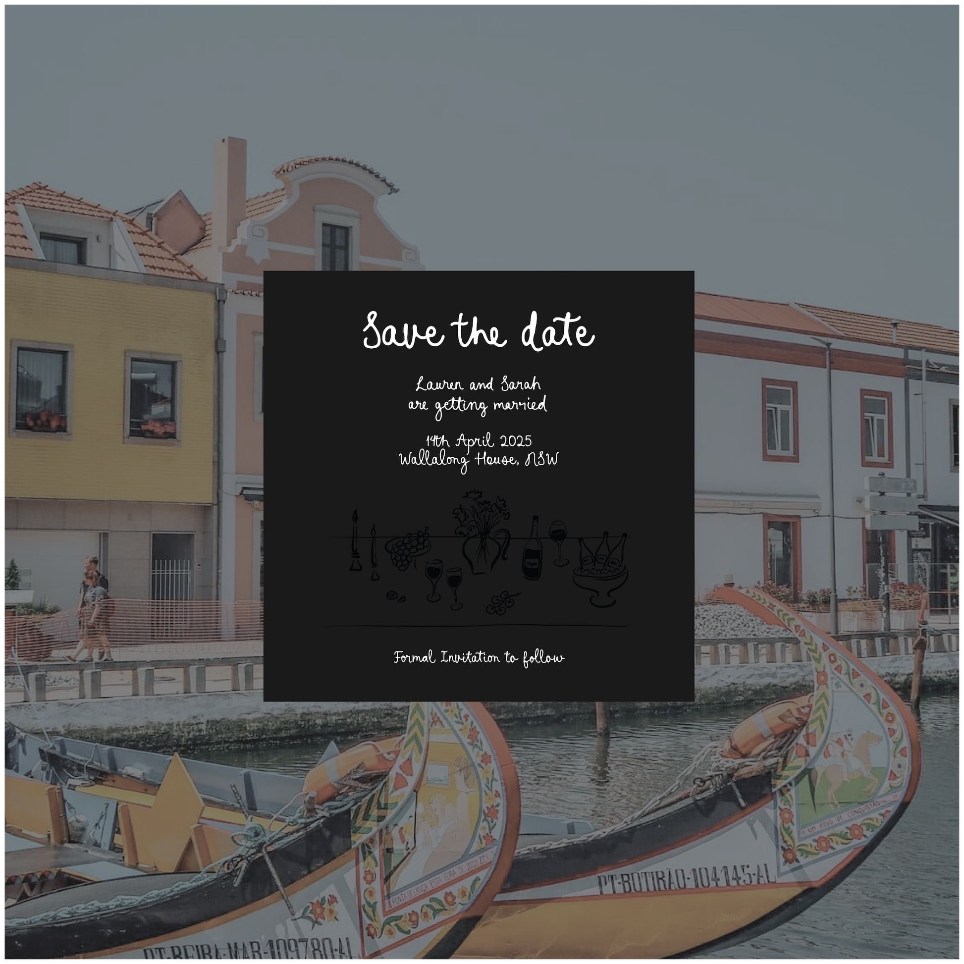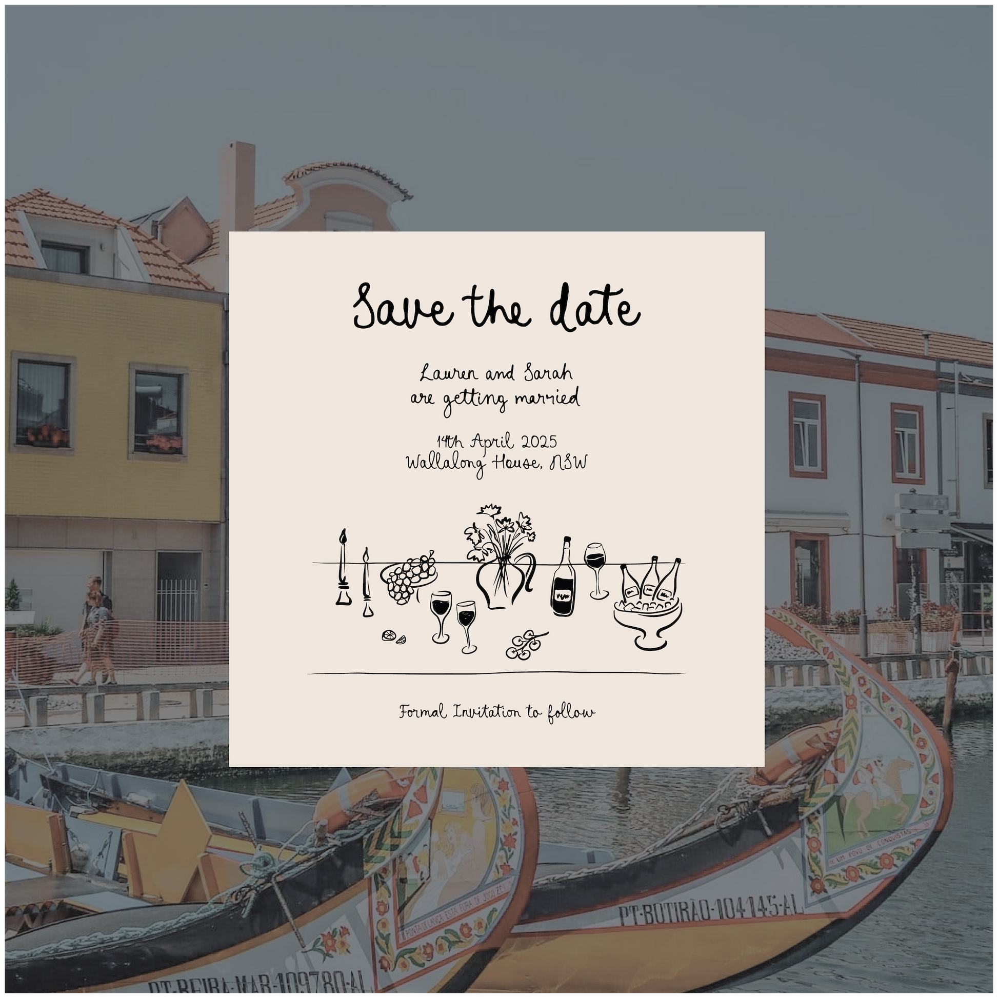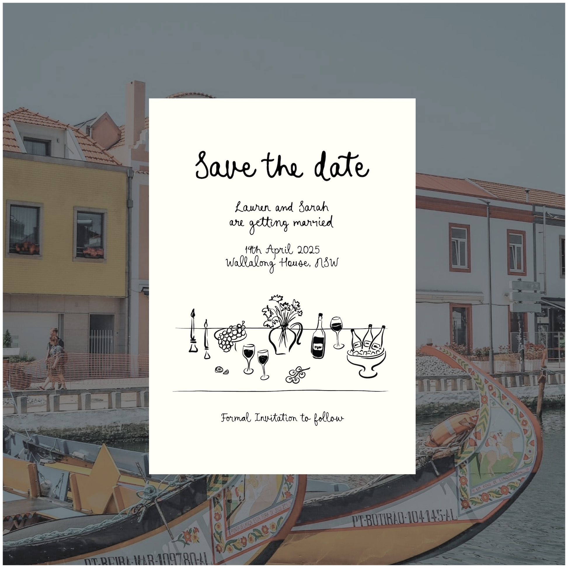 Part of the Portugal Collection, this save the date wedding invite is a fun modern piece with handwritten fonts and playful dinner table illustrations.