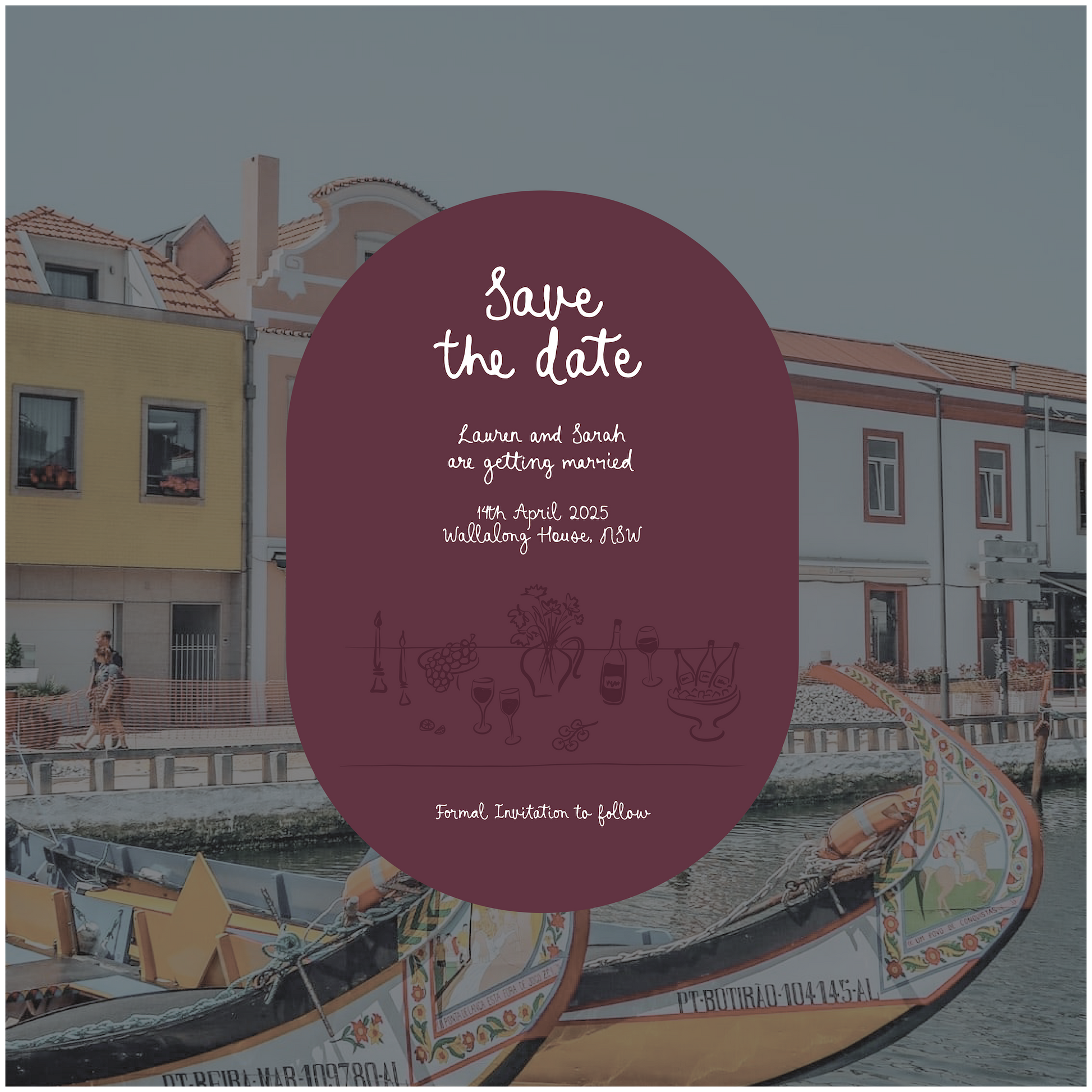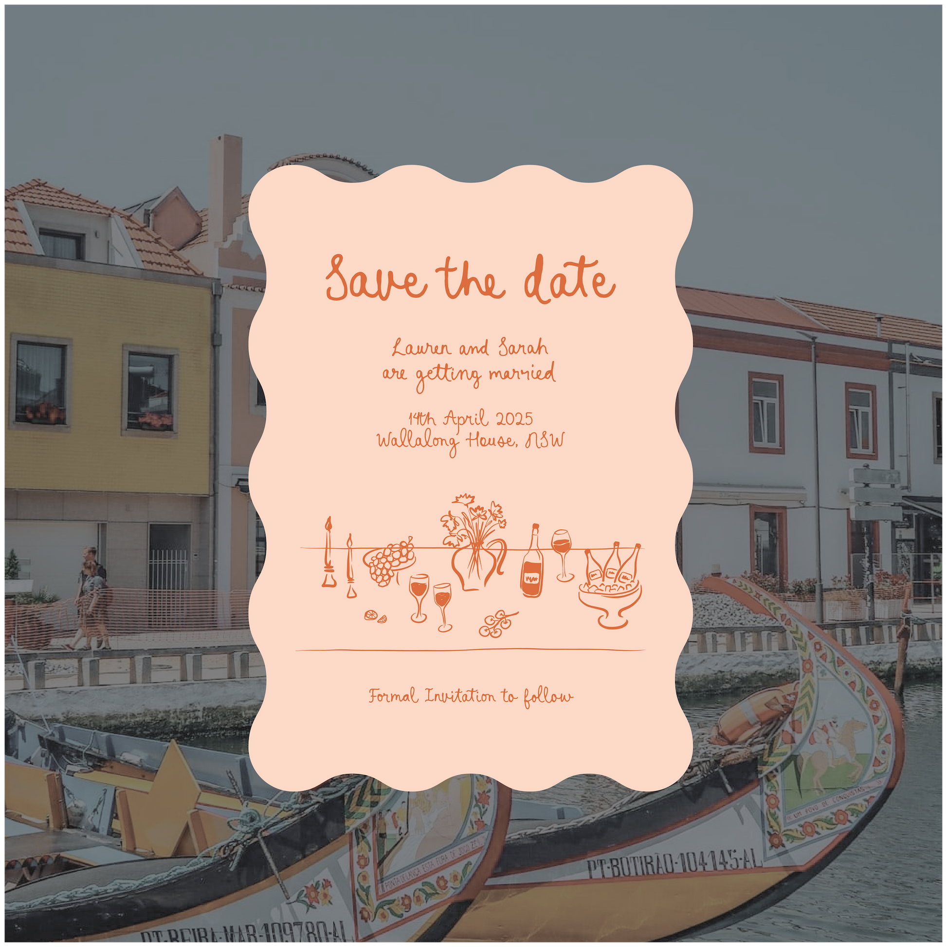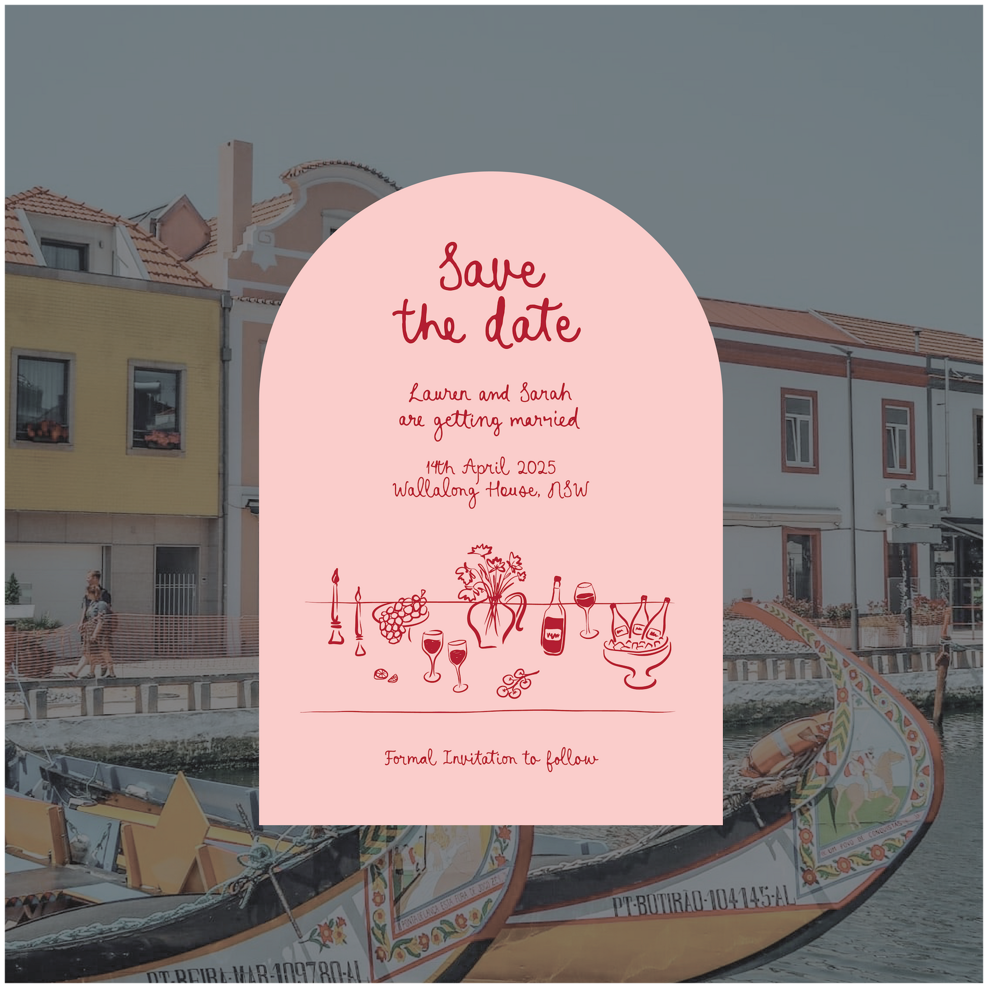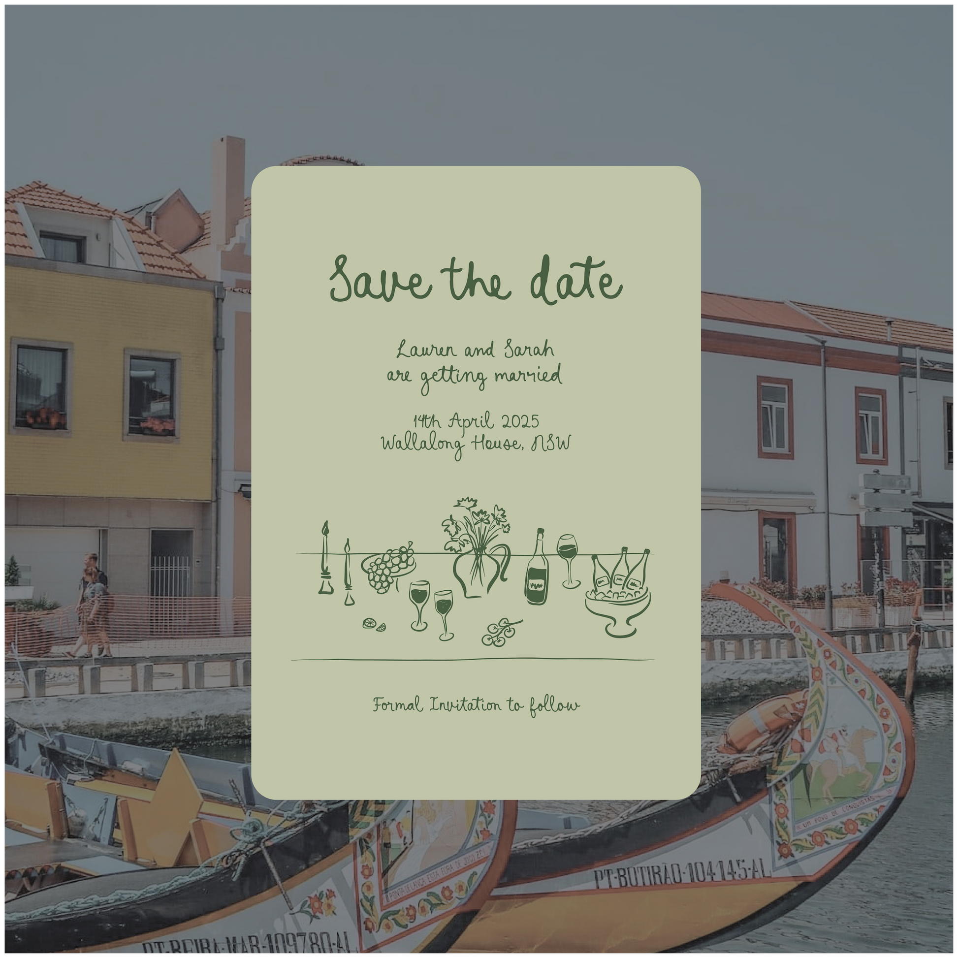 Part of the Portugal Collection, this save the date wedding invite is a fun modern piece with handwritten fonts and playful dinner table illustrations.