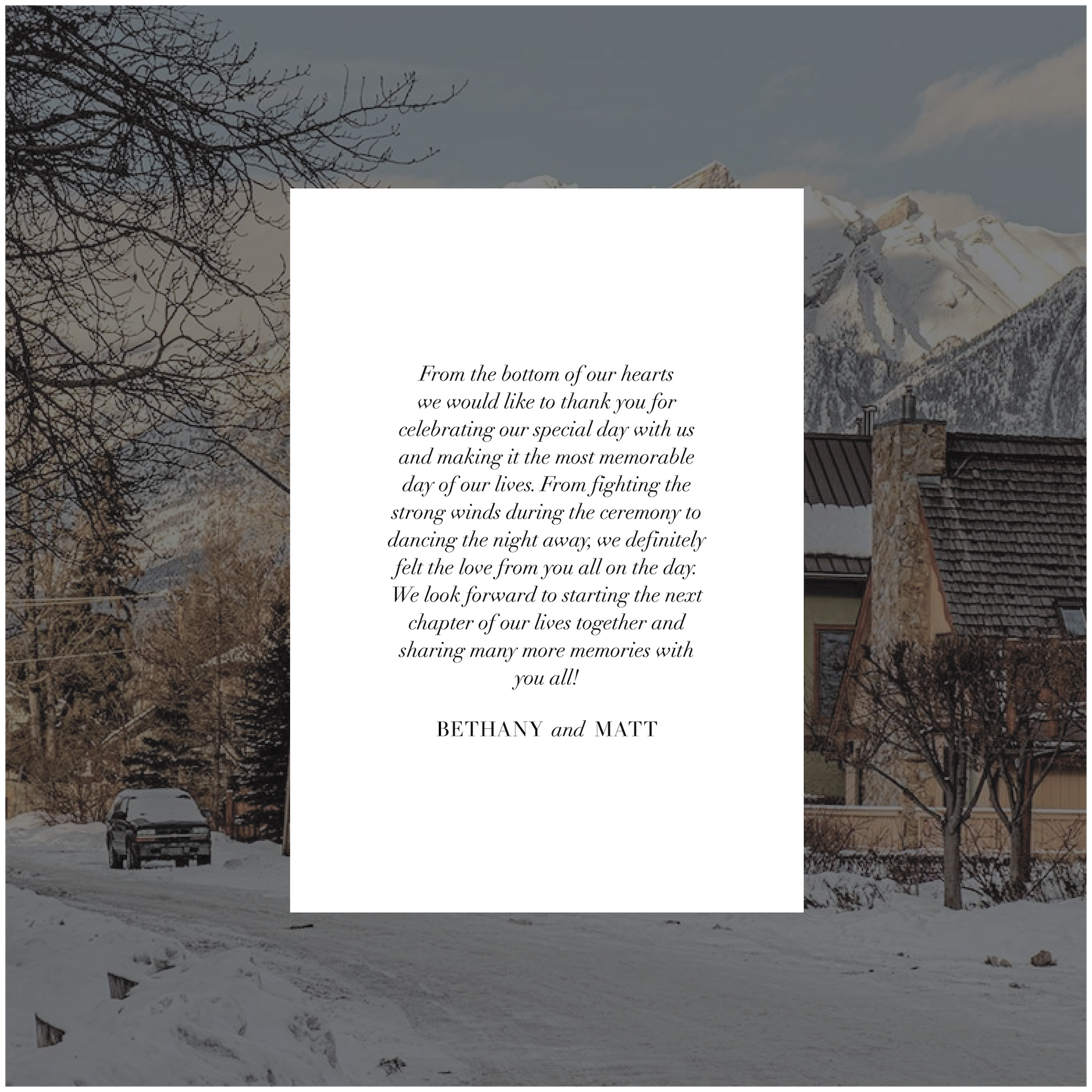Part of the Canada Collection, this digital thank you card is modern chic with simple structured text details making it the perfect piece to send to your guests as a final thank you for being apart of your epic celebration.