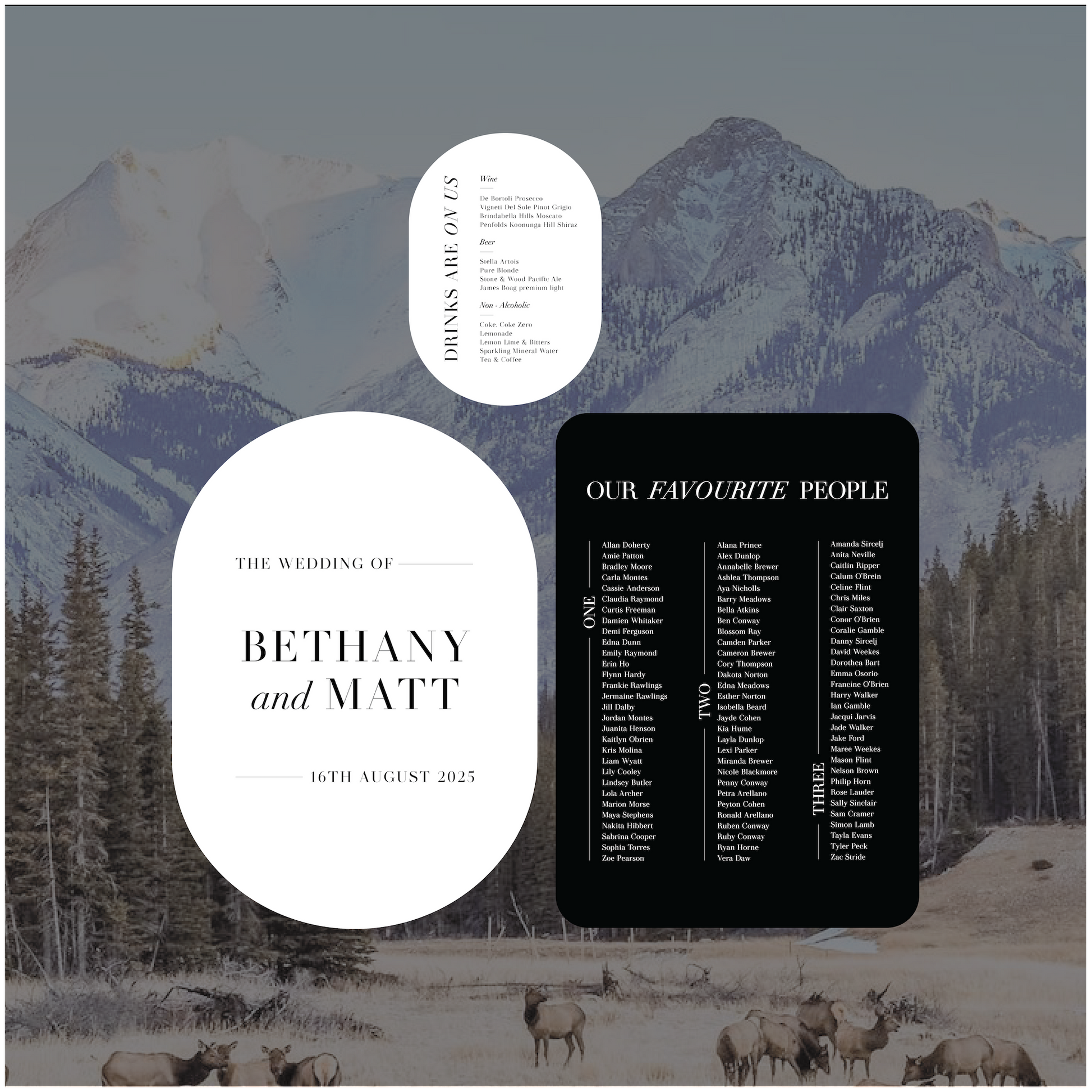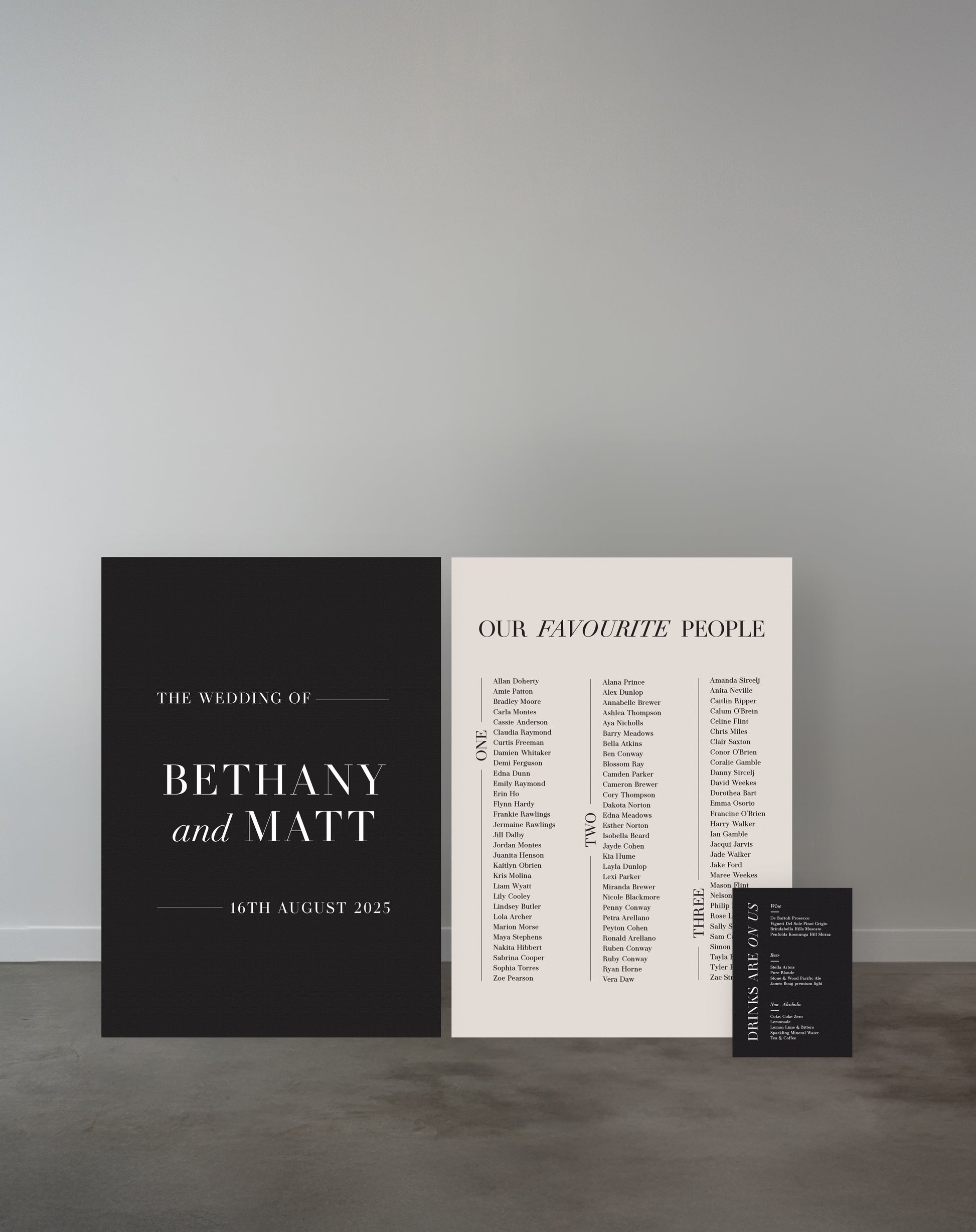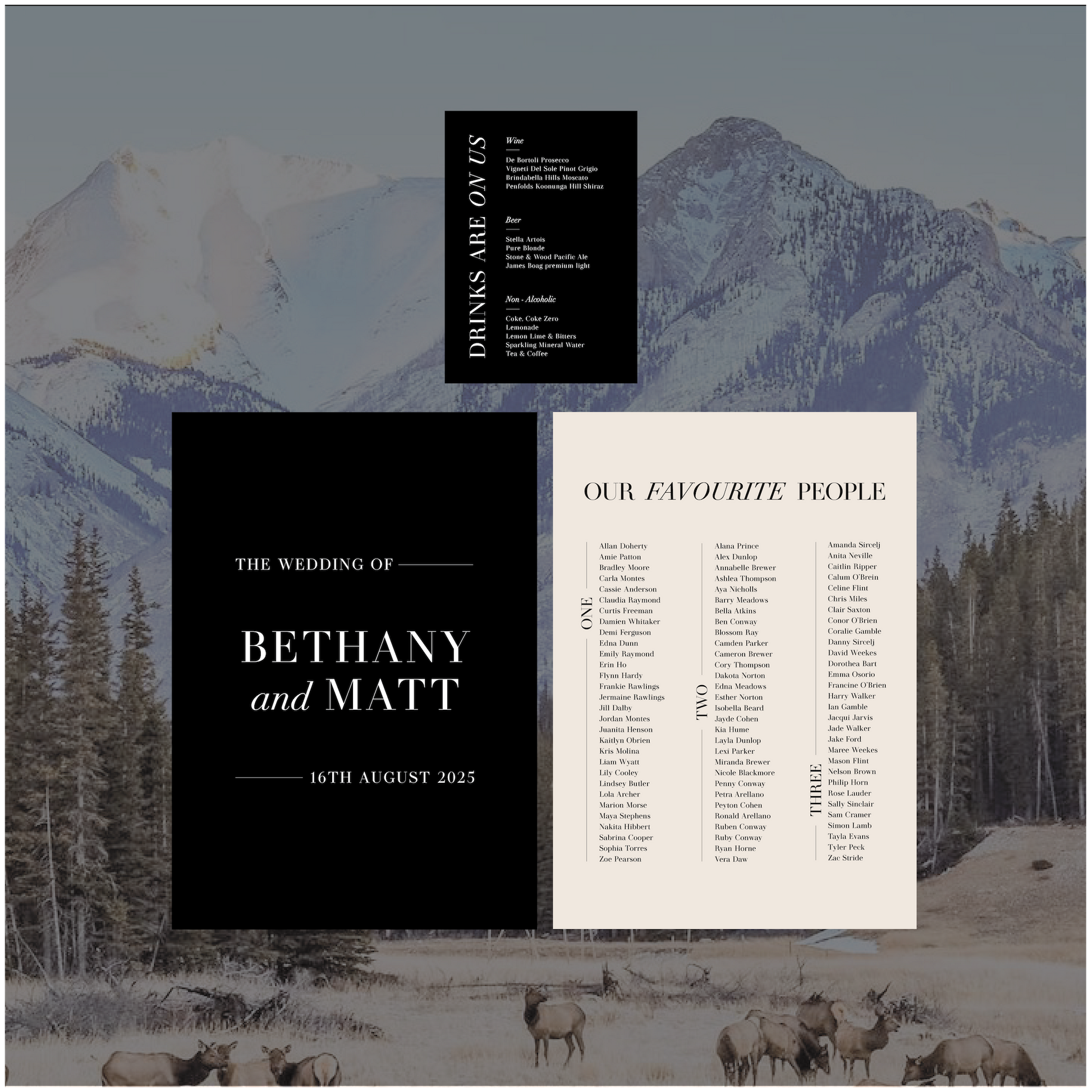 This Canada wedding welcome, seating chart and bar signage package is modern chic with structured text that directs the eye along the signs.