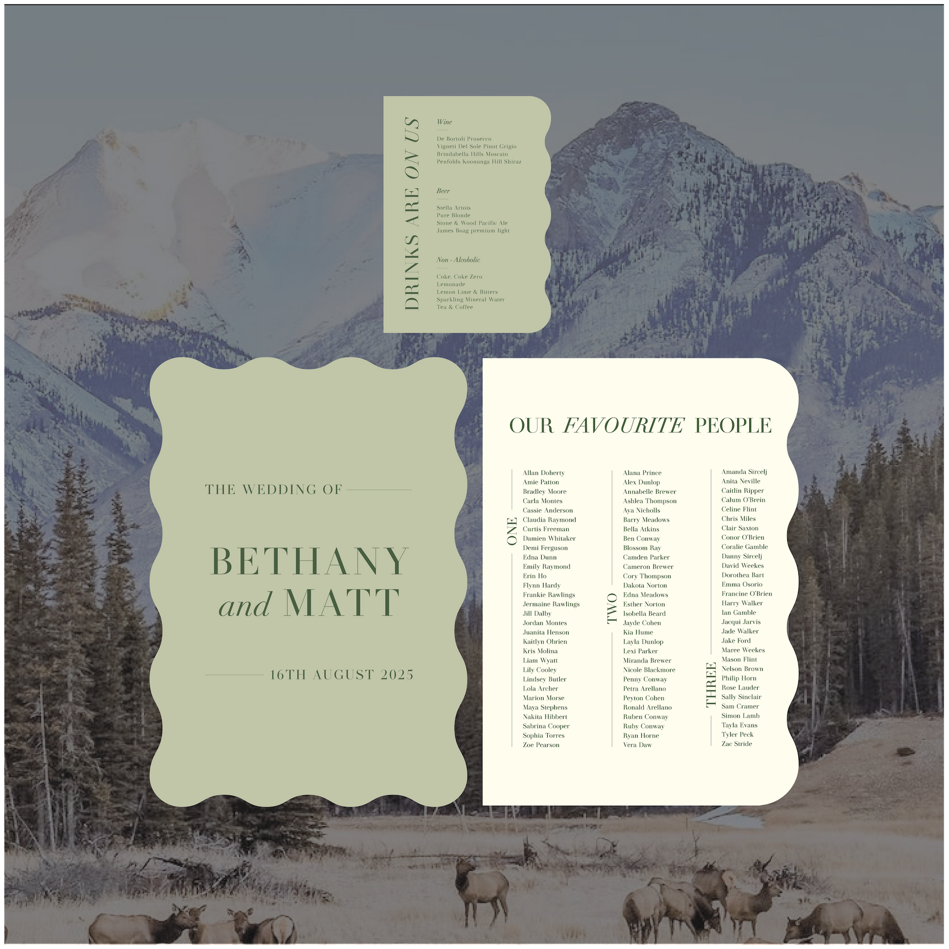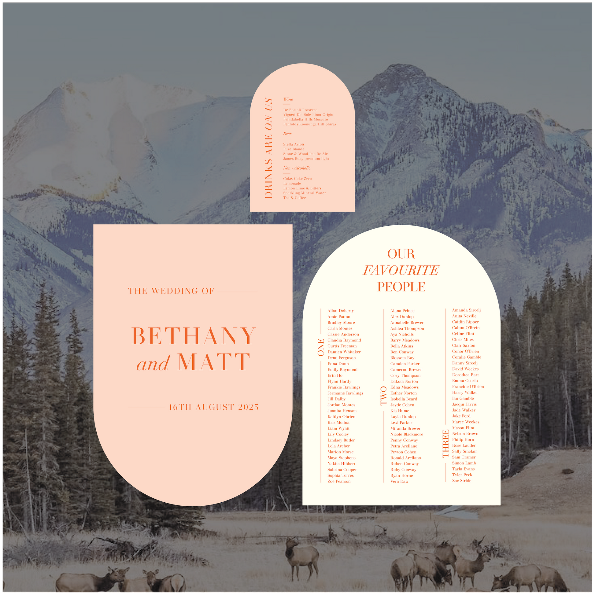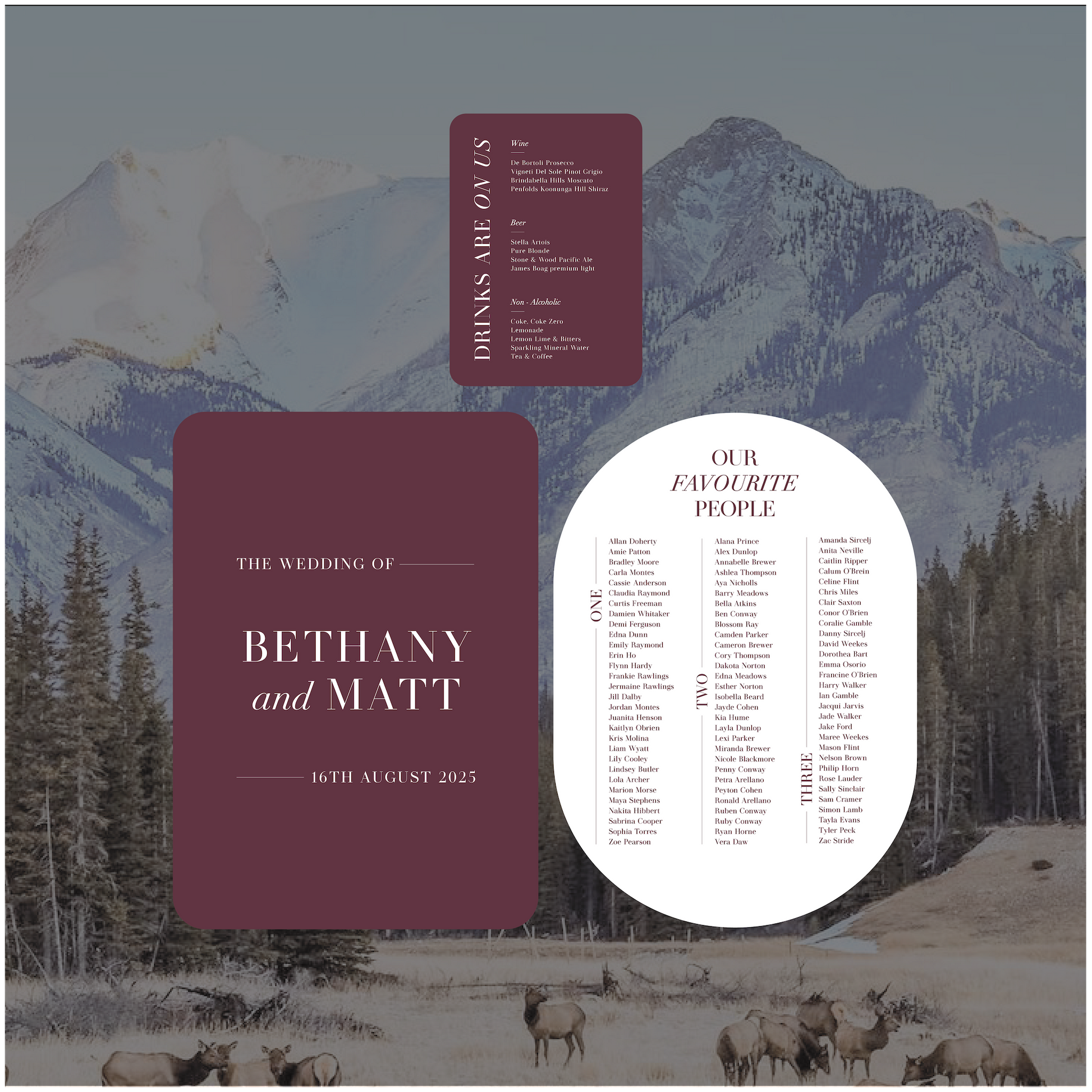 This Canada wedding welcome, seating chart and bar signage package is modern chic with structured text that directs the eye along the signs.