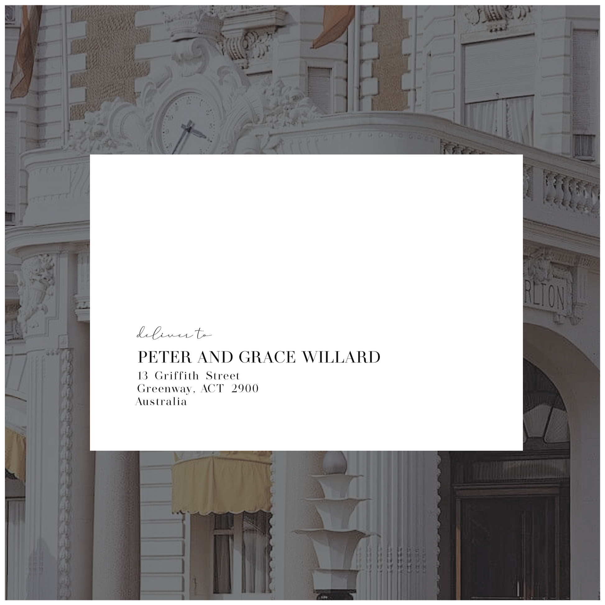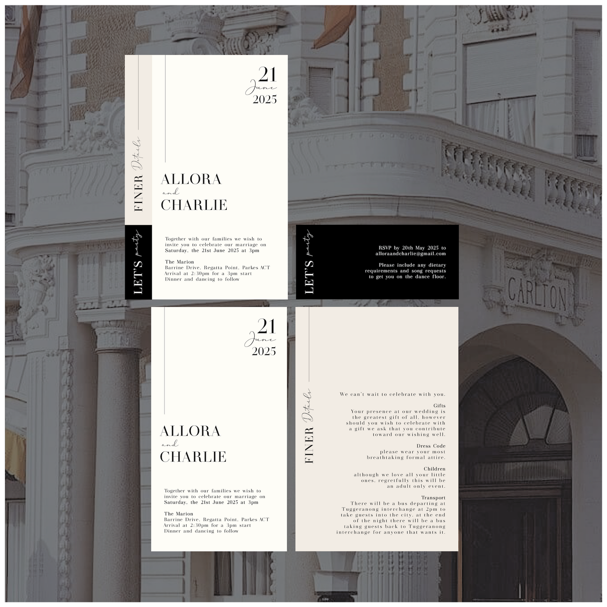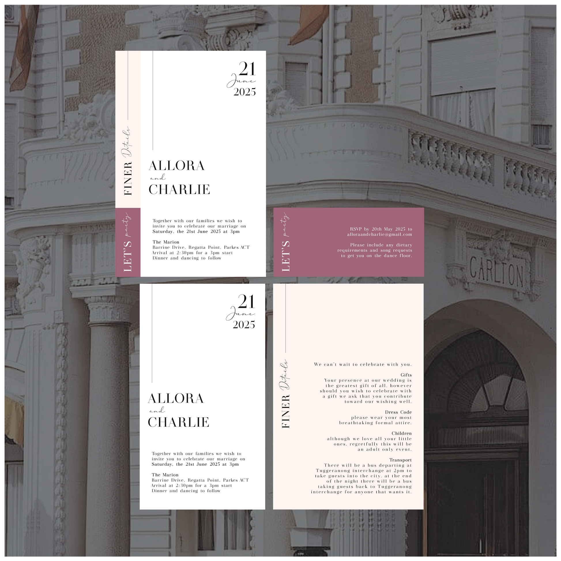 Part of the France Collection, this stacked wedding invite is classic with a little bit of chic editorial edge. Layers of information stacked together using sharp lines and contrasting colours.