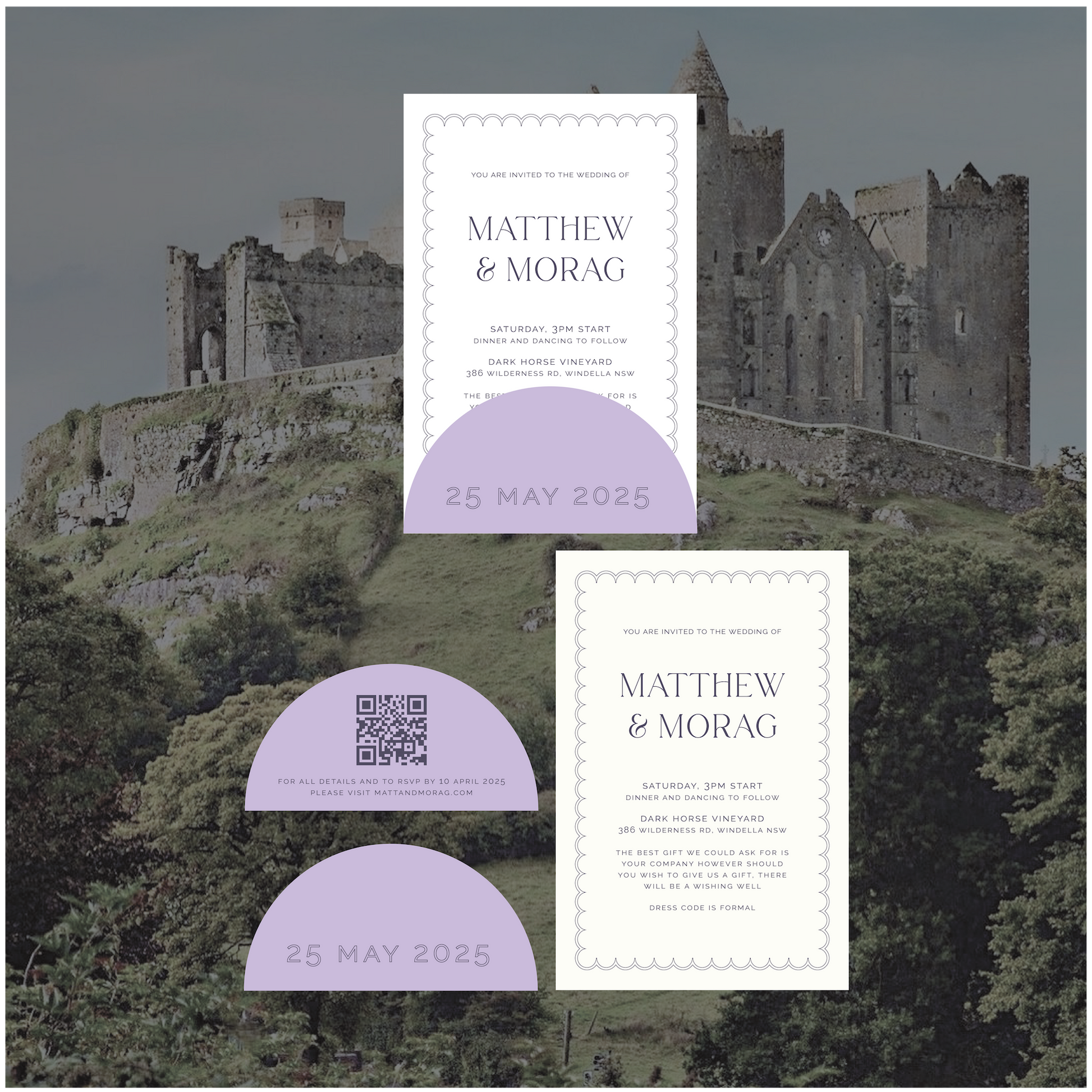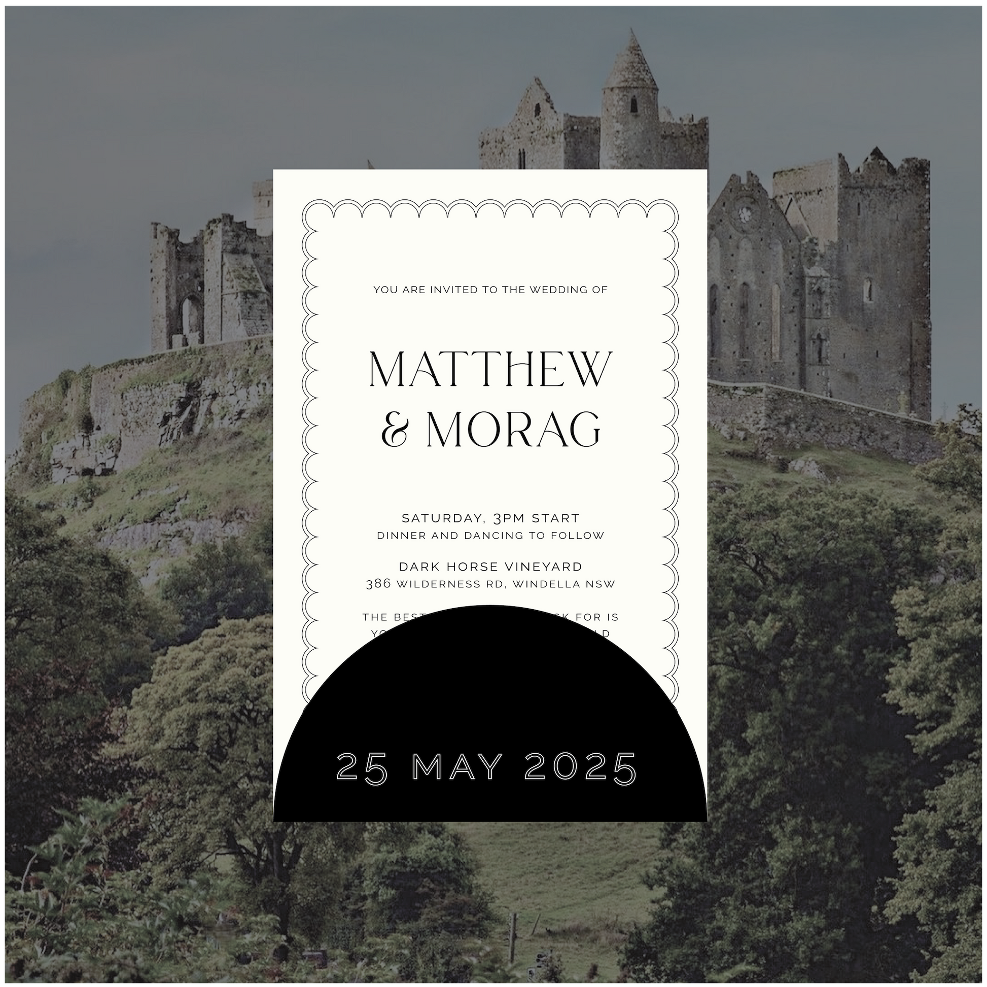 Part of the Ireland Collection, this stacked wedding invite is a timeless classic with a little bit of edge. Featuring a scalloped border to mimic a four leaf clover curved shape with matching outlined font details.