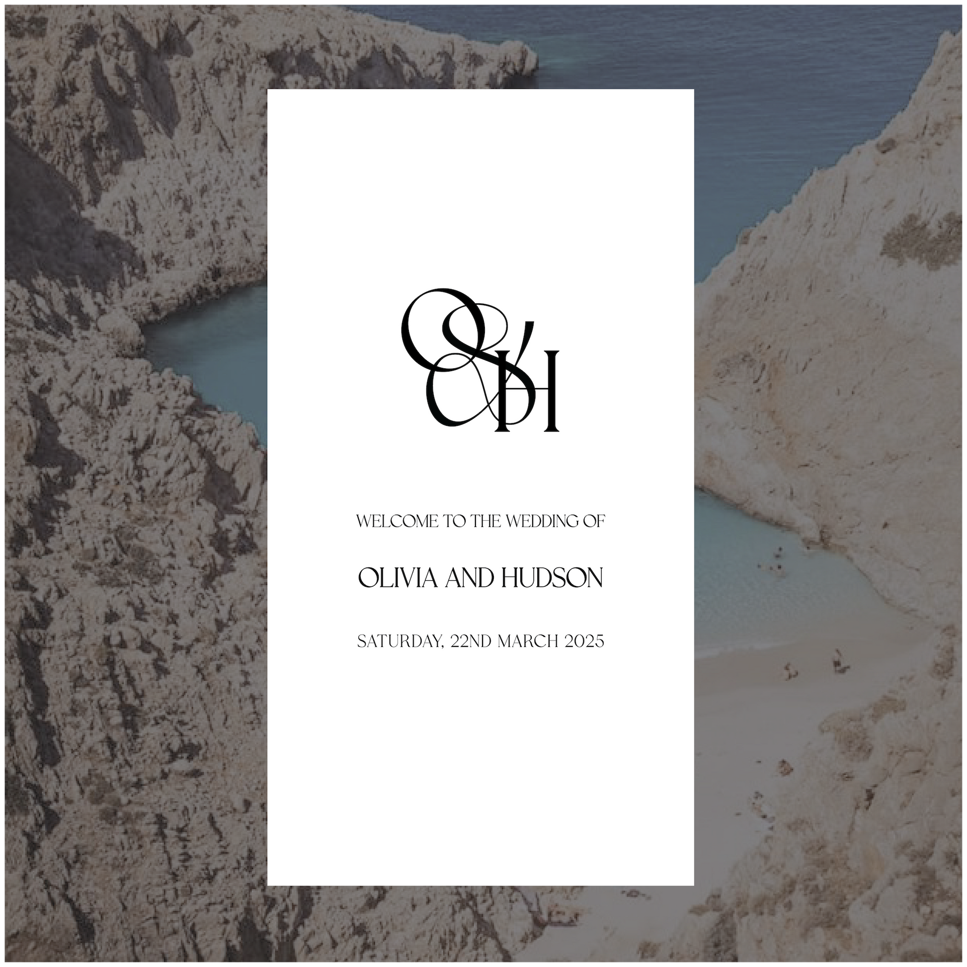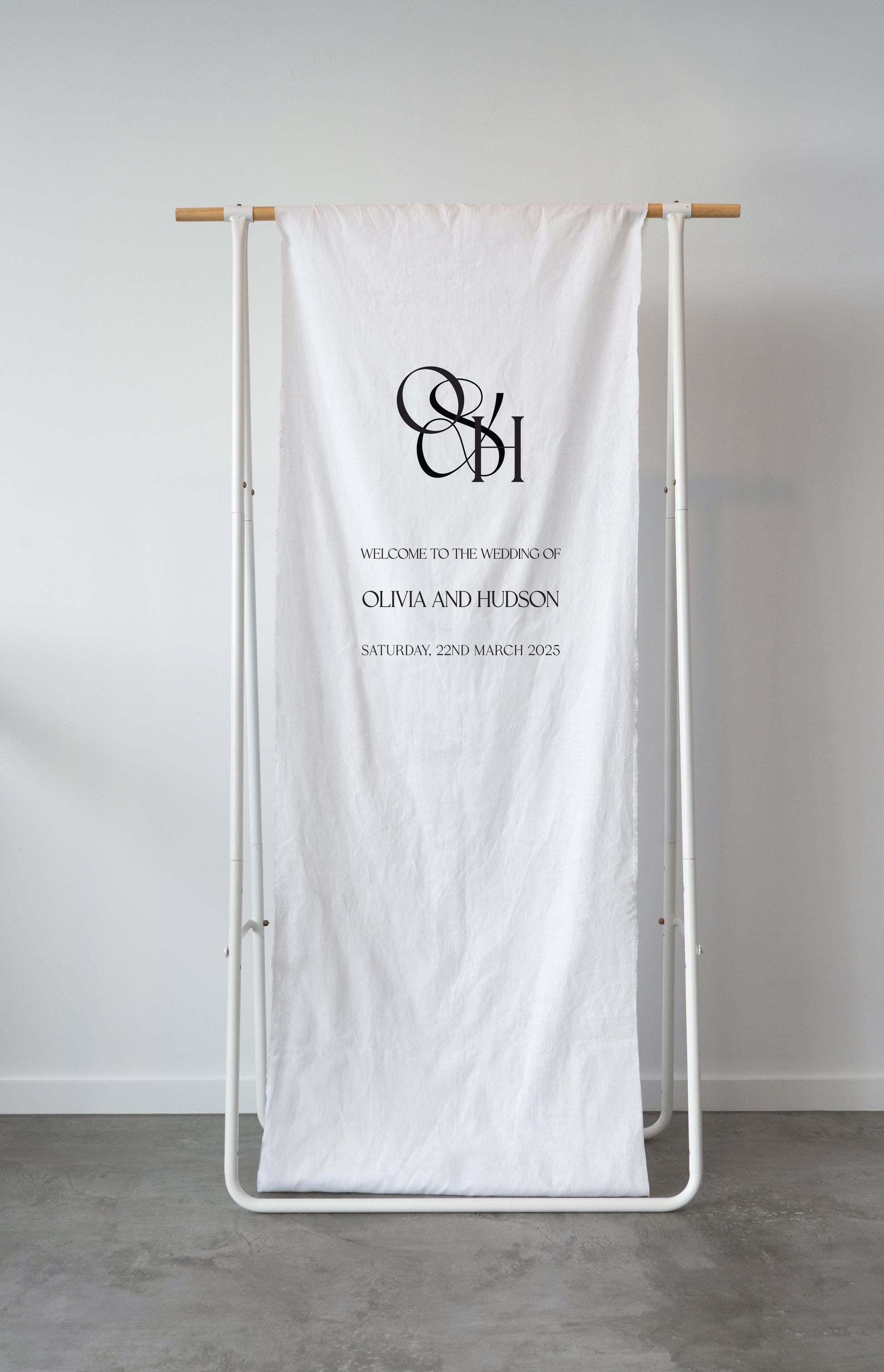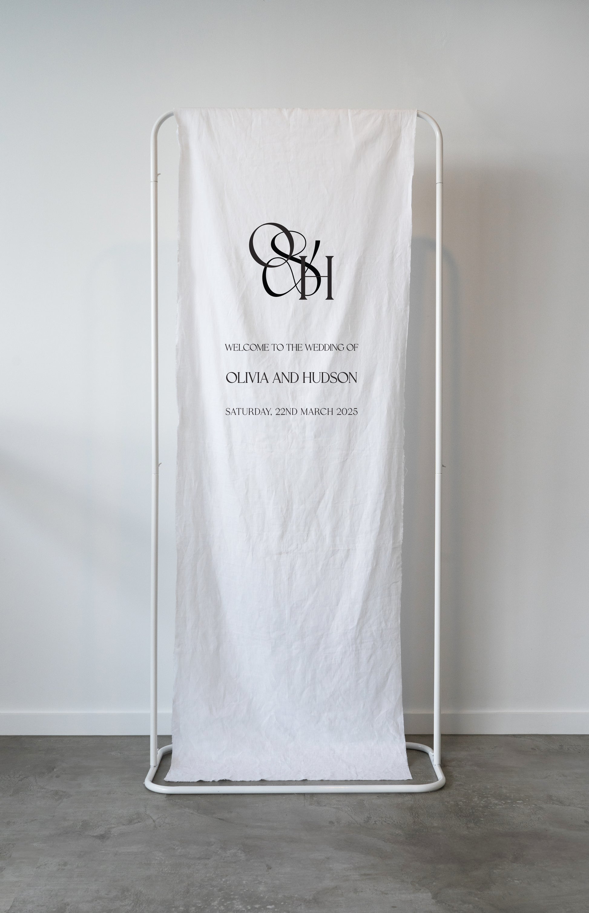 Part of the Greece Collection, this wedding linen sign is modern yet will stand the test of time with flowing text elements and a feature & symbol.