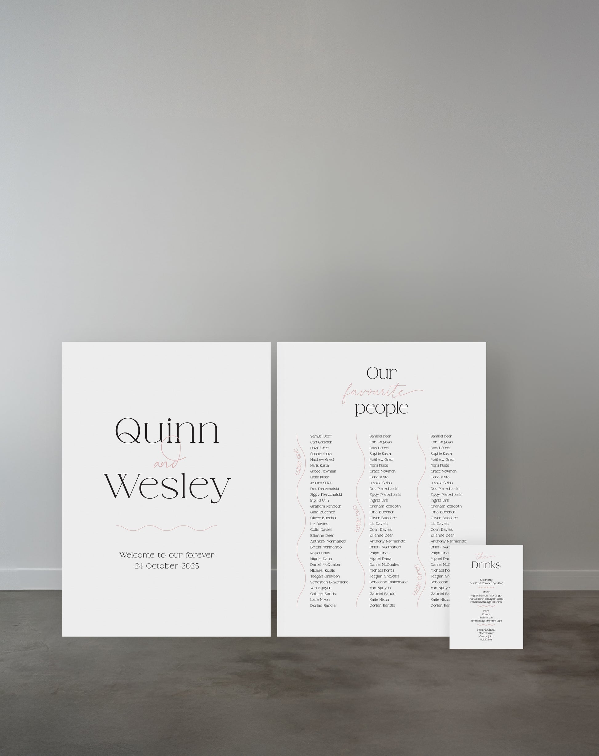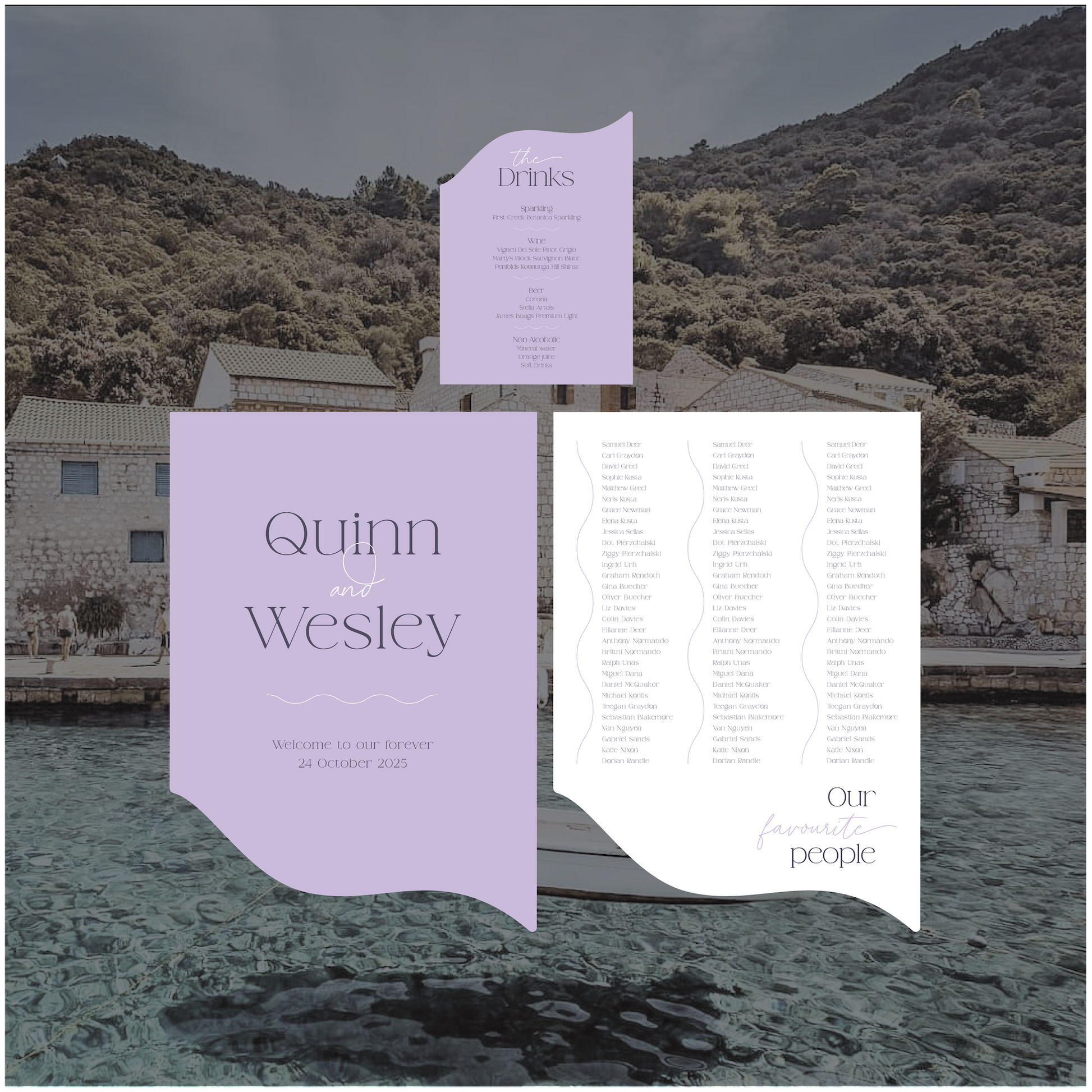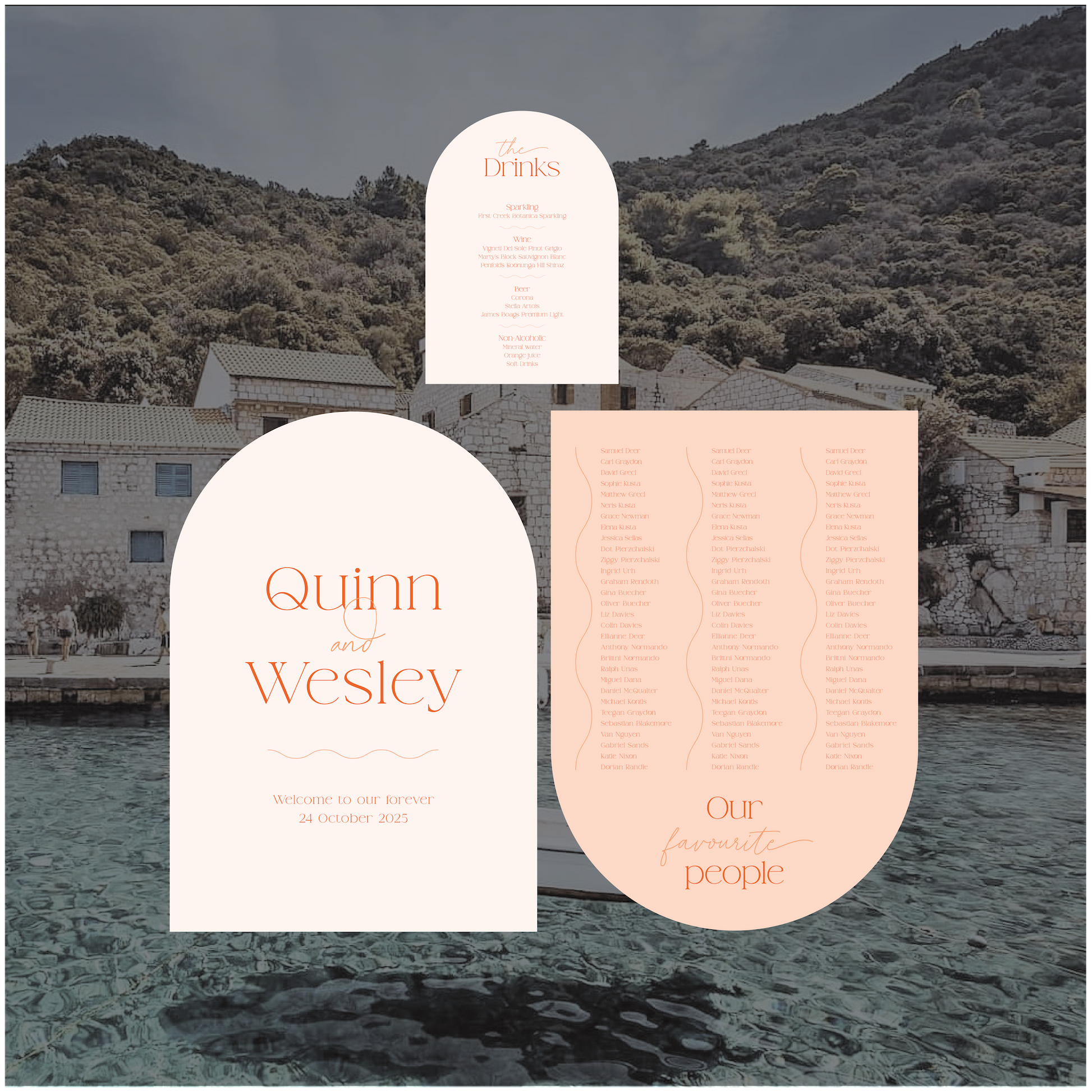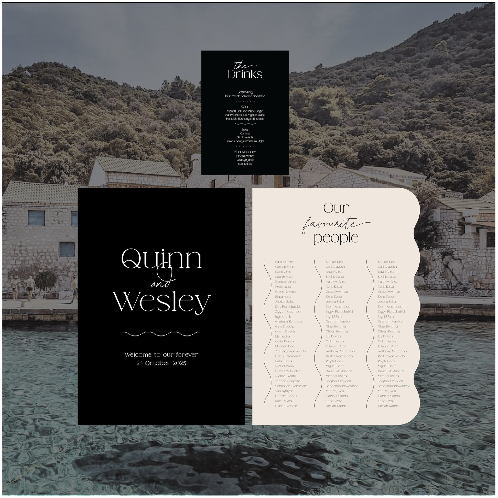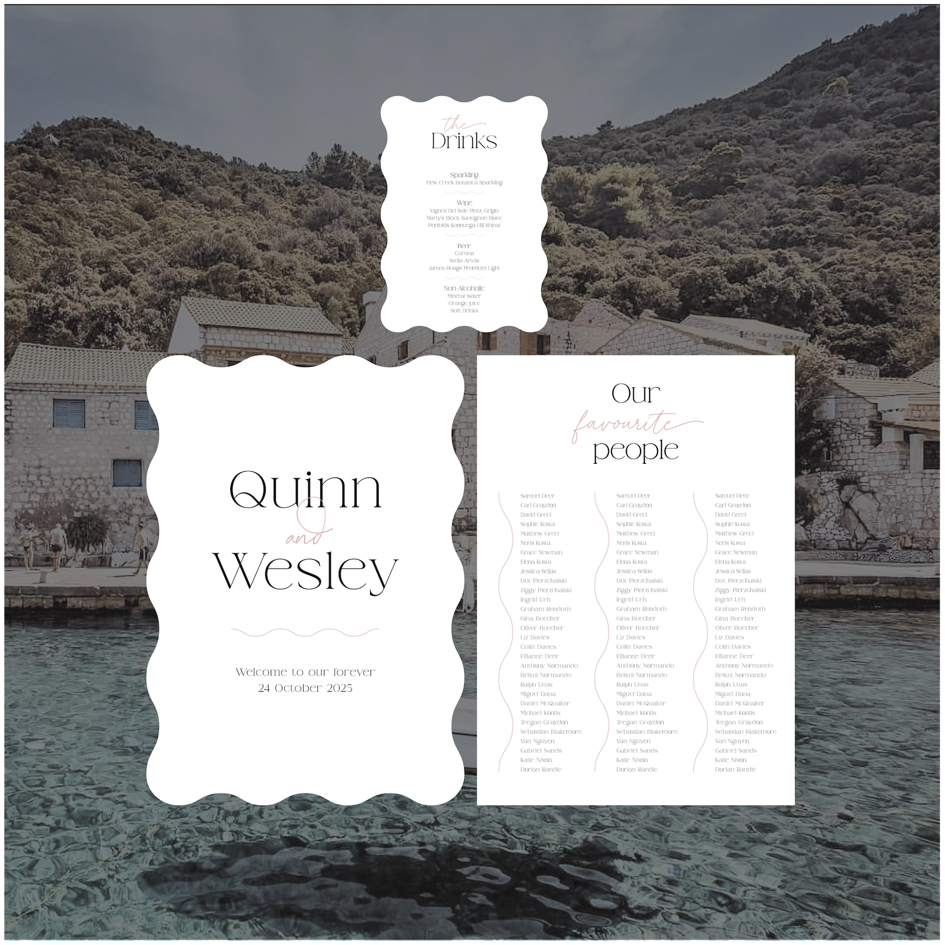 This Croatia wedding welcome, seating chart and bar signage package is modern, romantic and a little bit fun with it's script elements and wave lines.