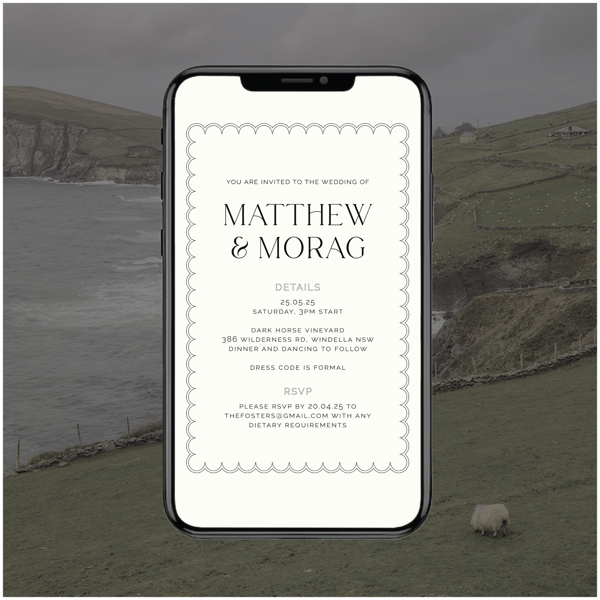 Part of the Ireland Collection, this single invite is a timeless classic with a little bit of edge. Featuring a scalloped border to mimic a four leaf clover curved shape with matching outlined font details.