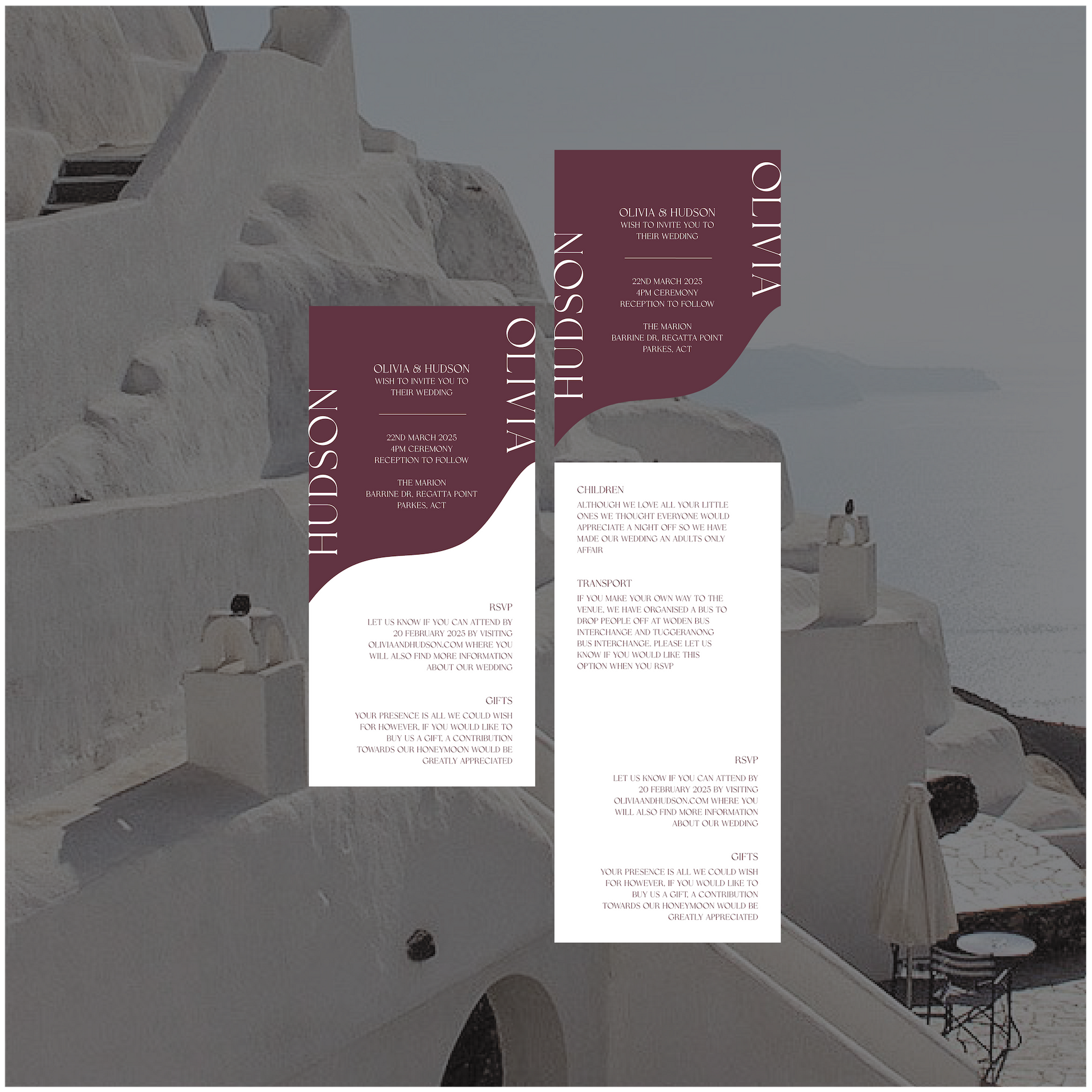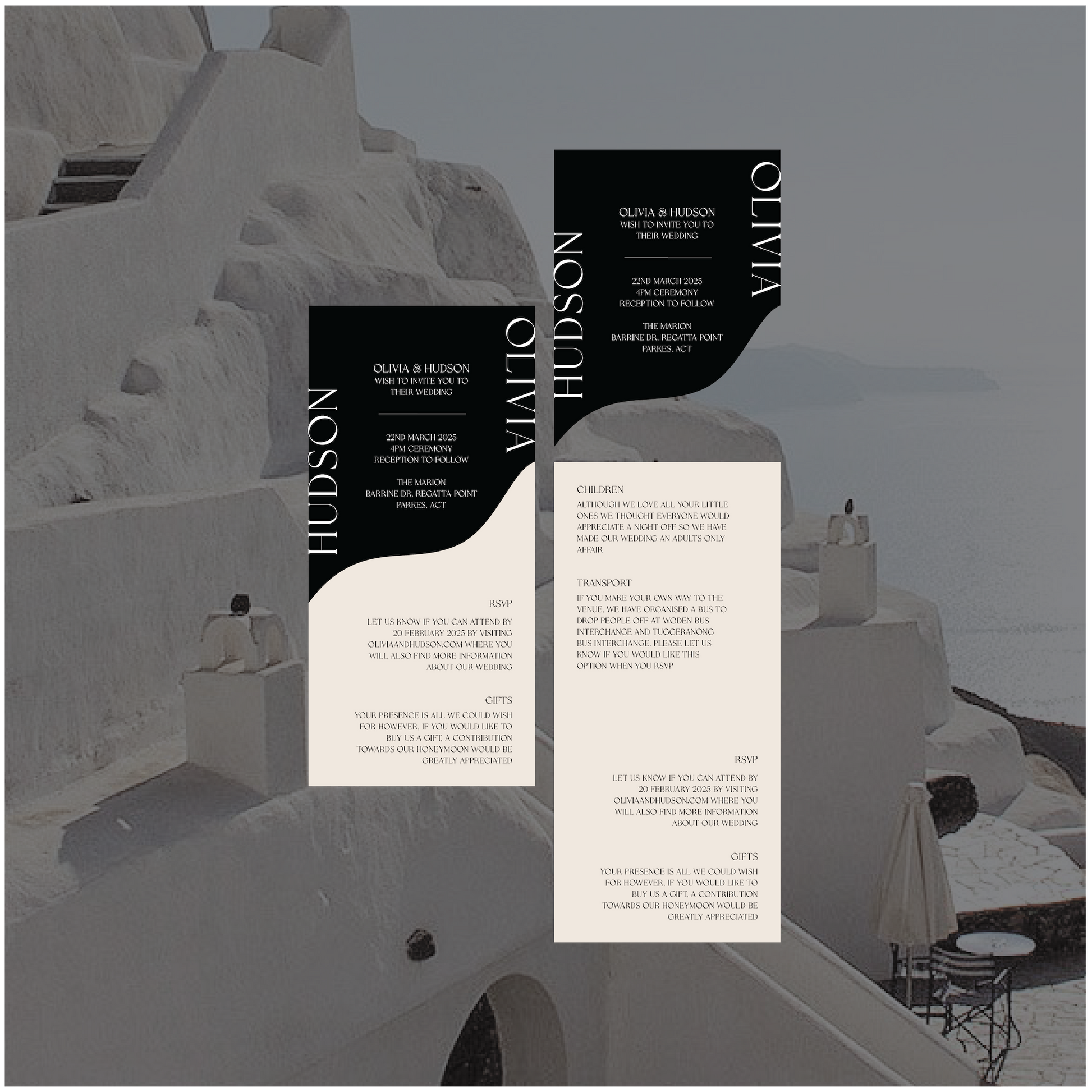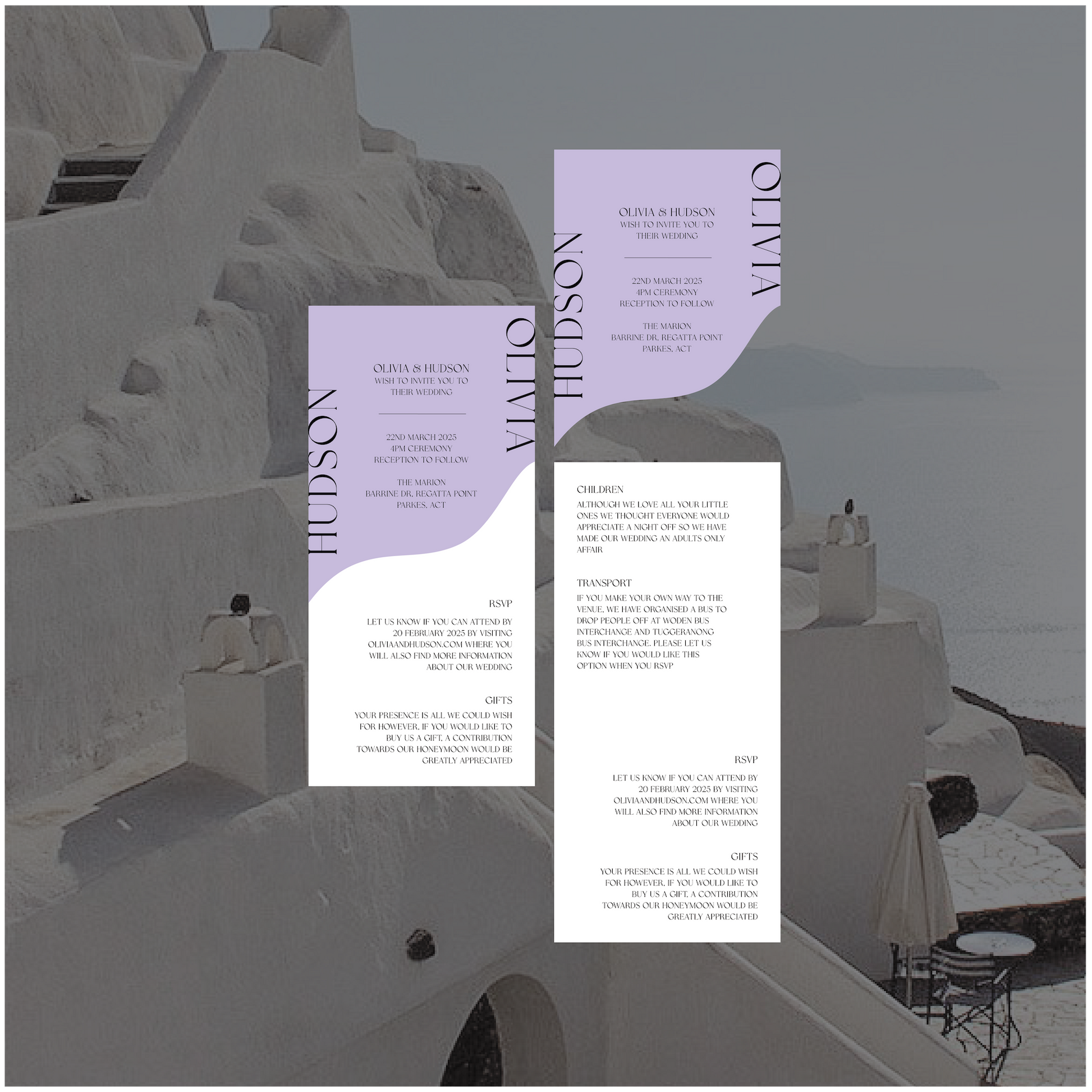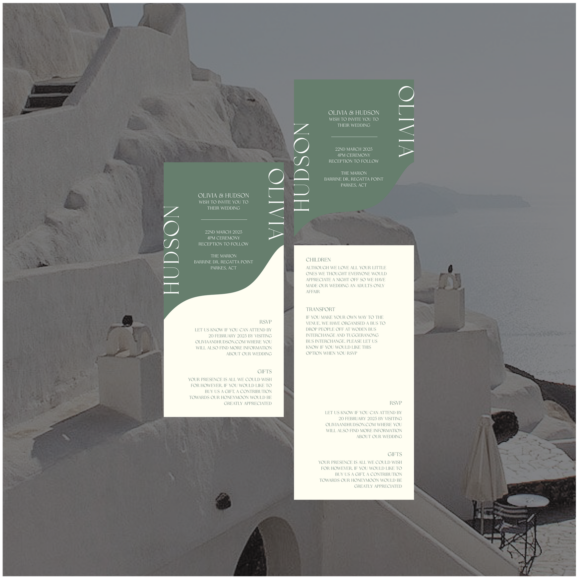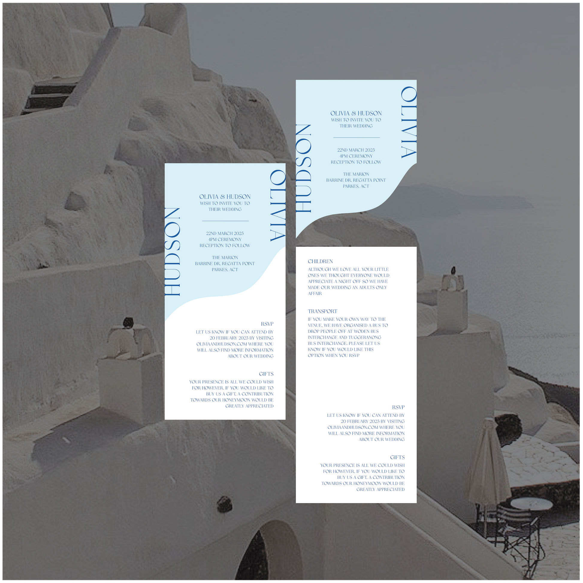 Part of the Greece Collection, this stacked wedding invite is made up of a rectangle for the back and our custom wave shape on front that gives a cascading effect down the page.