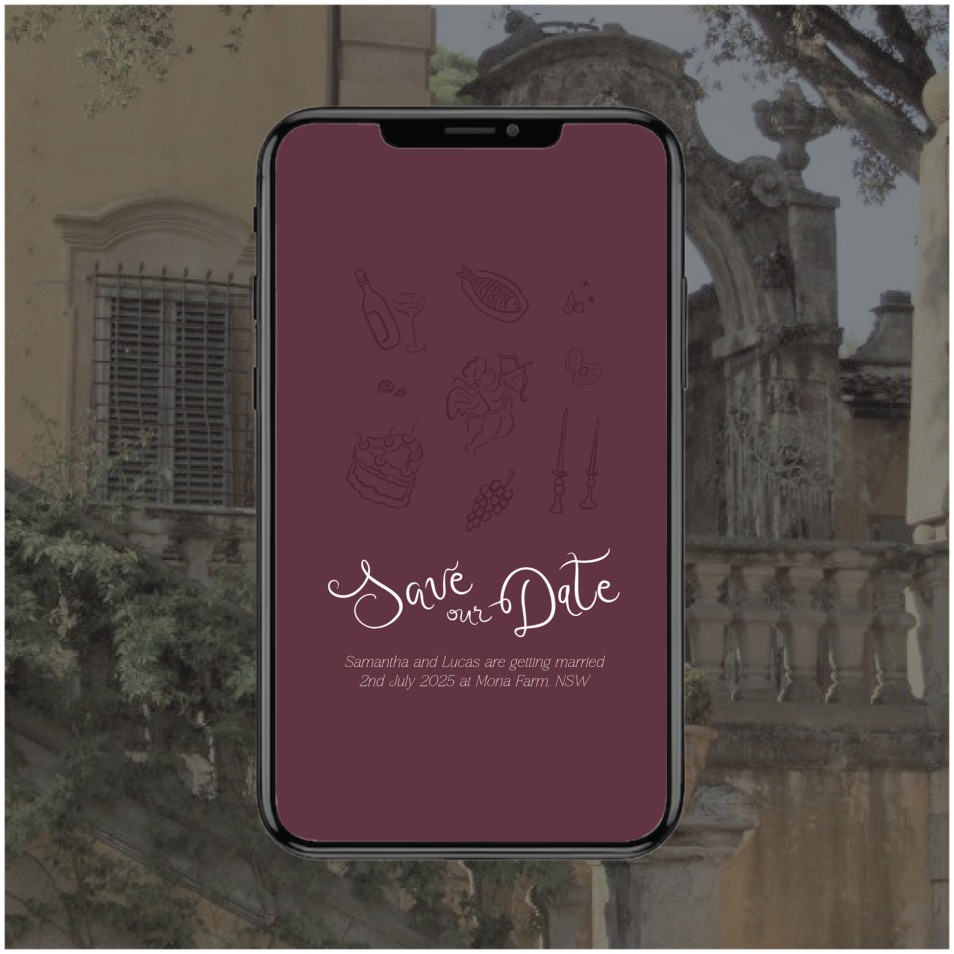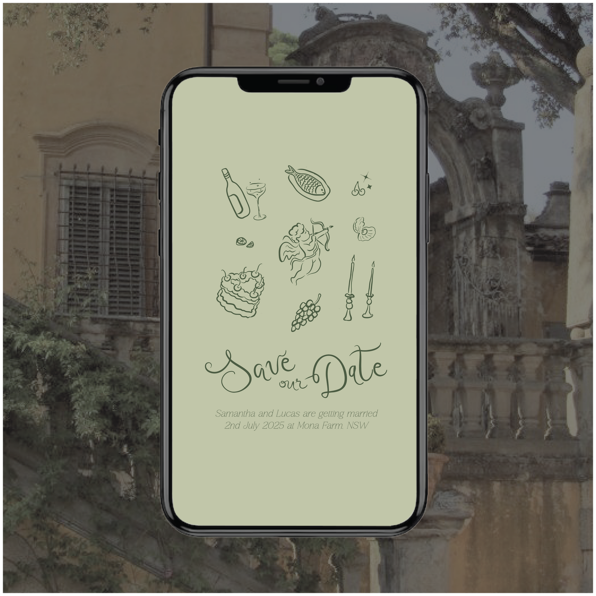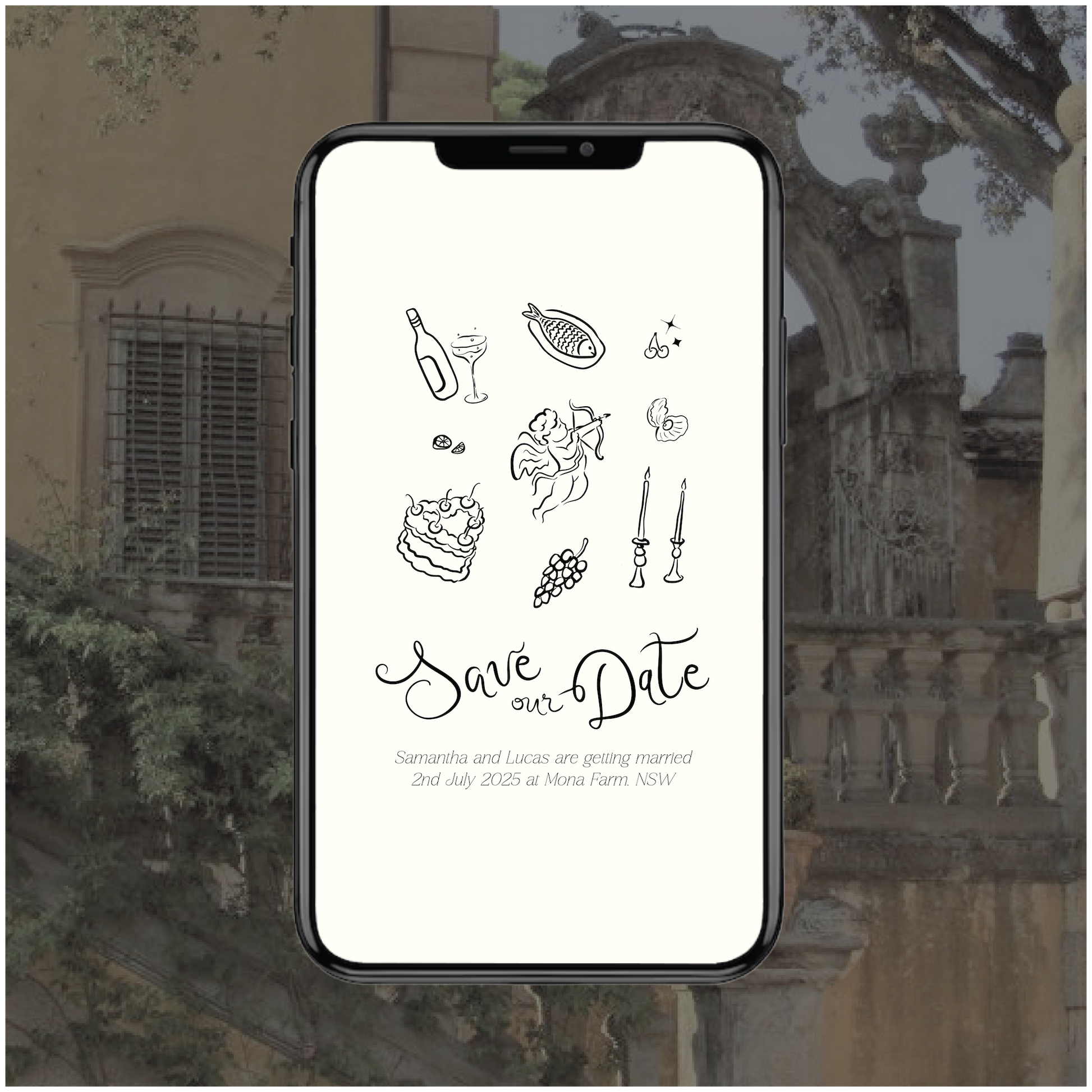Part of the Italy Collection, this digital save the date wedding invite will transport you to Italy with our fun curly font, nestled hand drawn graphics and la dolce vita lifestyle vibes.
