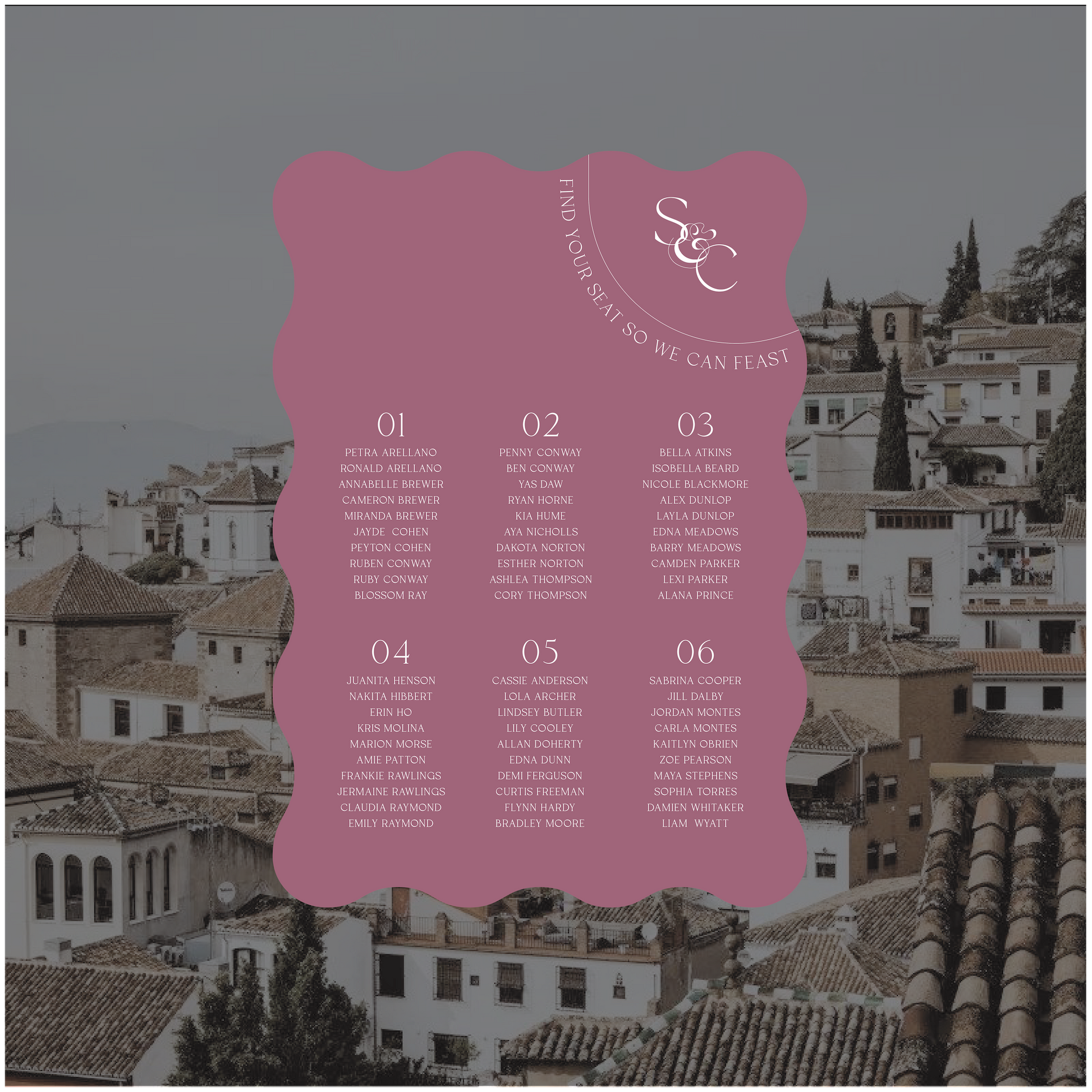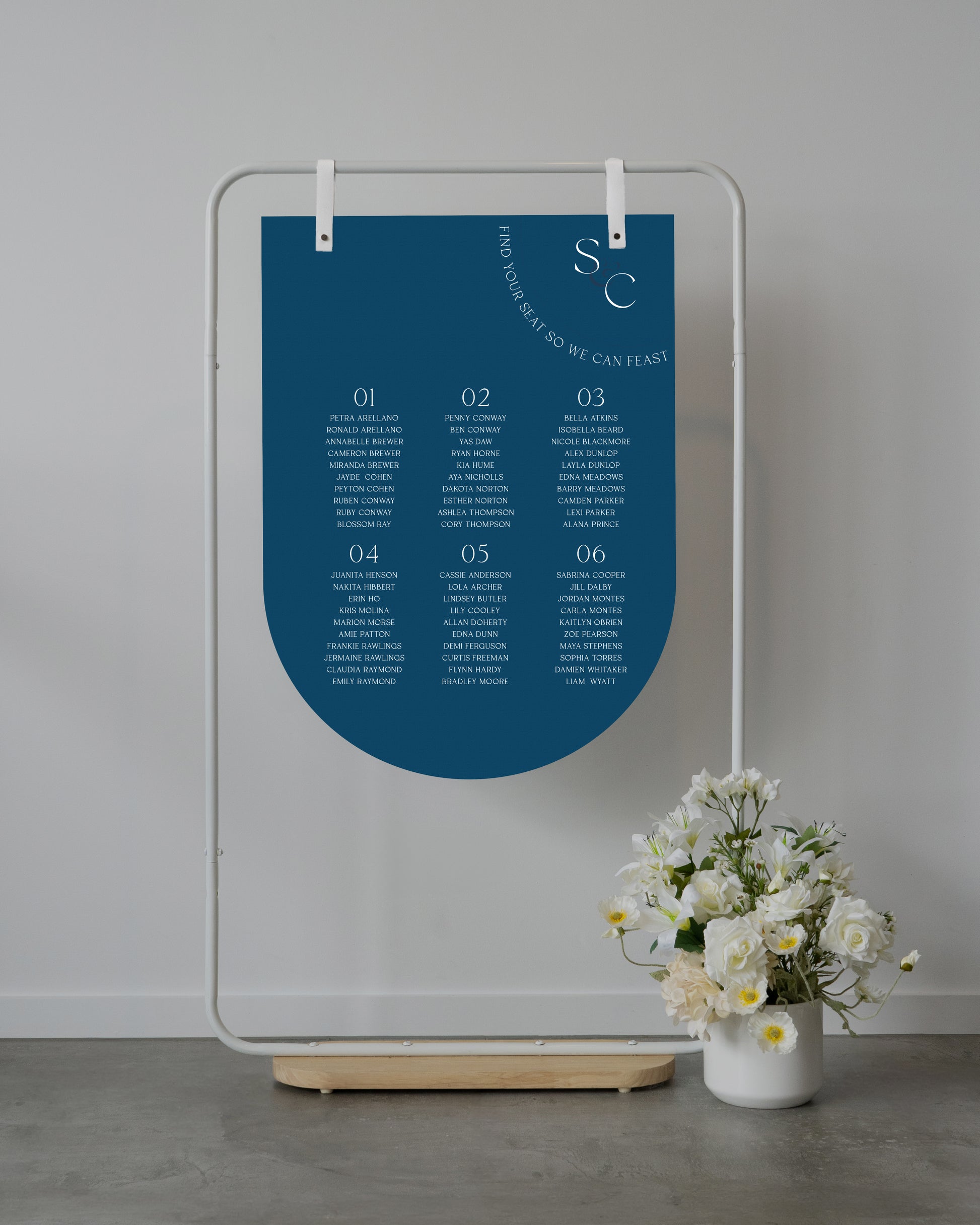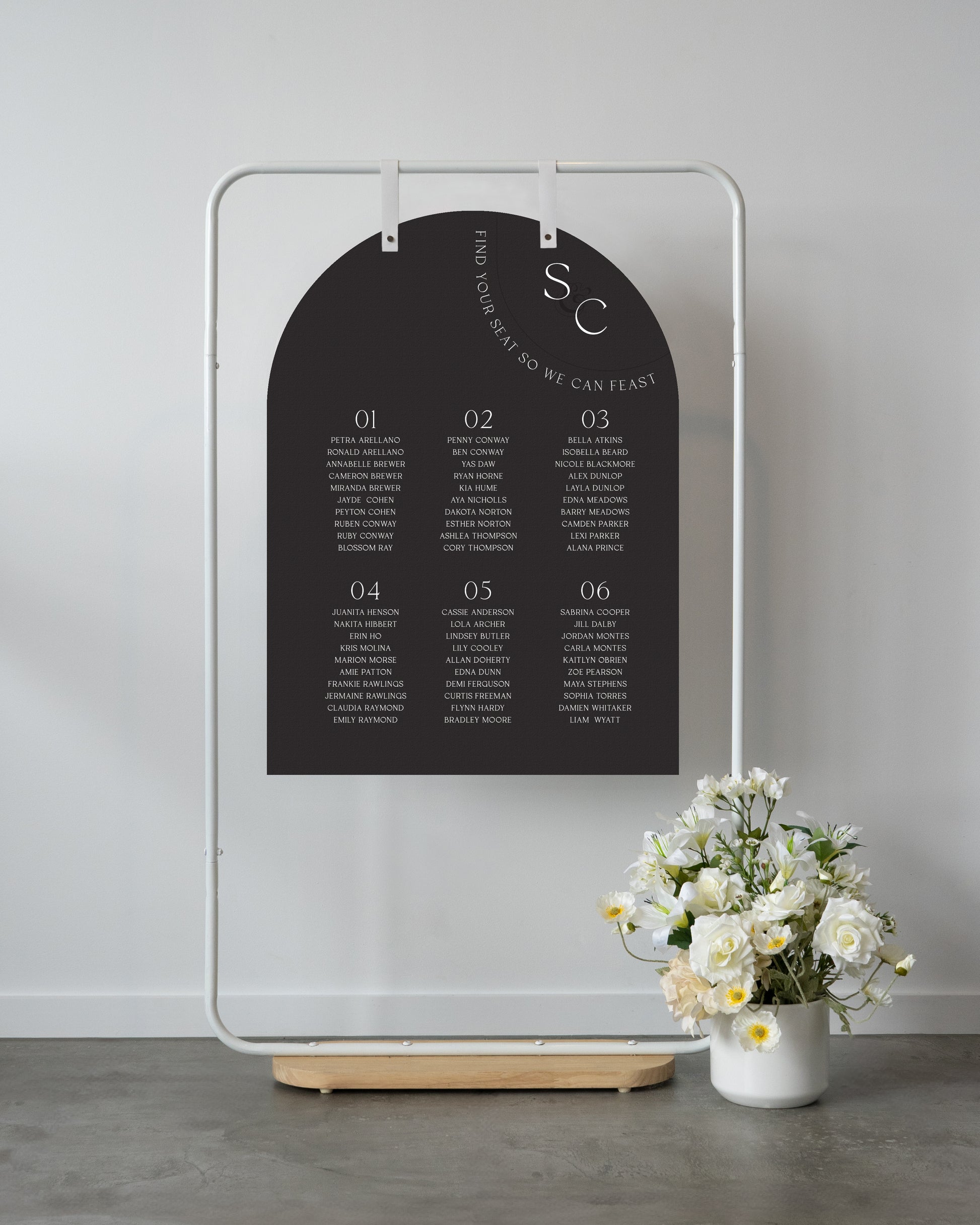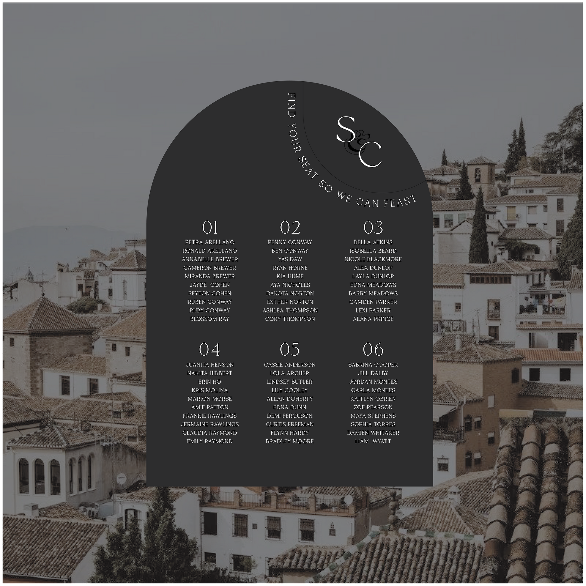 Part of the Spain Collection, this wedding seating chart contains a distinctive arch text featuring fun sayings/quotes.