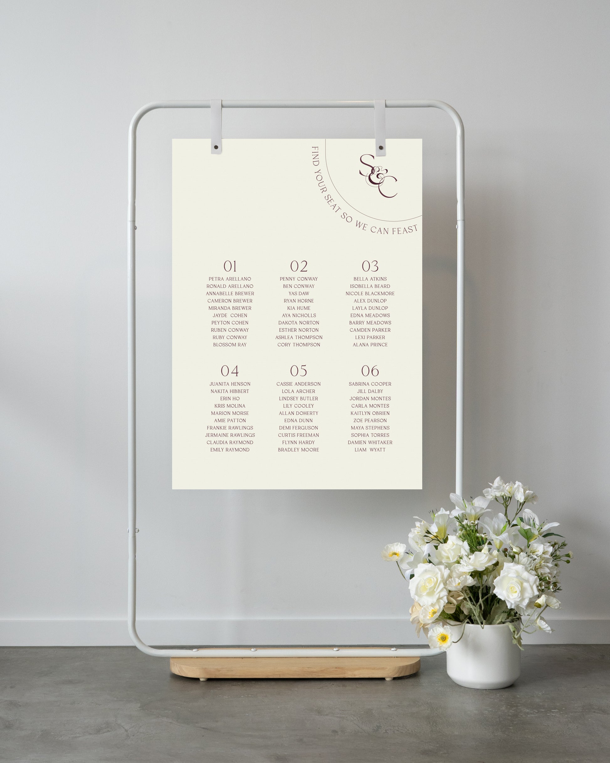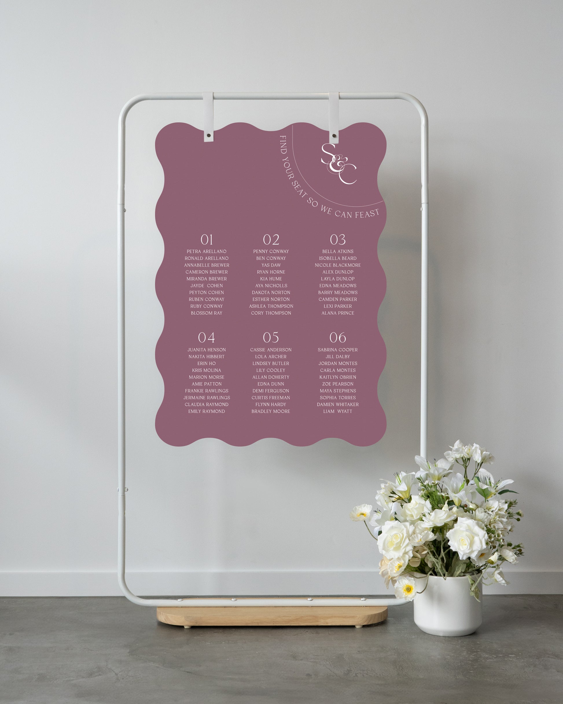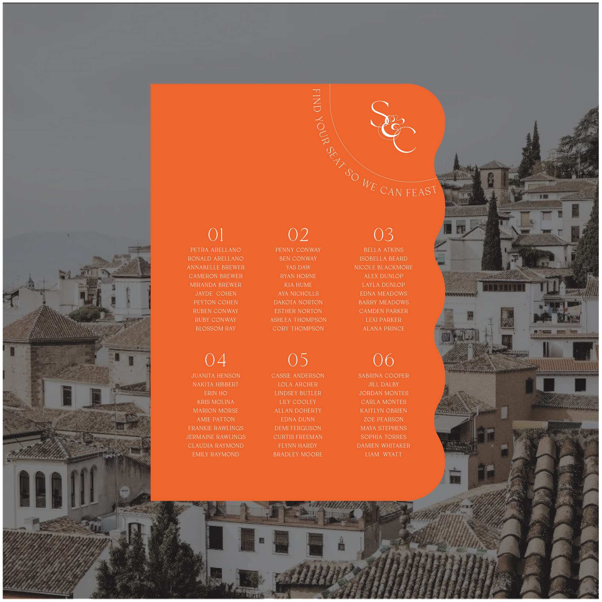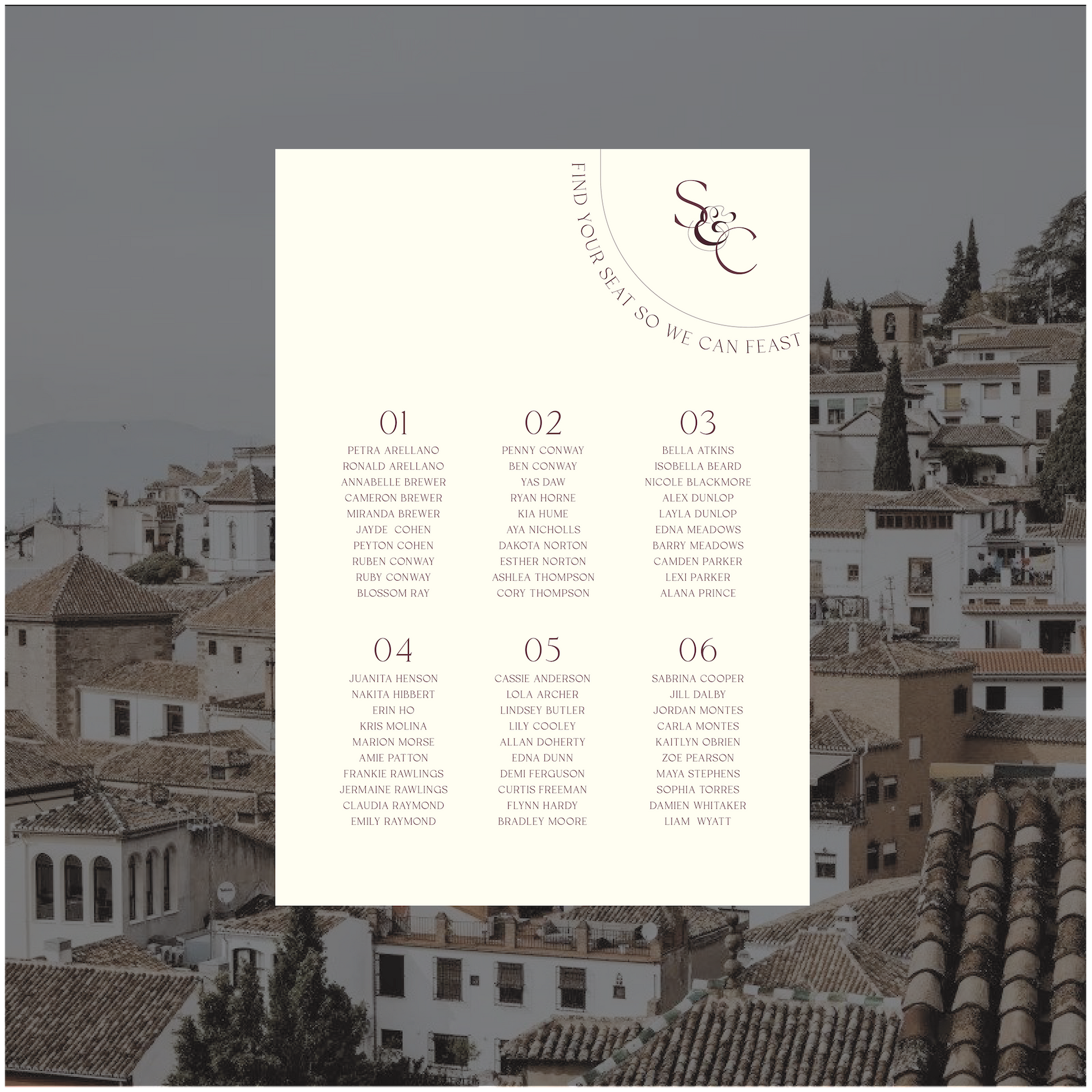 Part of the Spain Collection, this wedding seating chart contains a distinctive arch text featuring fun sayings/quotes.