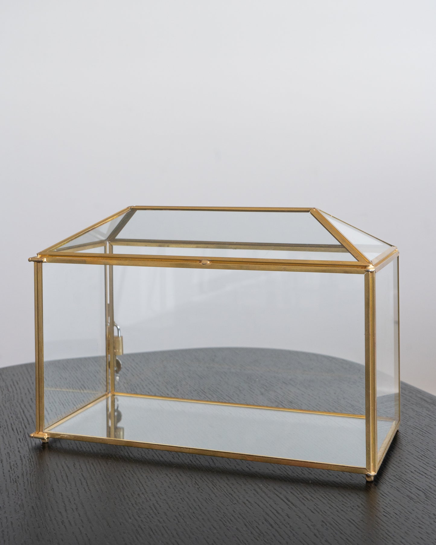 Made of glass and copper this wishing well opens at the side with a lock. Size is 32.5cm wide x 22cm high x 15cm deep, Card slot measures 18.5 x 1cm.