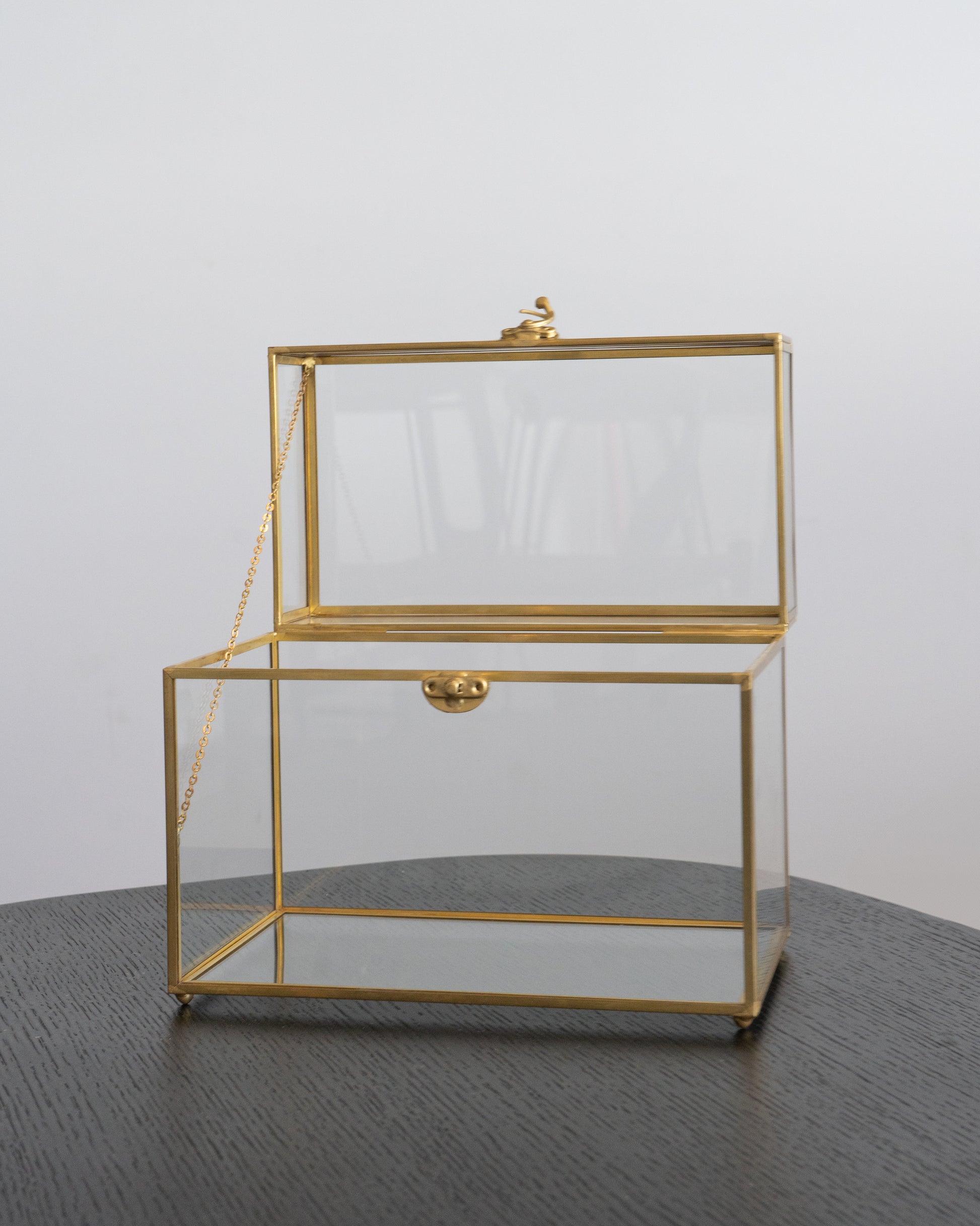 Made of glass and copper this wishing well opens at the top with a clasp with no card slot or lock. Size is 25cm wide x 19cm high x 14cm deep.