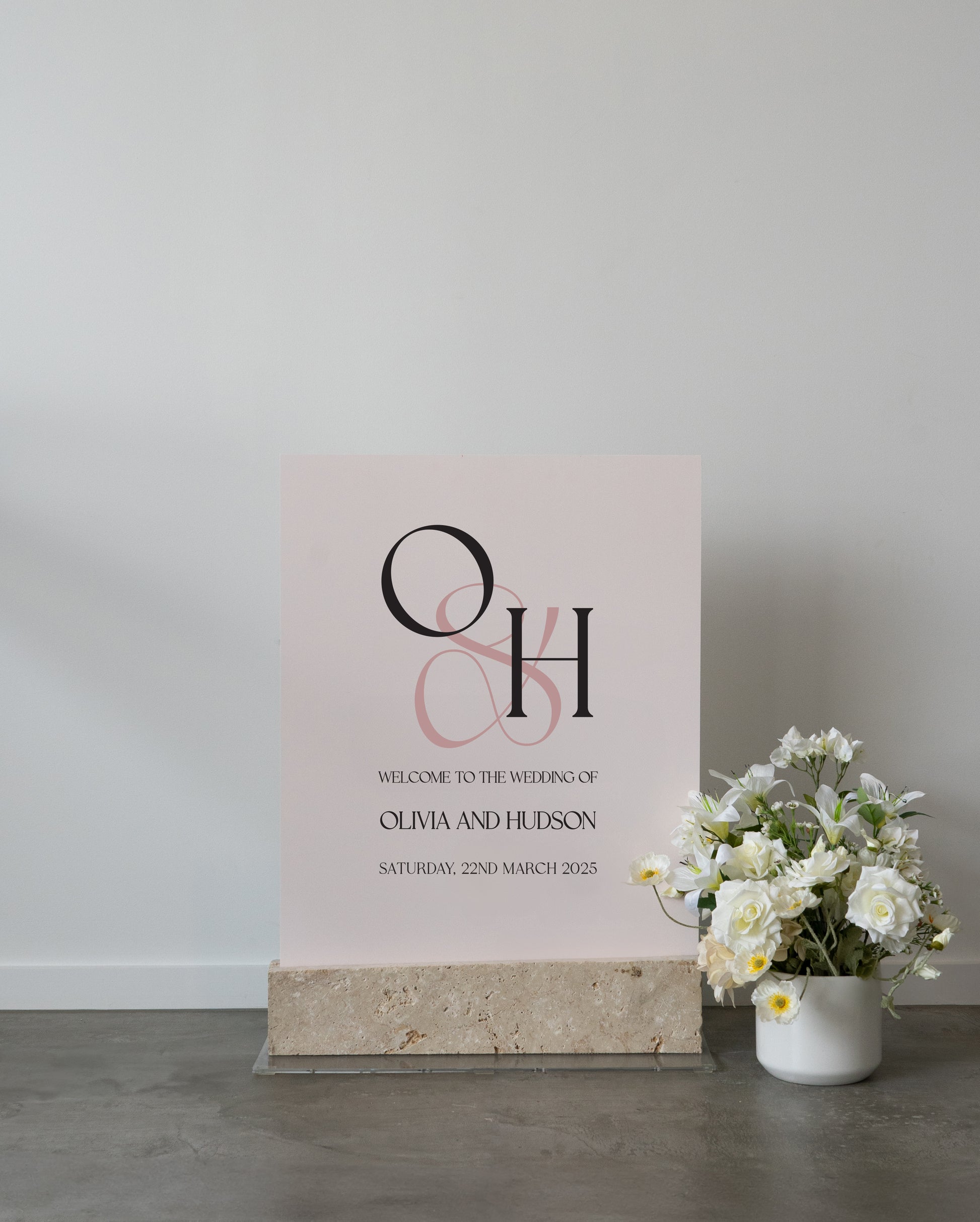 This travertine stand has an angled piece of stone on either side of the sign with an acrylic base (therefore looks best with frosted acrylic for show through). It is made to display A1 welcome signage fitting 3-4mm material between the pieces. The size is 61cm wide x 12cm high x 21cm deep.
