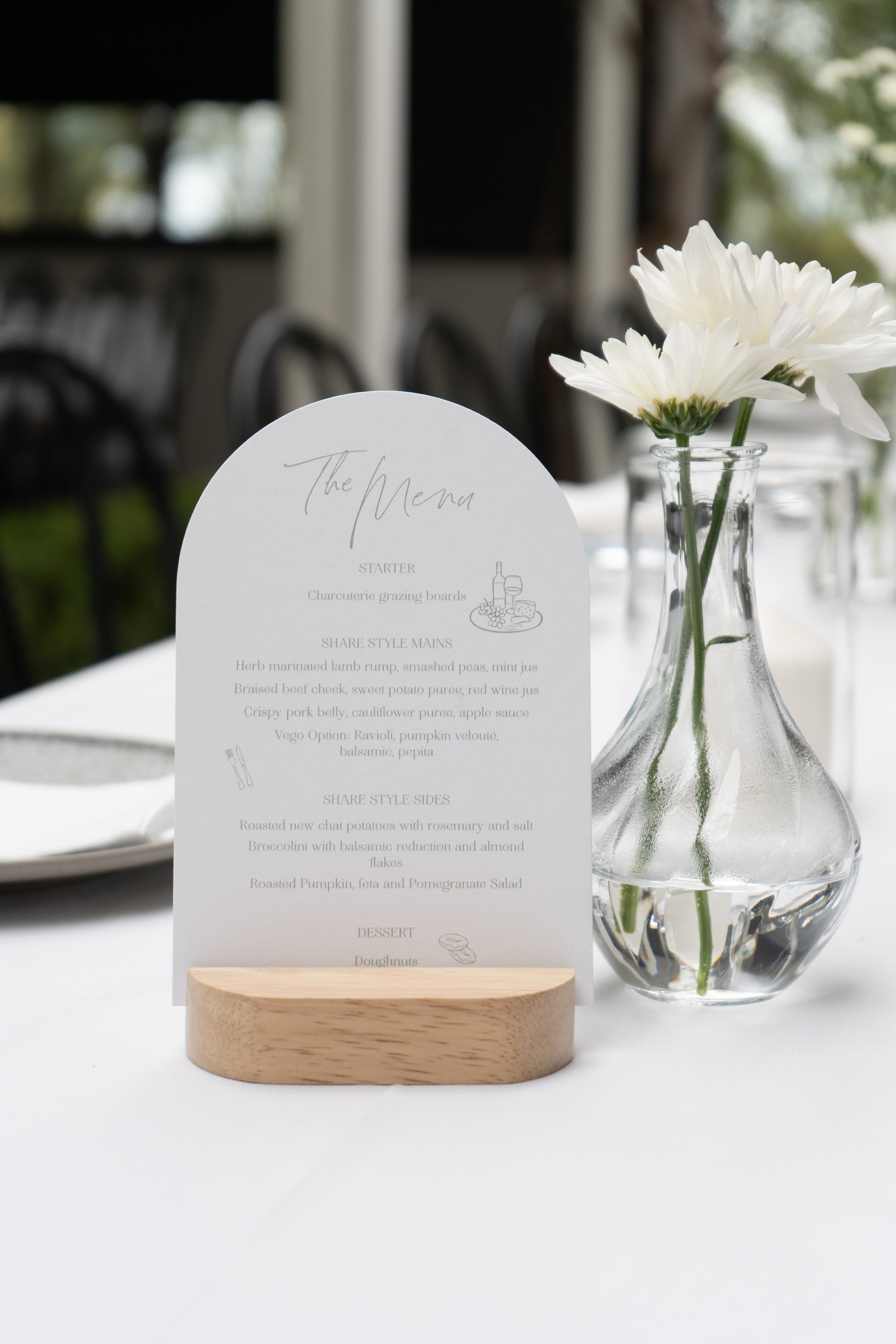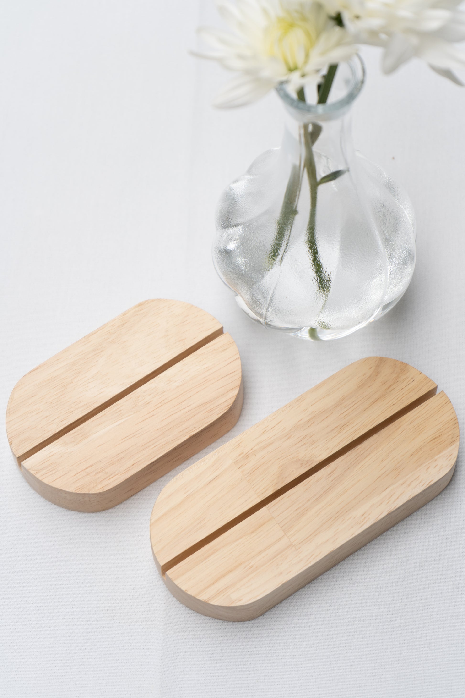 We have two size options for our white wood pill shaped holders. Small size: 7cm W, 11cm L, 2.5cm H, Medium Size: 7cm W, 14.5cm L, 2.5cm H. Both have a 3mm slit to fit 3mm acrylic or thinner cardstock.