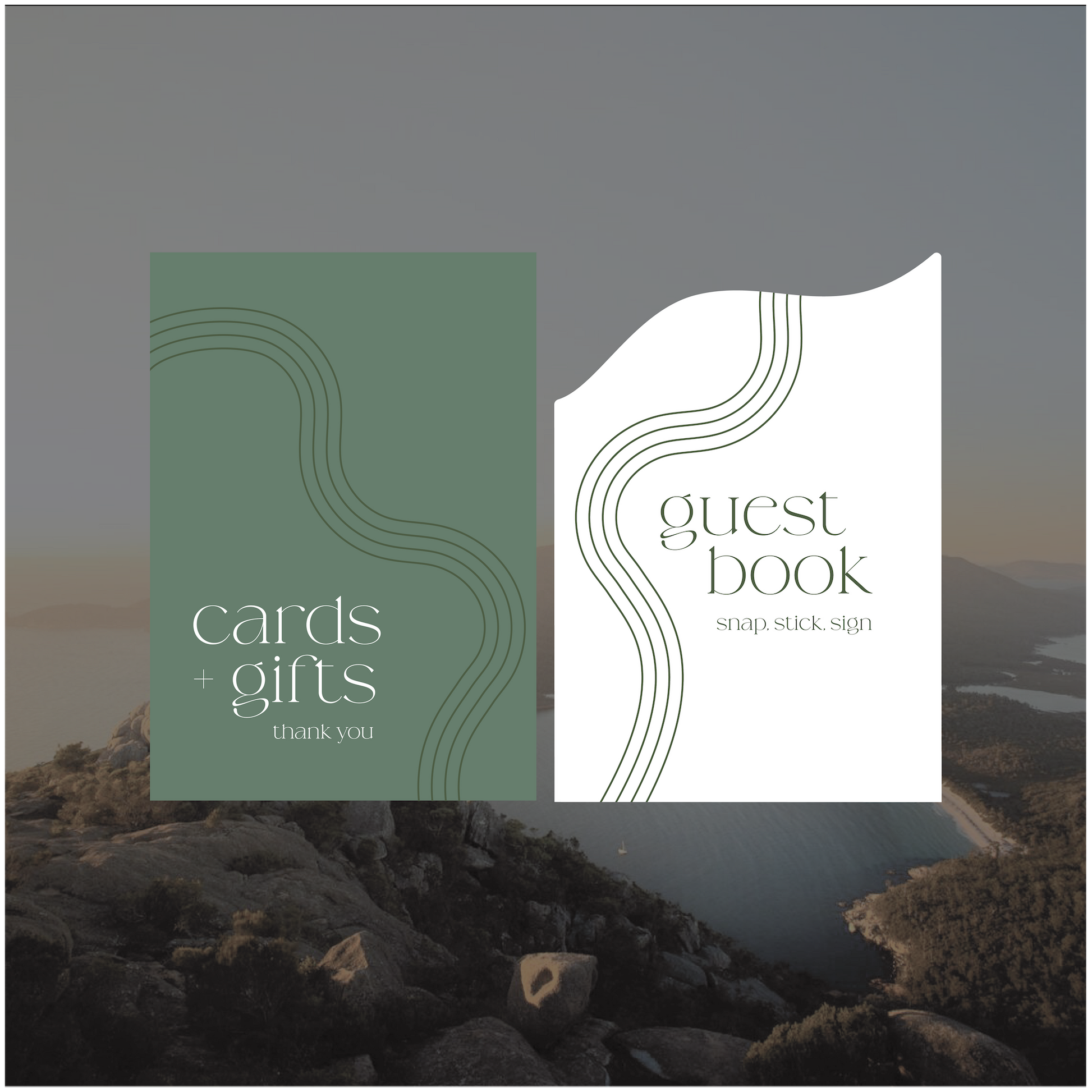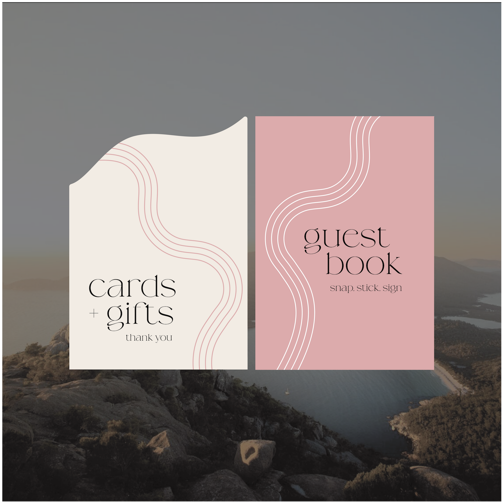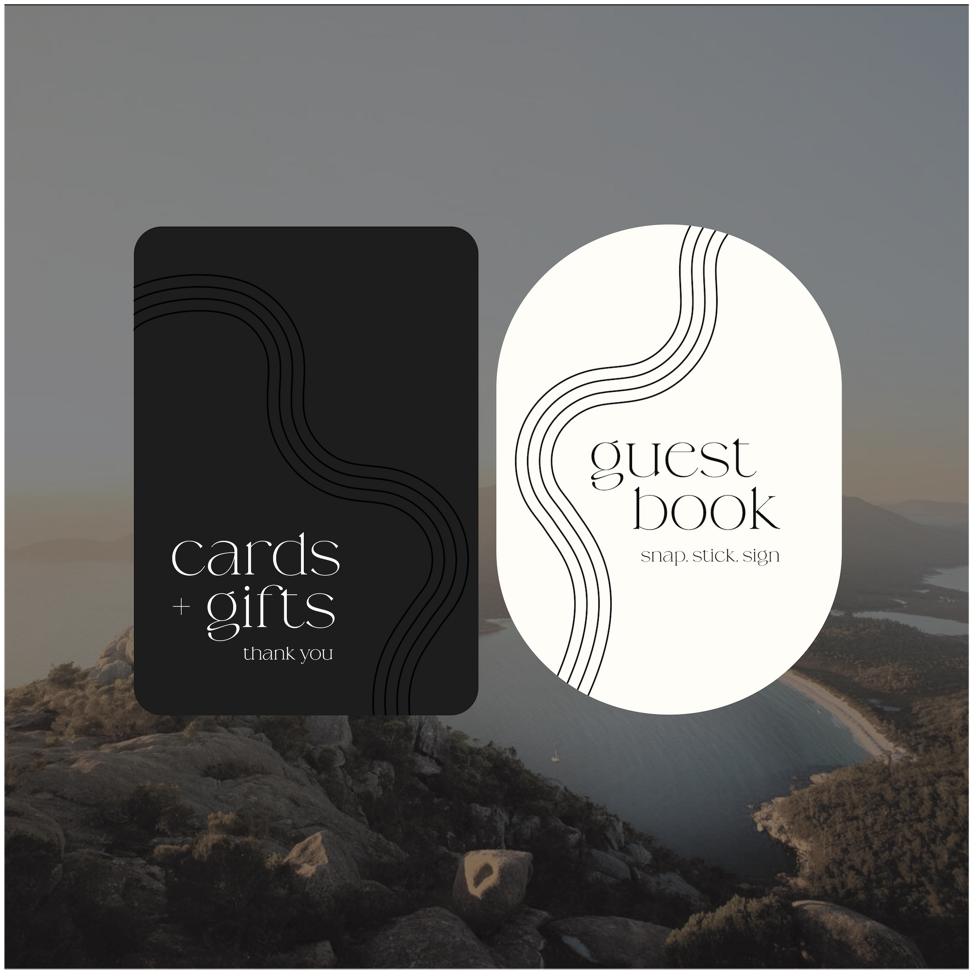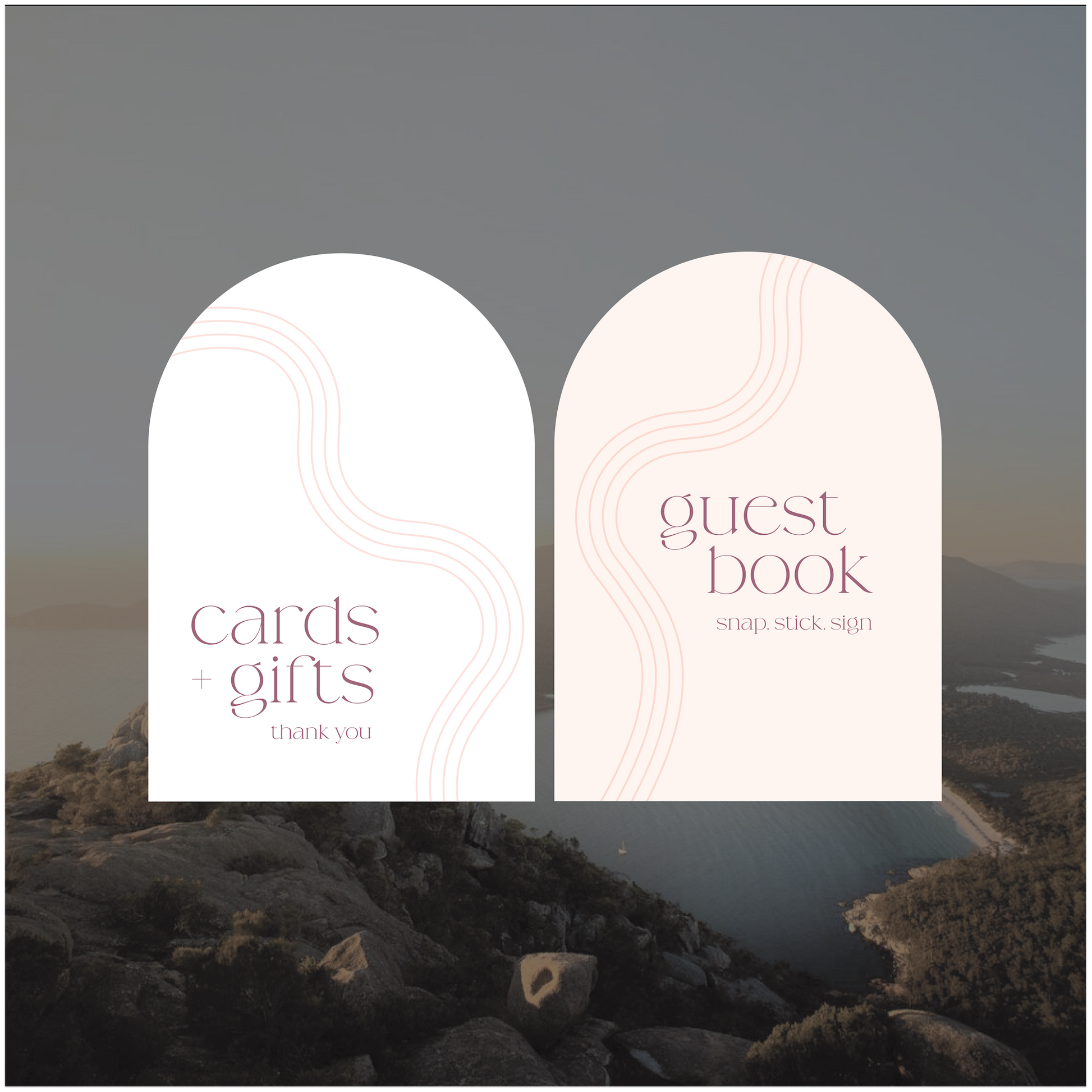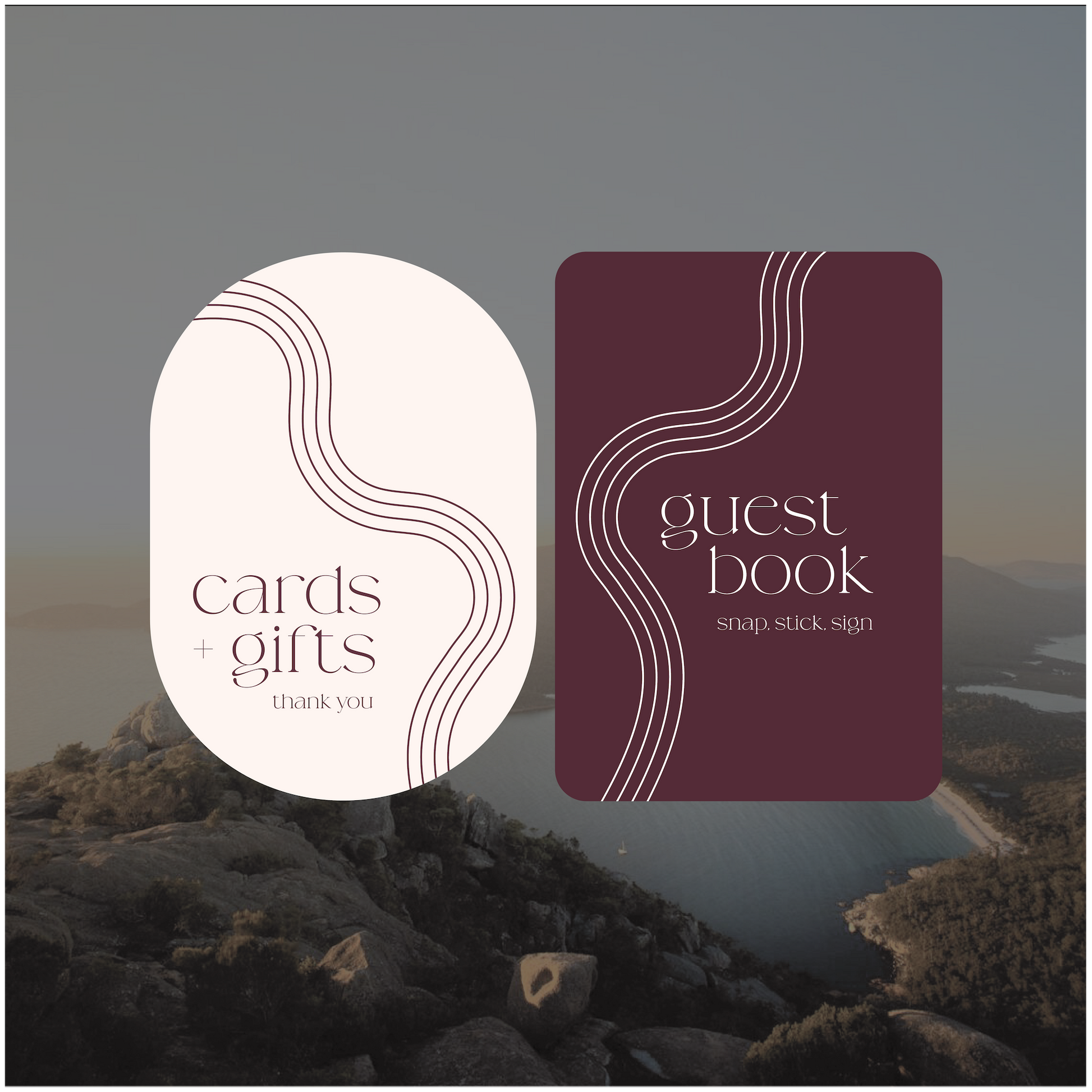 Part of the Australia collection, these small signs have gorgeous wave line elements that run from the top of the design down the page, creating natural framed curves around the text.