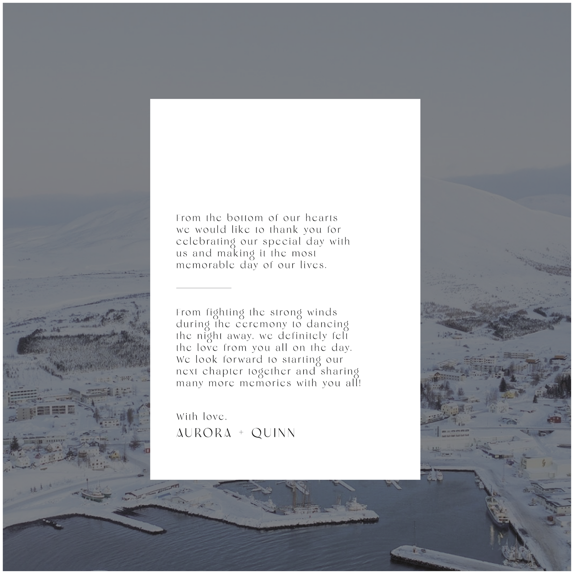 Part of the Iceland collection, this digital thank you card with it's stacked date element is the perfect timeless piece to send to your guests as a final thank you for being apart of your epic celebration.