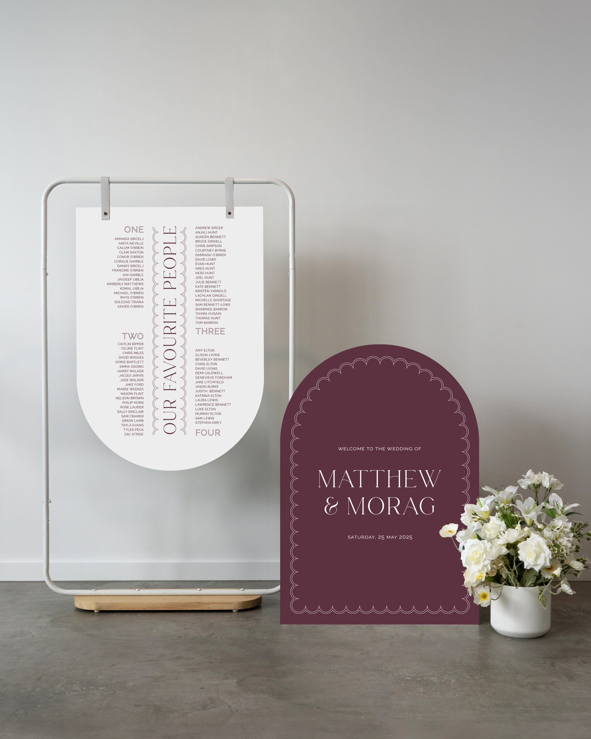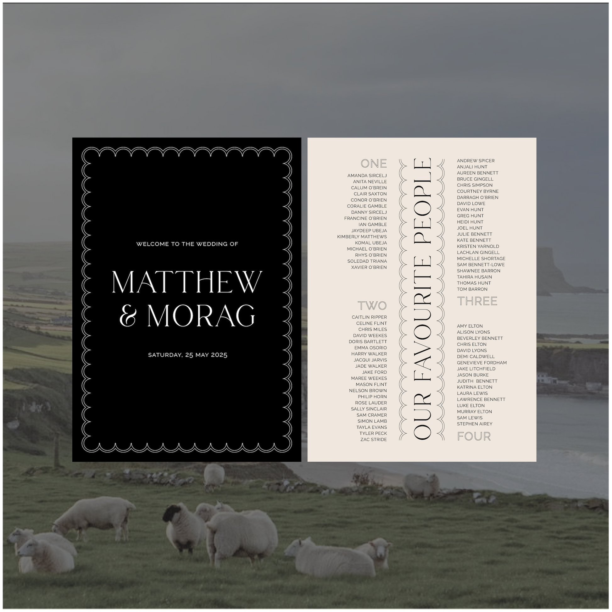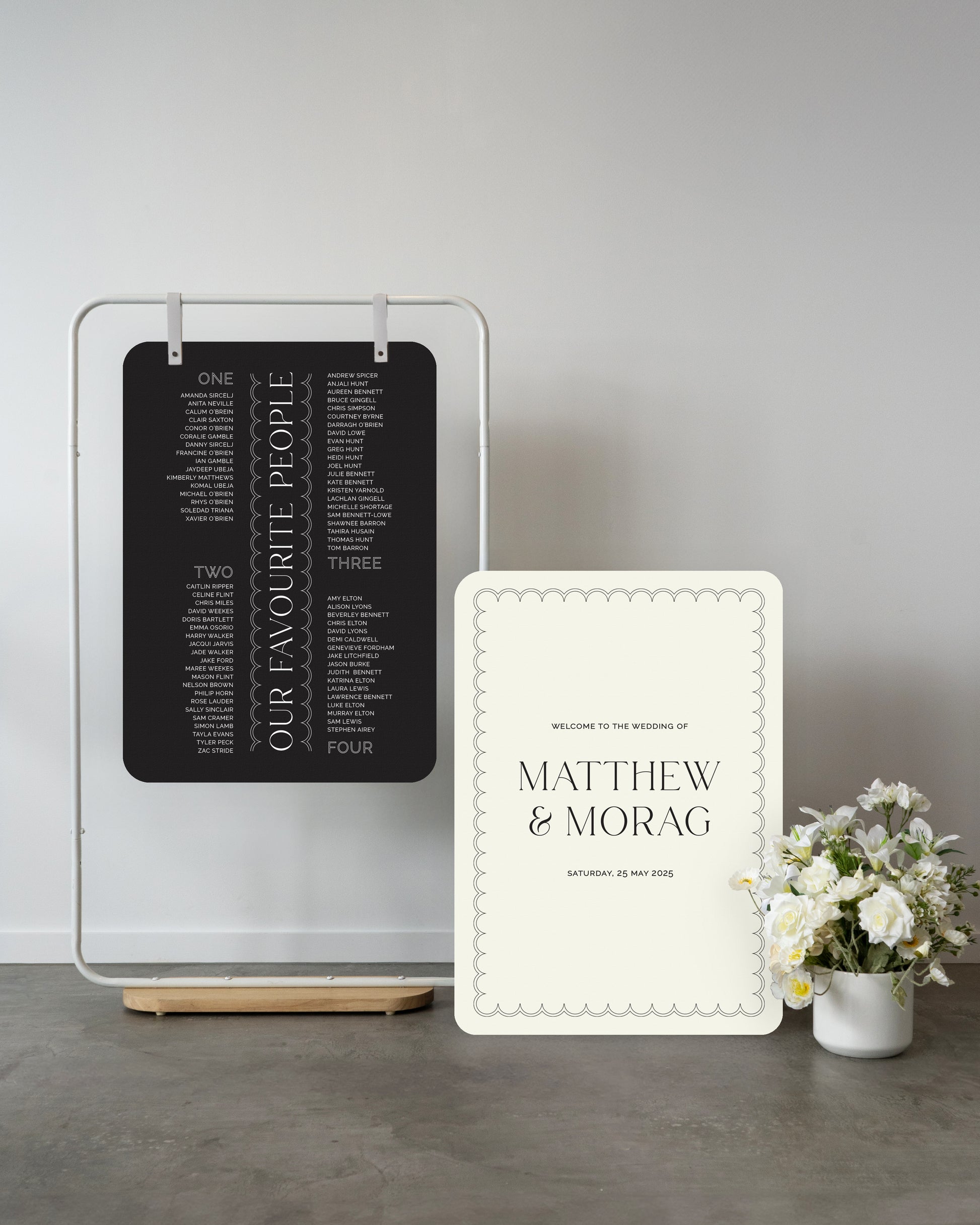 This Ireland wedding welcome and seating chart signage package is a timeless classic with a little bit of edge. Featuring a scalloped border to mimic a four leaf clover curved shape with matching outlined font details.
