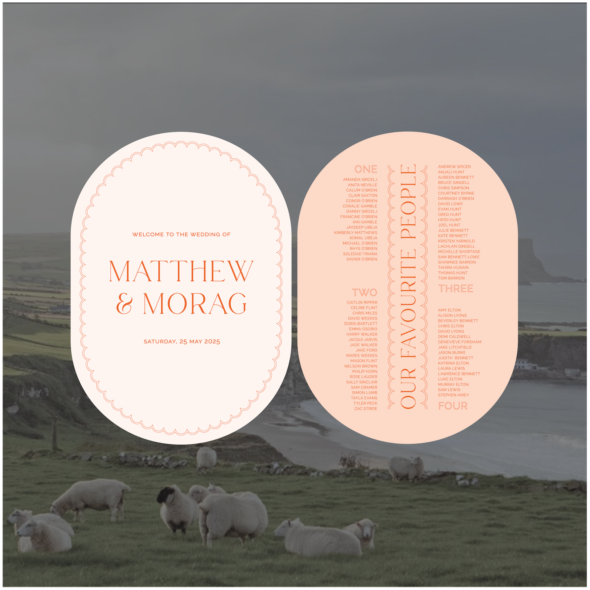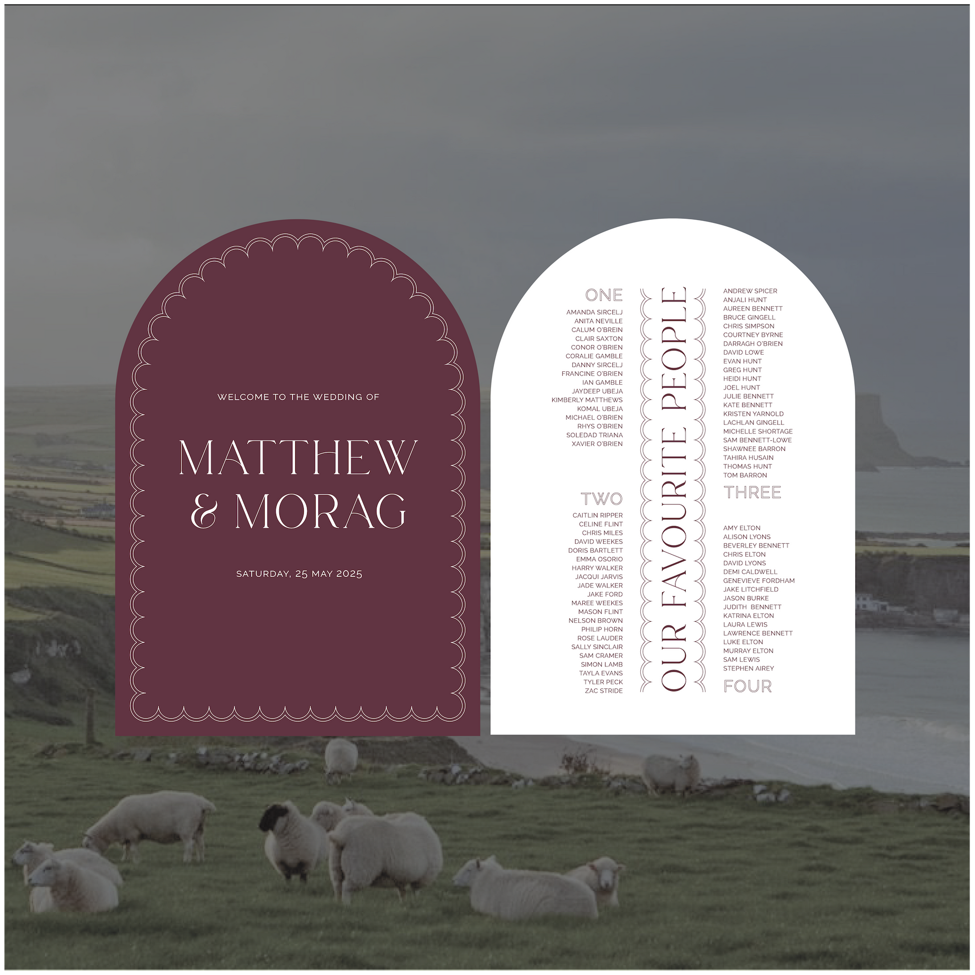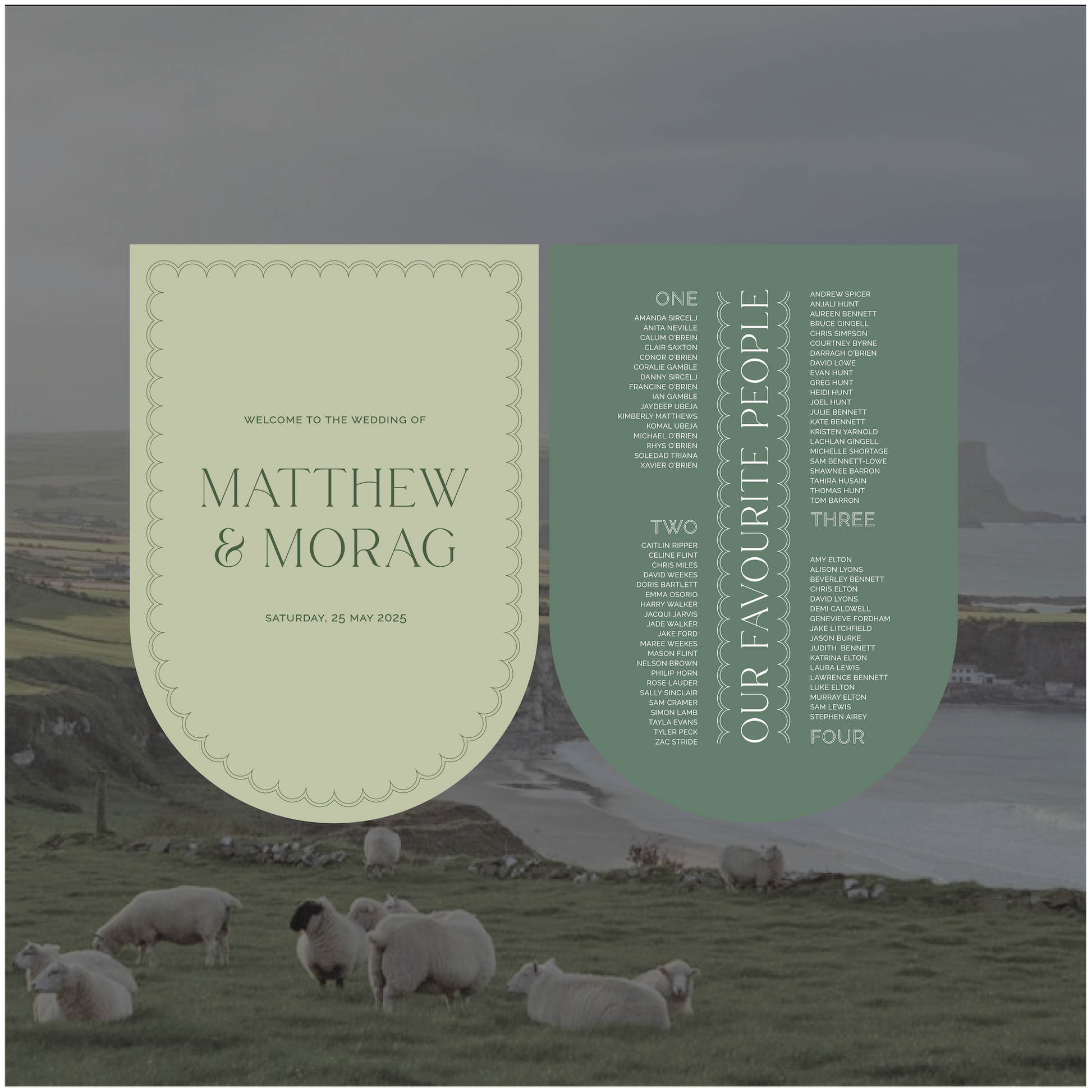 This Ireland wedding welcome and seating chart signage package is a timeless classic with a little bit of edge. Featuring a scalloped border to mimic a four leaf clover curved shape with matching outlined font details.