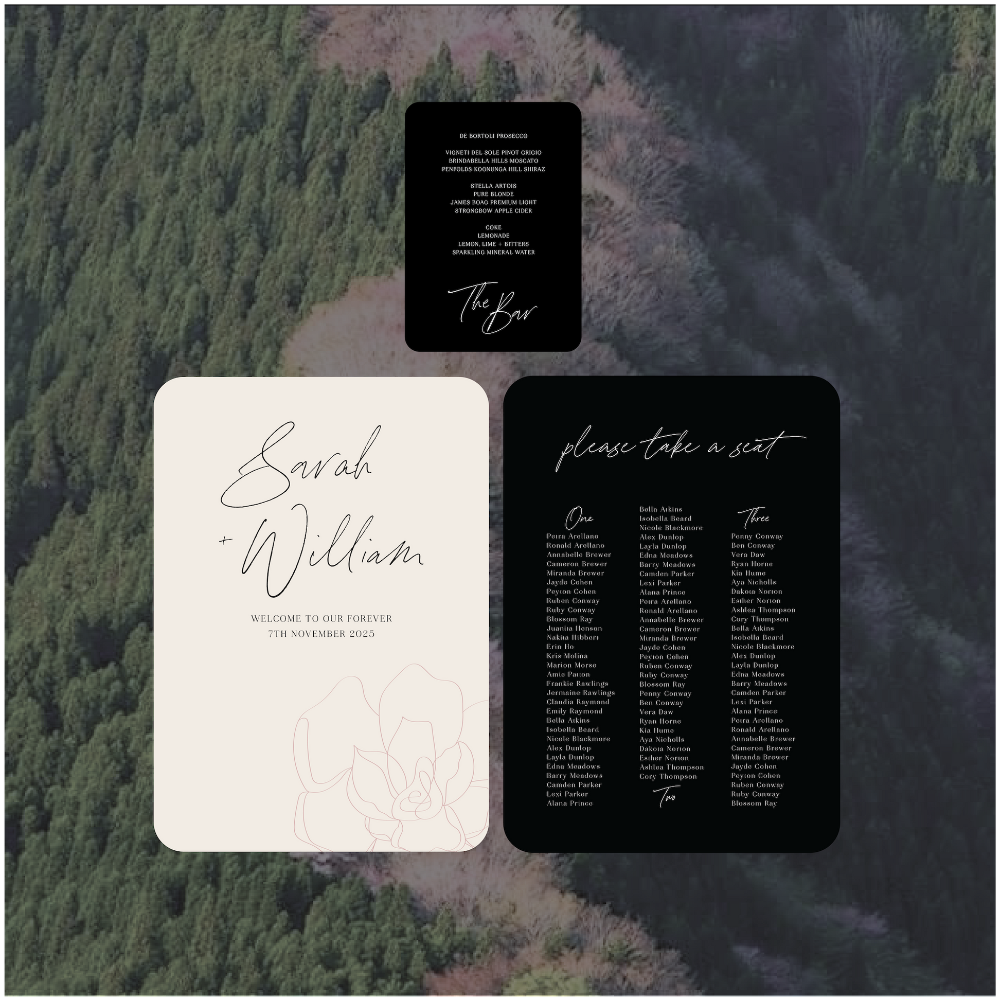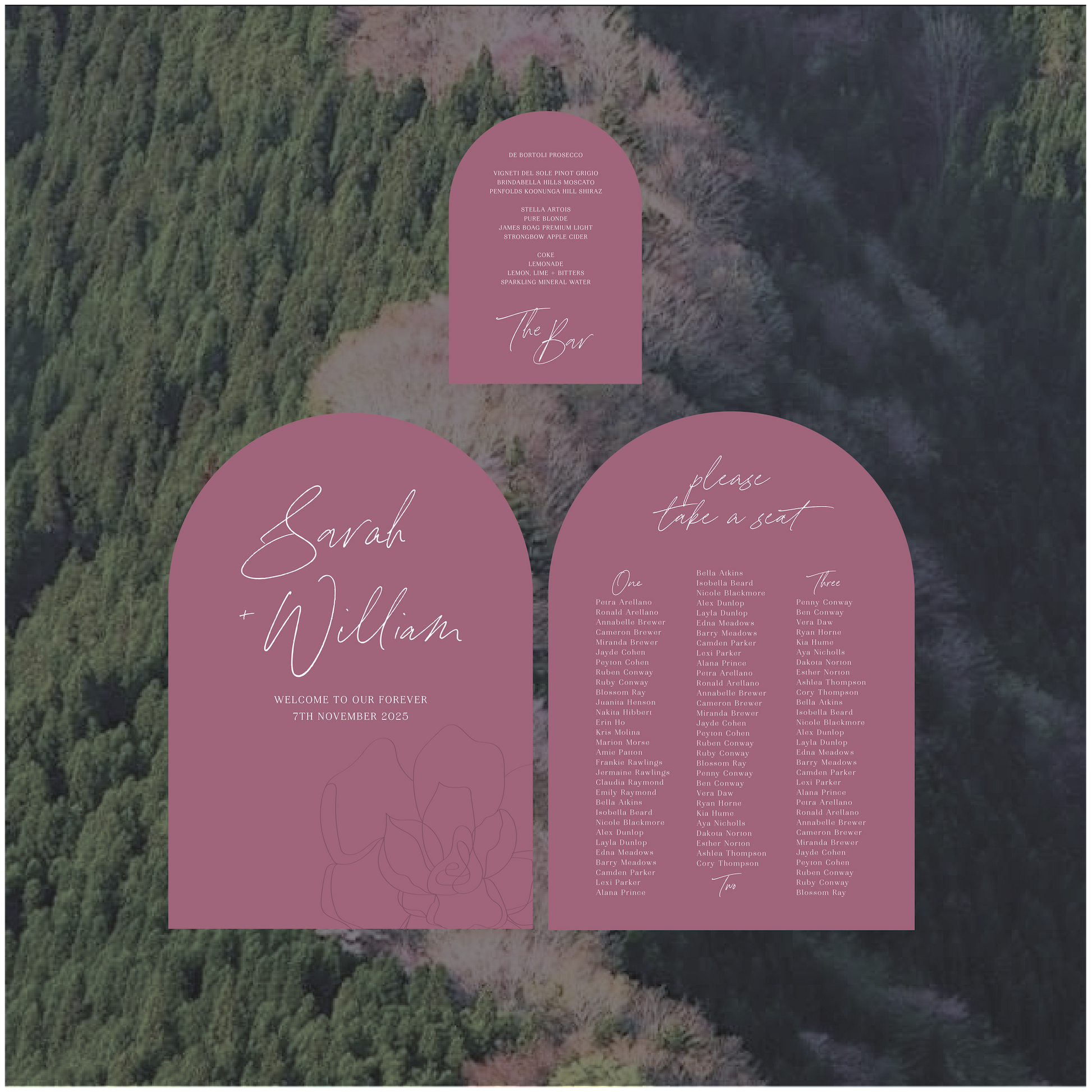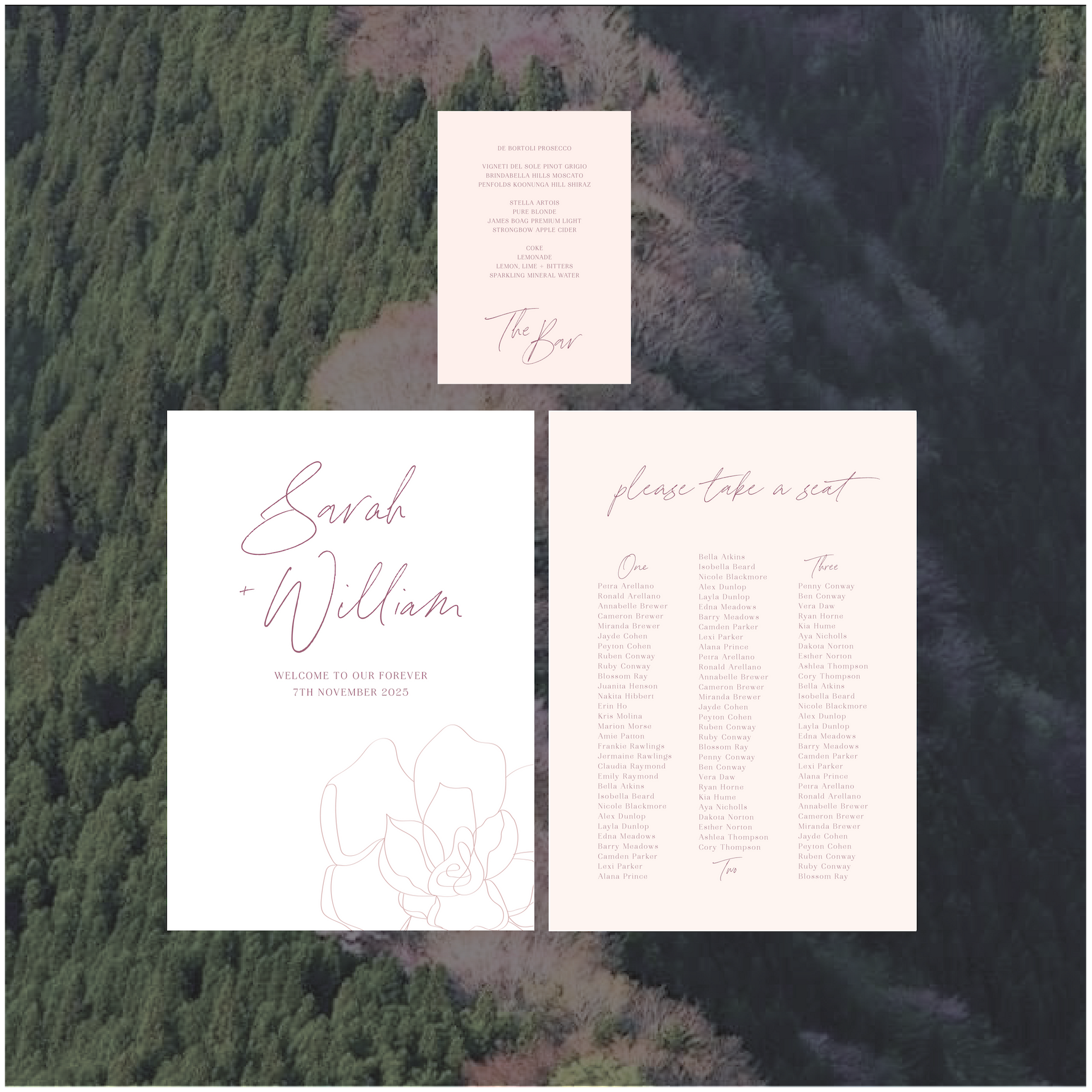 This Japan wedding welcome, seating chart and bar signage package is giving whimsical, romantic vibes with our hand drawn magnolia flower and combination of cursive font and modern body text.