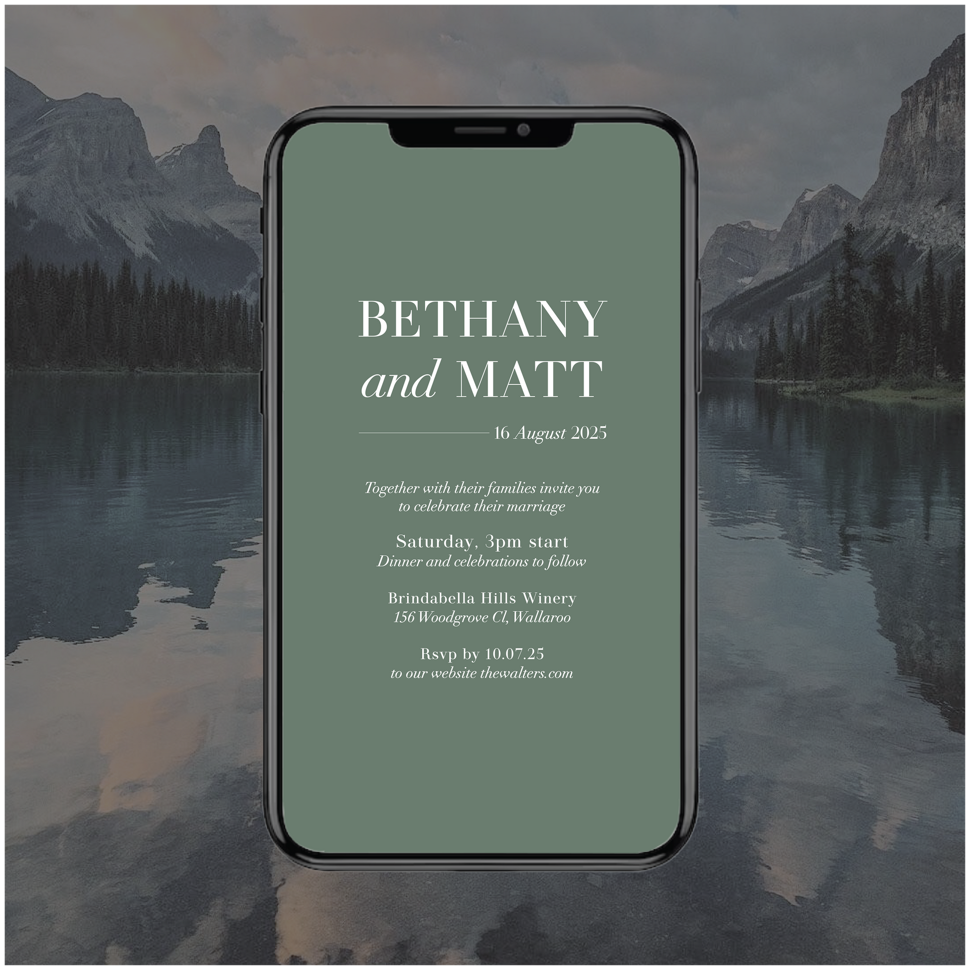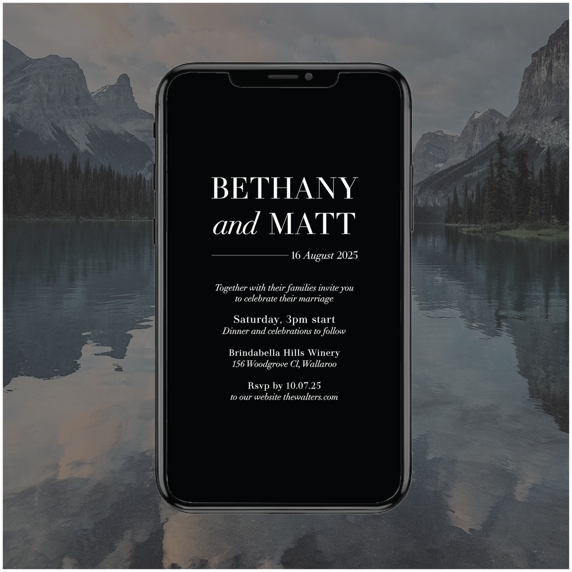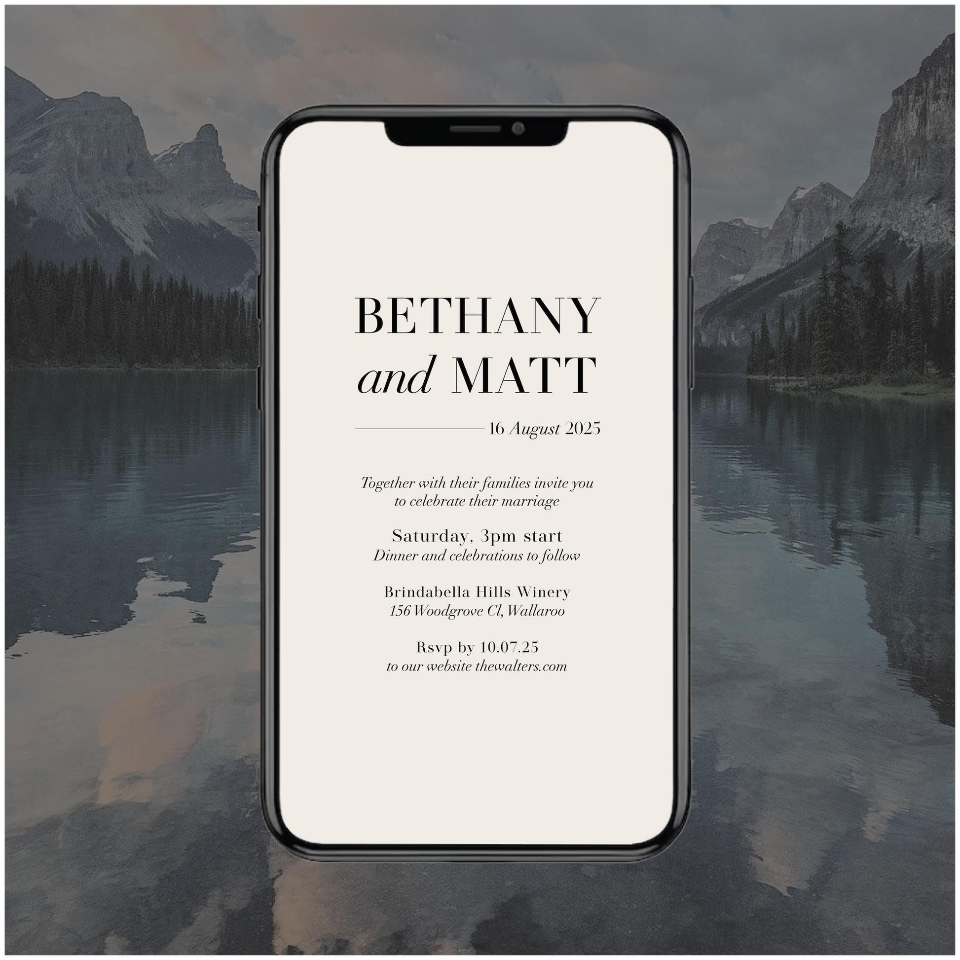 Part of the Canada Collection, this digital wedding invite is modern chic with structured text that directs the eye along the page.