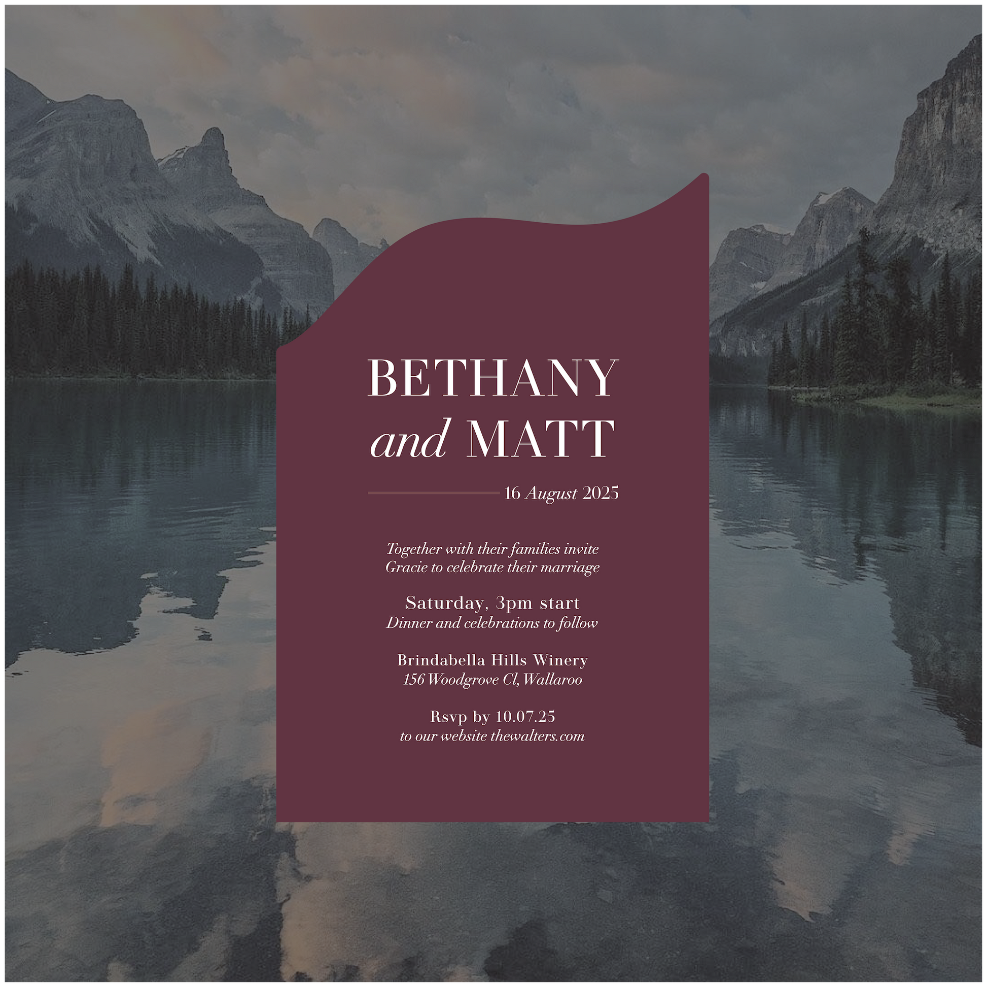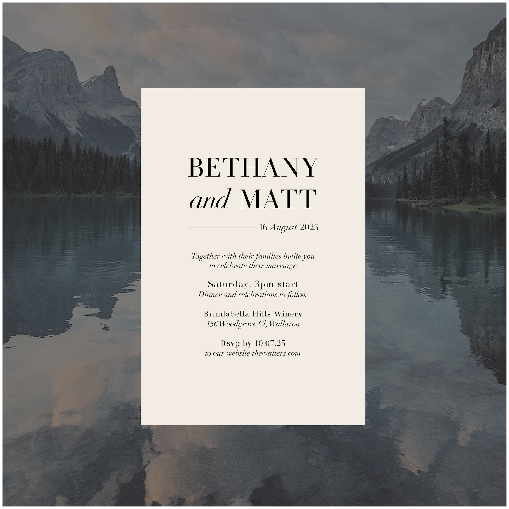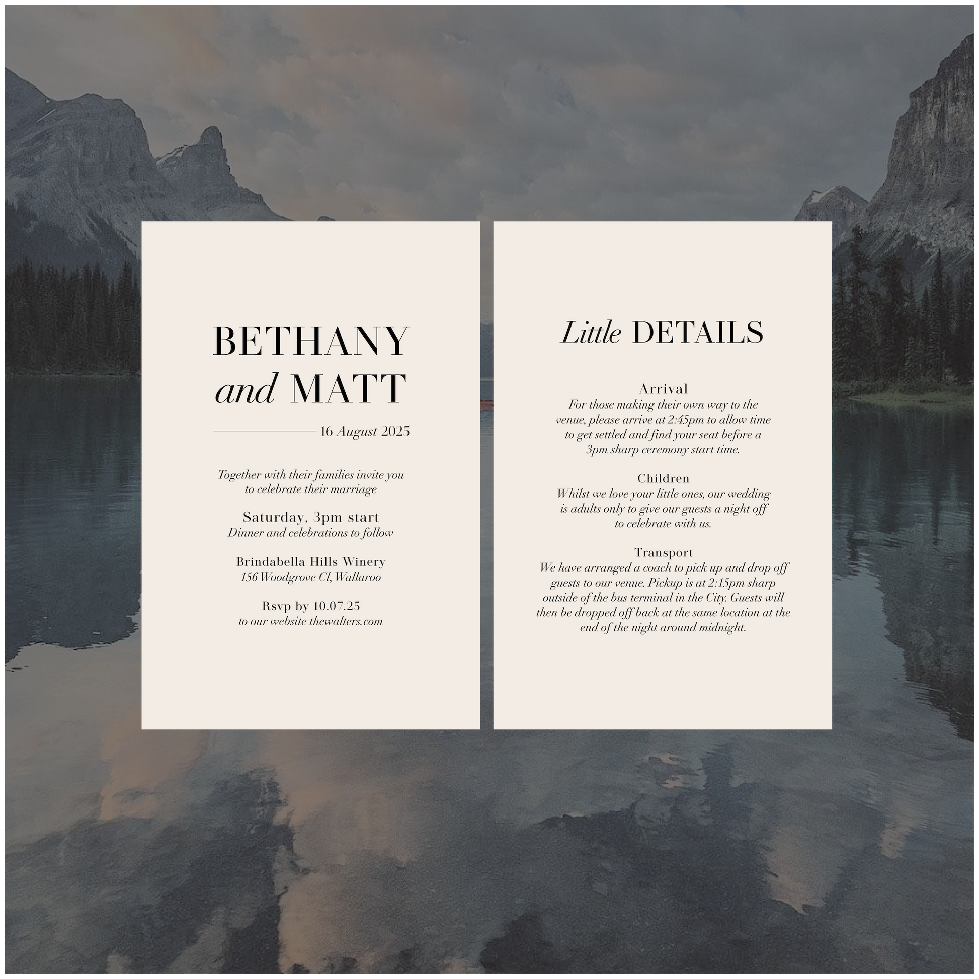 Part of the Canada Collection, this single piece wedding invite is modern chic with structured text that directs the eye along the page.