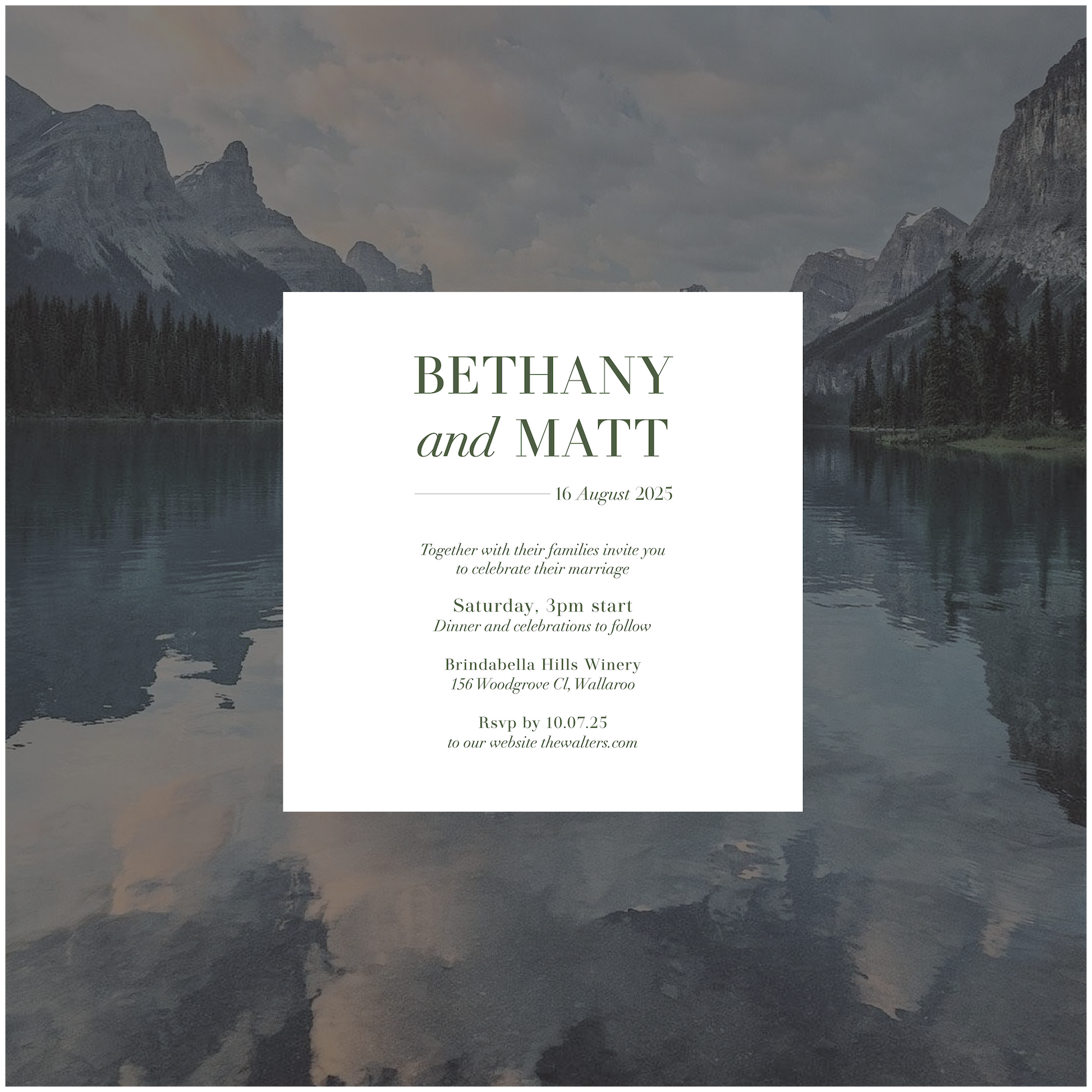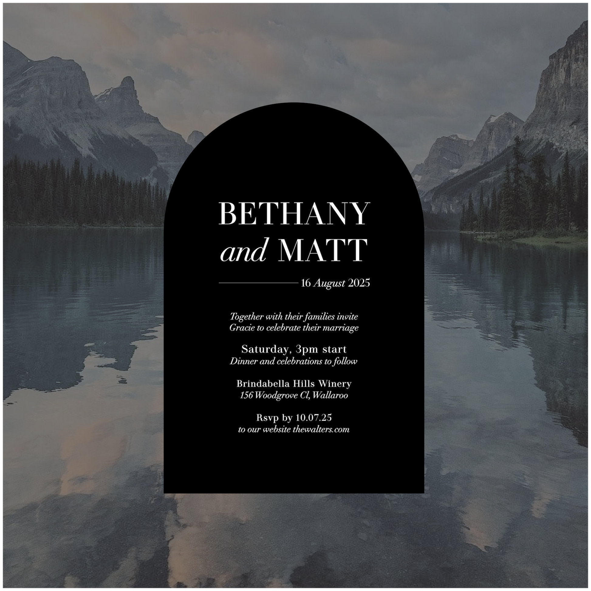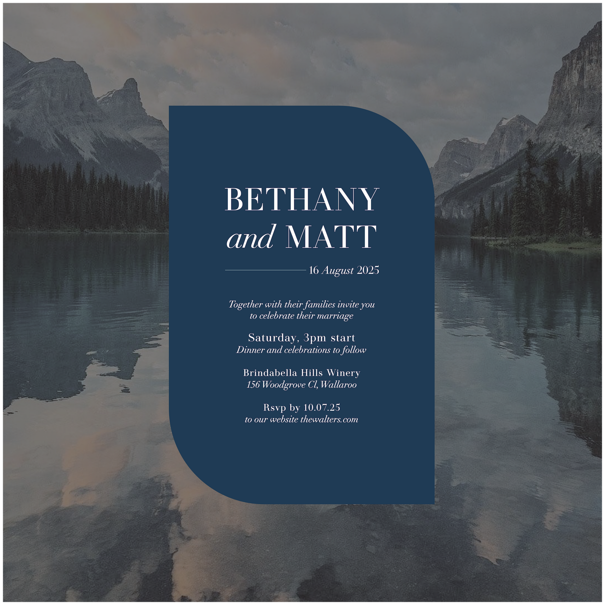 Part of the Canada Collection, this single piece wedding invite is modern chic with structured text that directs the eye along the page.
