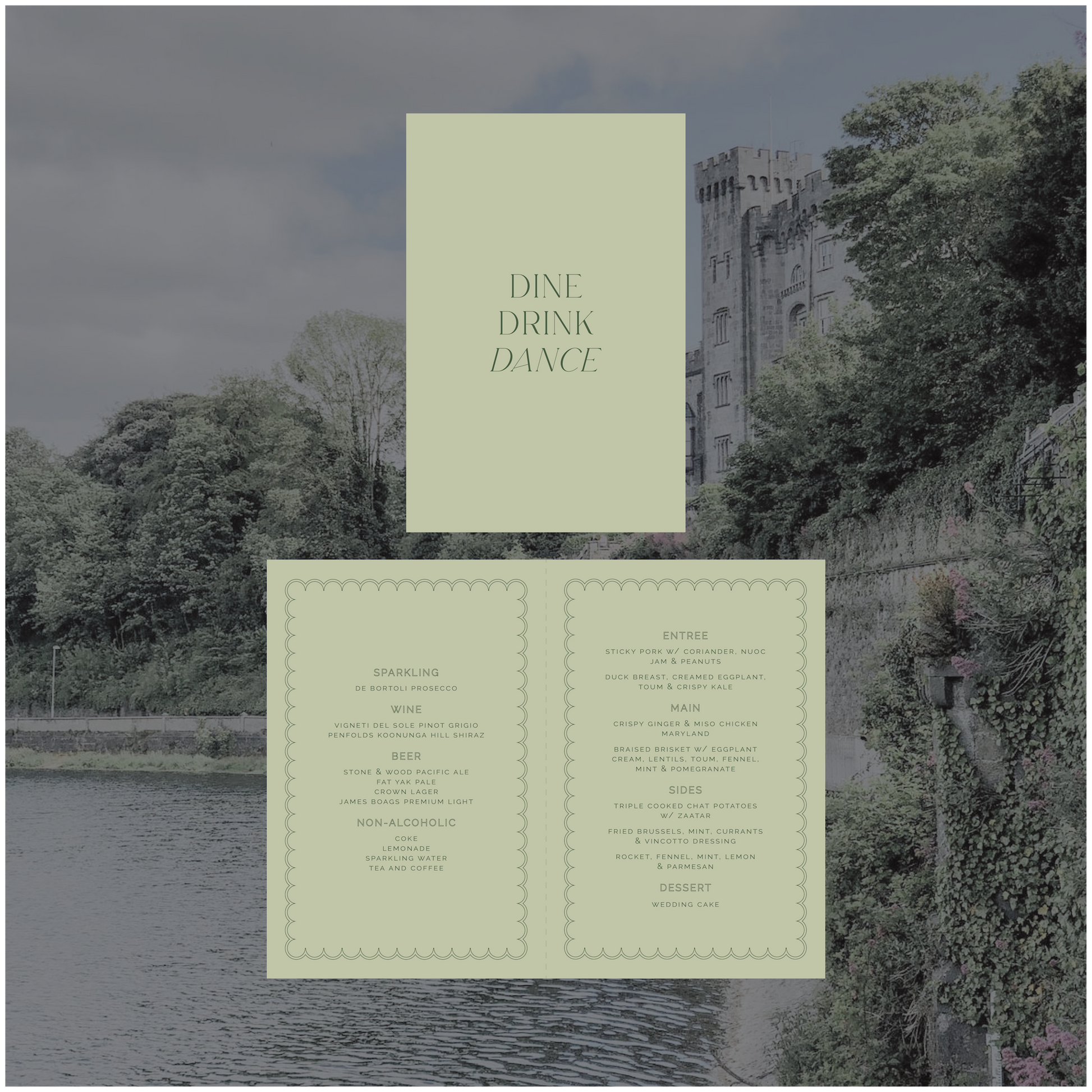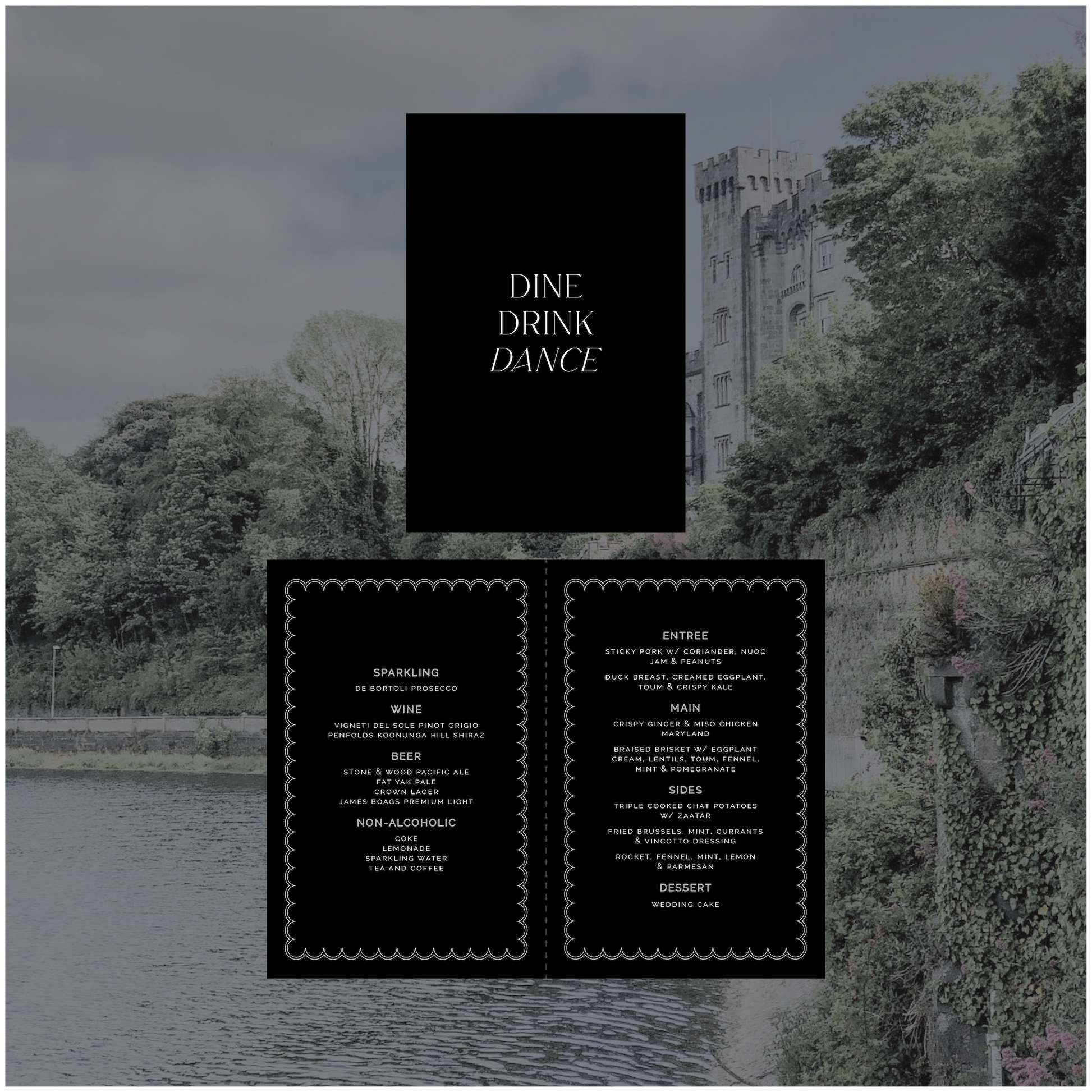 • Double Sided scored standing menu with your chosen quantity and colours. Menu is 120x180mm folded, 240x180mm unfolded. Inside can contain any menu item, saying quote etc. Example shows food and bar menu.