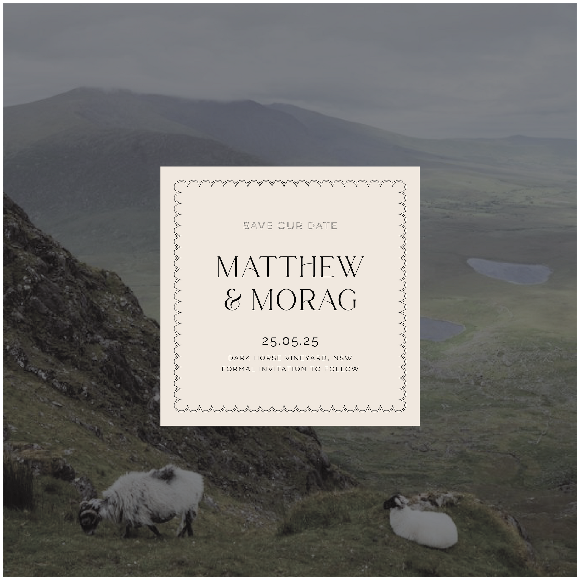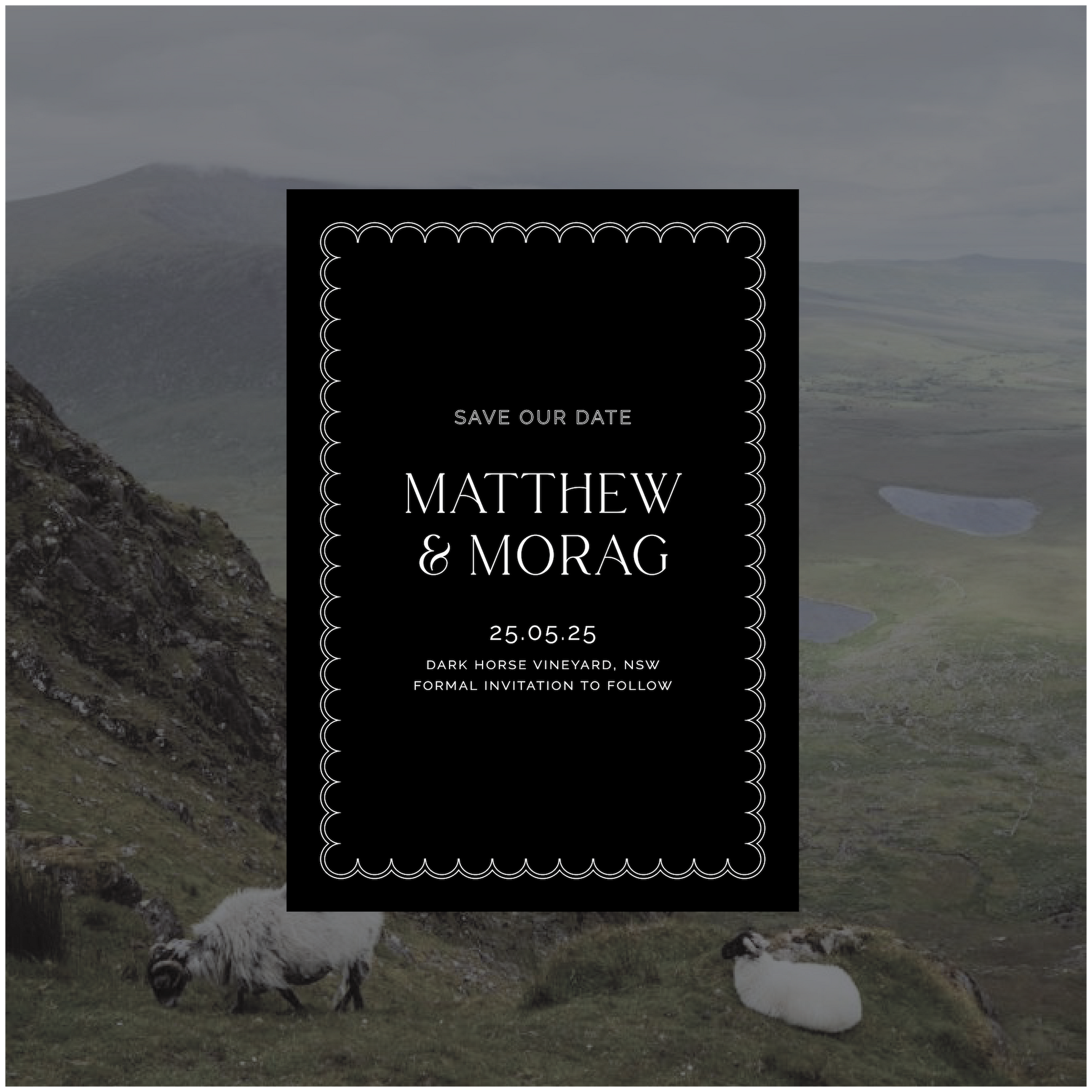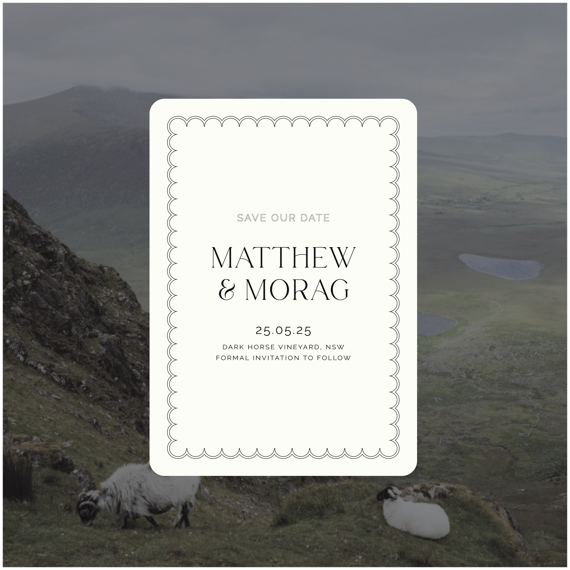 Part of the Ireland Collection, this save the date wedding invite is a timeless classic with a little bit of edge. Featuring a scalloped border to mimic a four leaf clover curved shape with matching outlined font details.