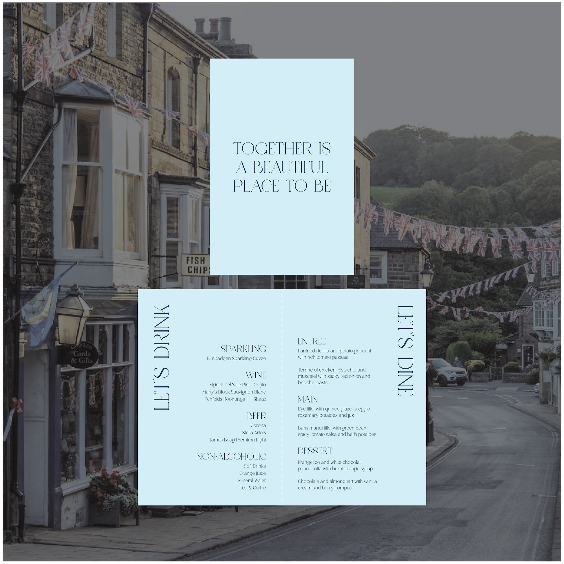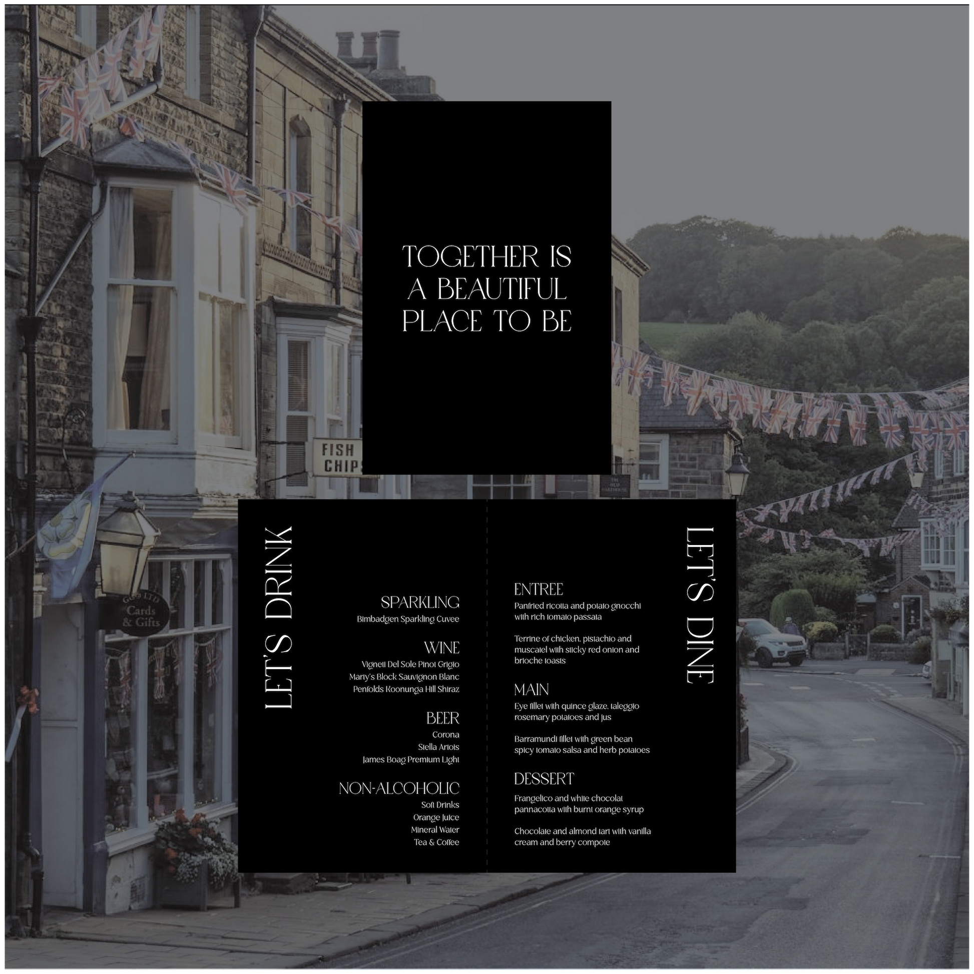 • Double Sided scored standing menu with your chosen quantity and colours. Menu is 120x180mm folded, 240x180mm unfolded. Inside can contain any menu item, saying quote etc. Example shows food and bar menu.