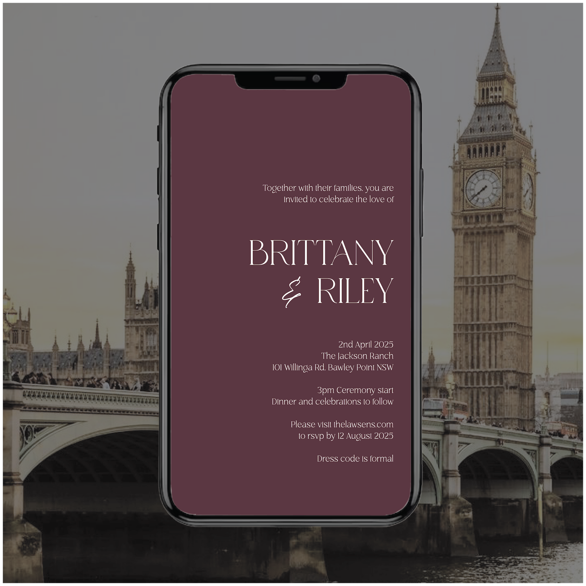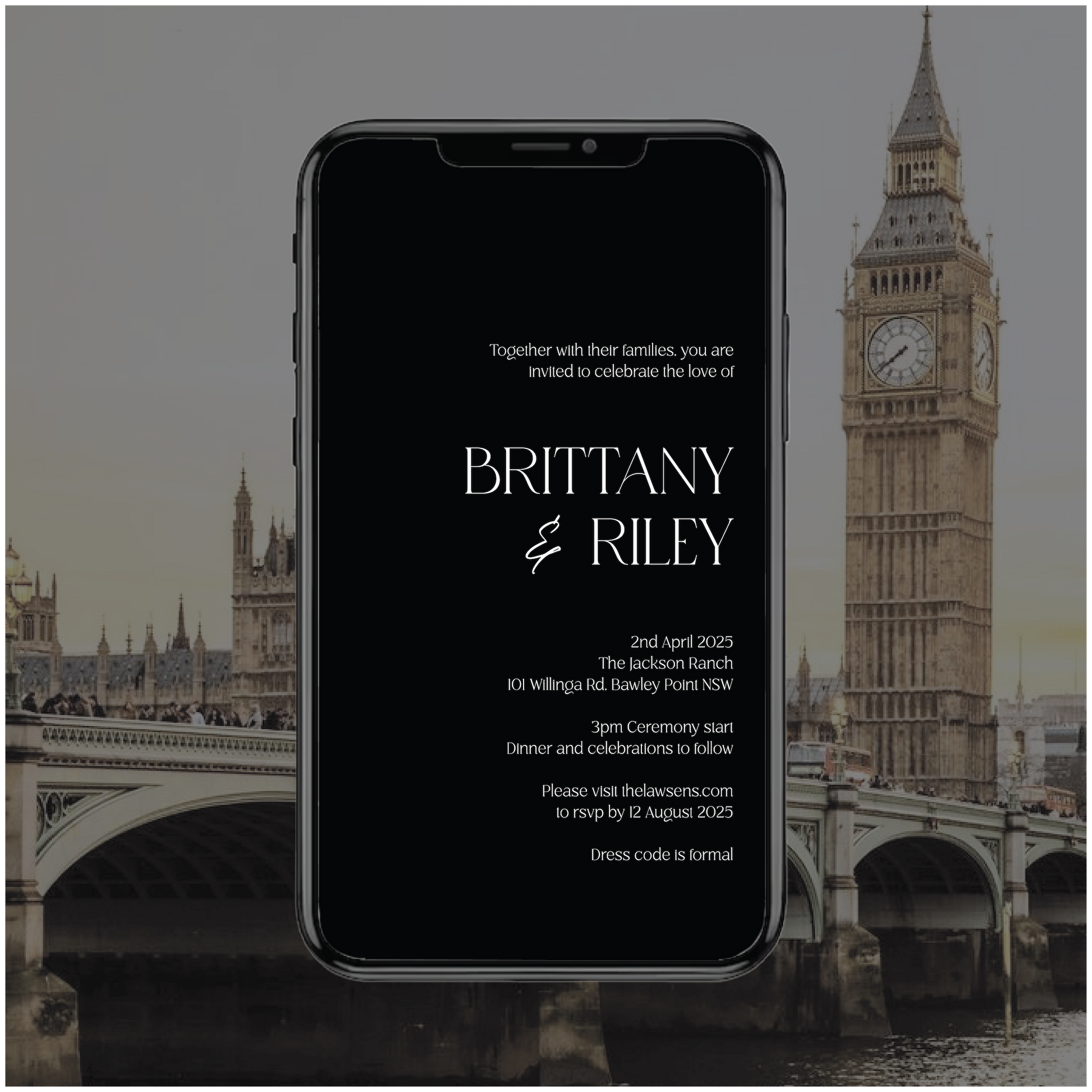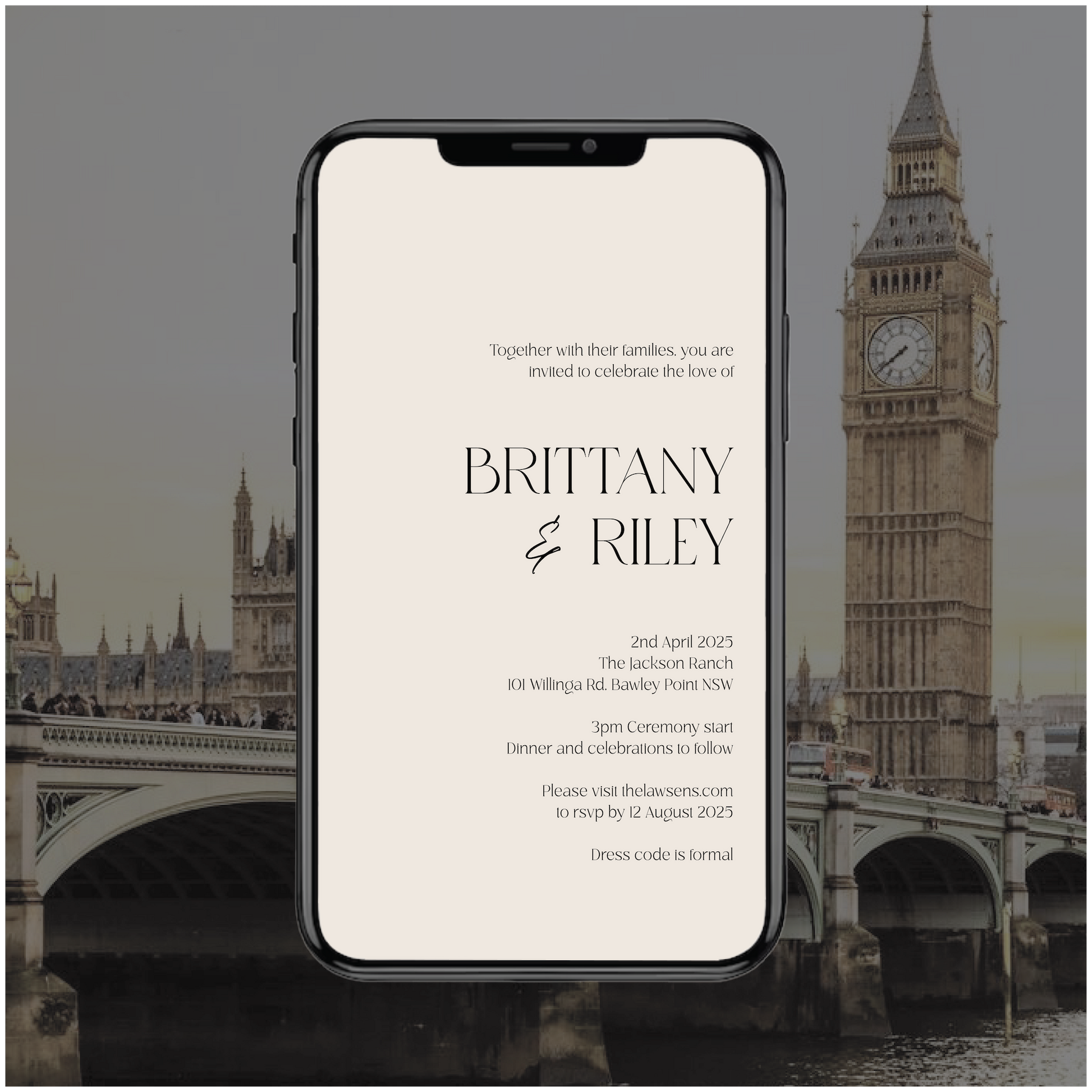 Part of the United Kingdom Collection, this digital wedding invite is a timeless classic with a subtle modern twist in the font choice.