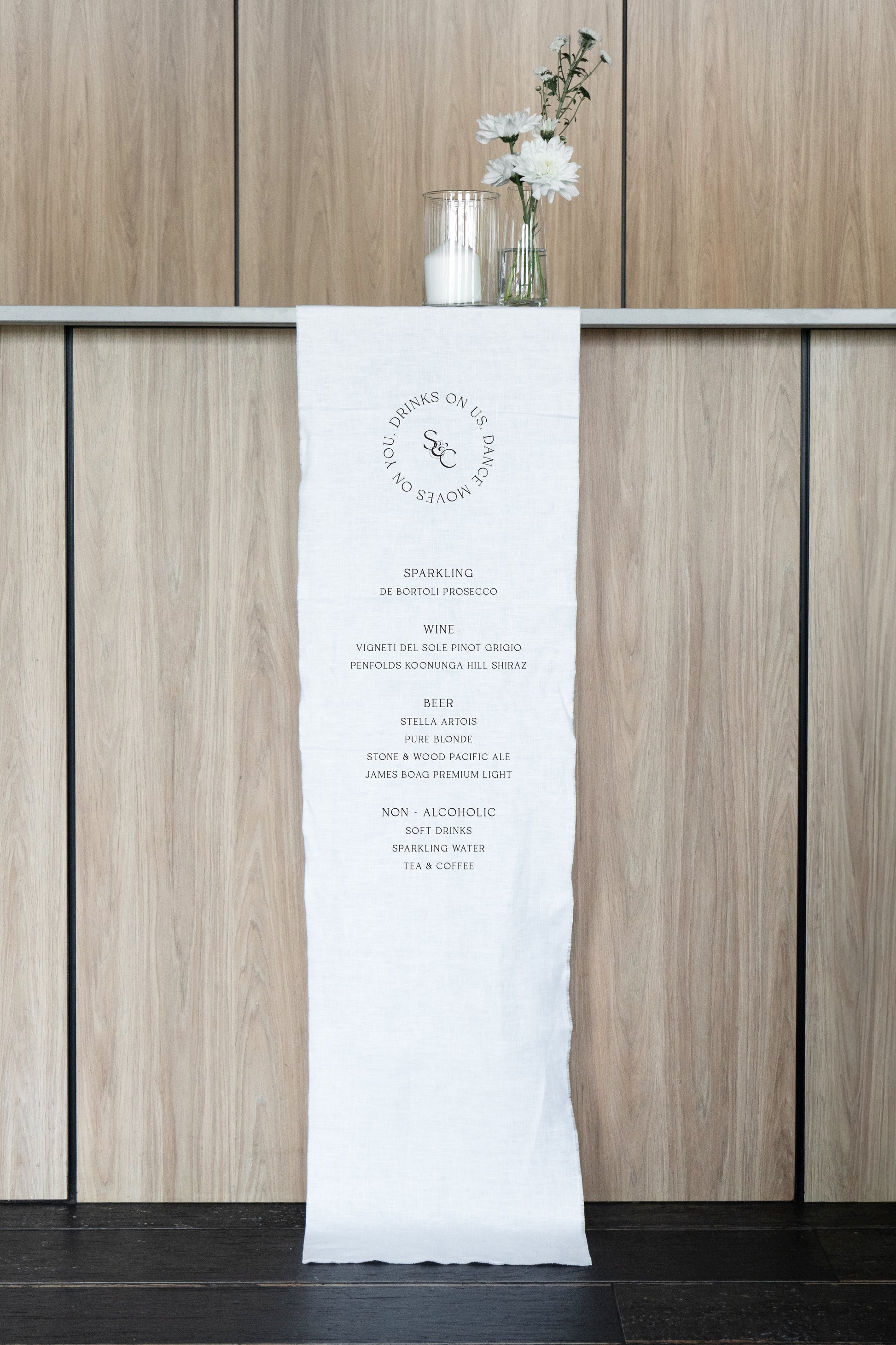 Part of the Spain Collection, this linen fabric bar sign contains a couples initial logo carried throughout the whole collection as well as a distinctive circle text feature.