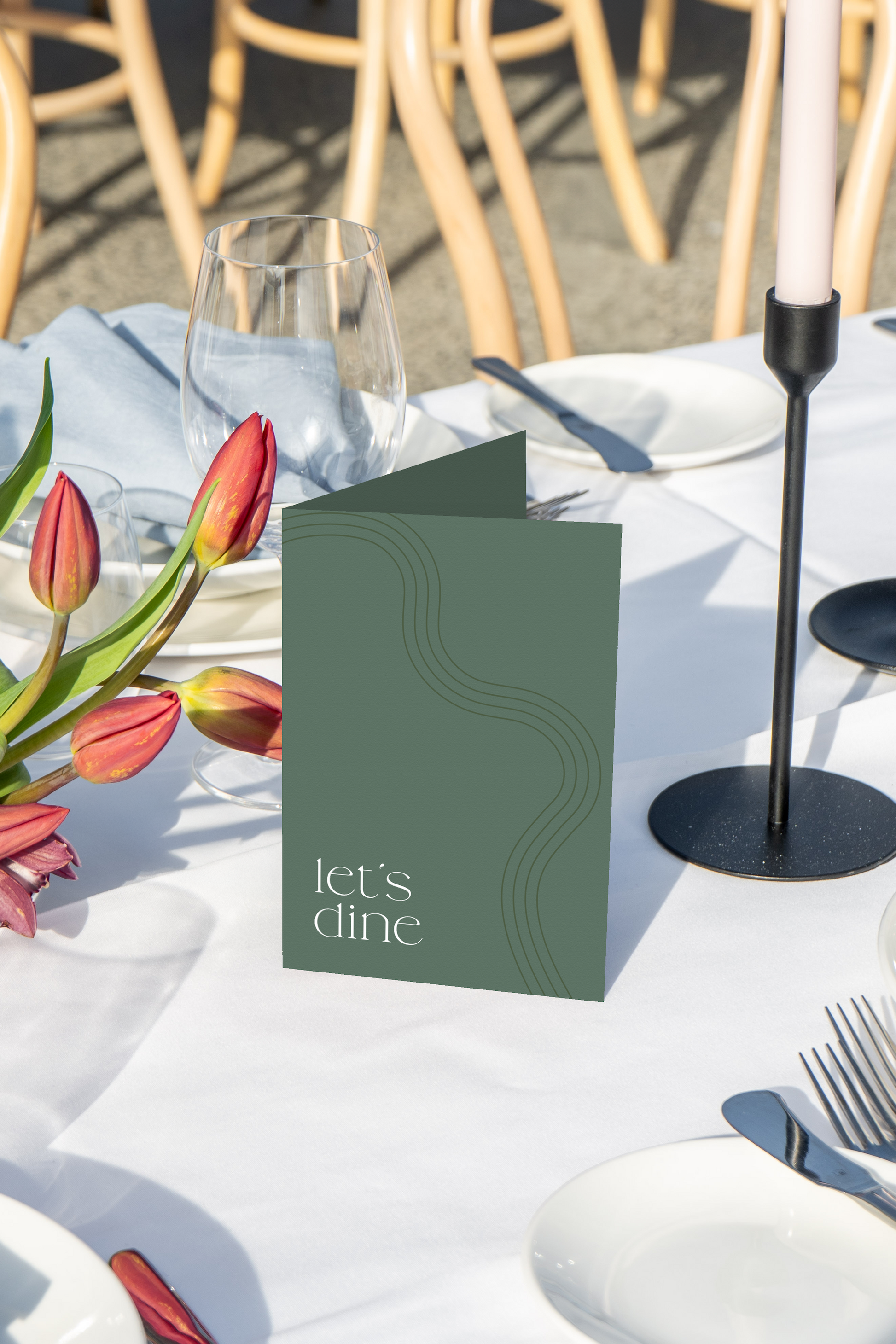 • Double Sided scored standing menu with your chosen quantity and colours. Menu is 120x180mm folded, 240x180mm unfolded. Inside can contain any menu item, saying quote etc. Example shows food and bar menu.