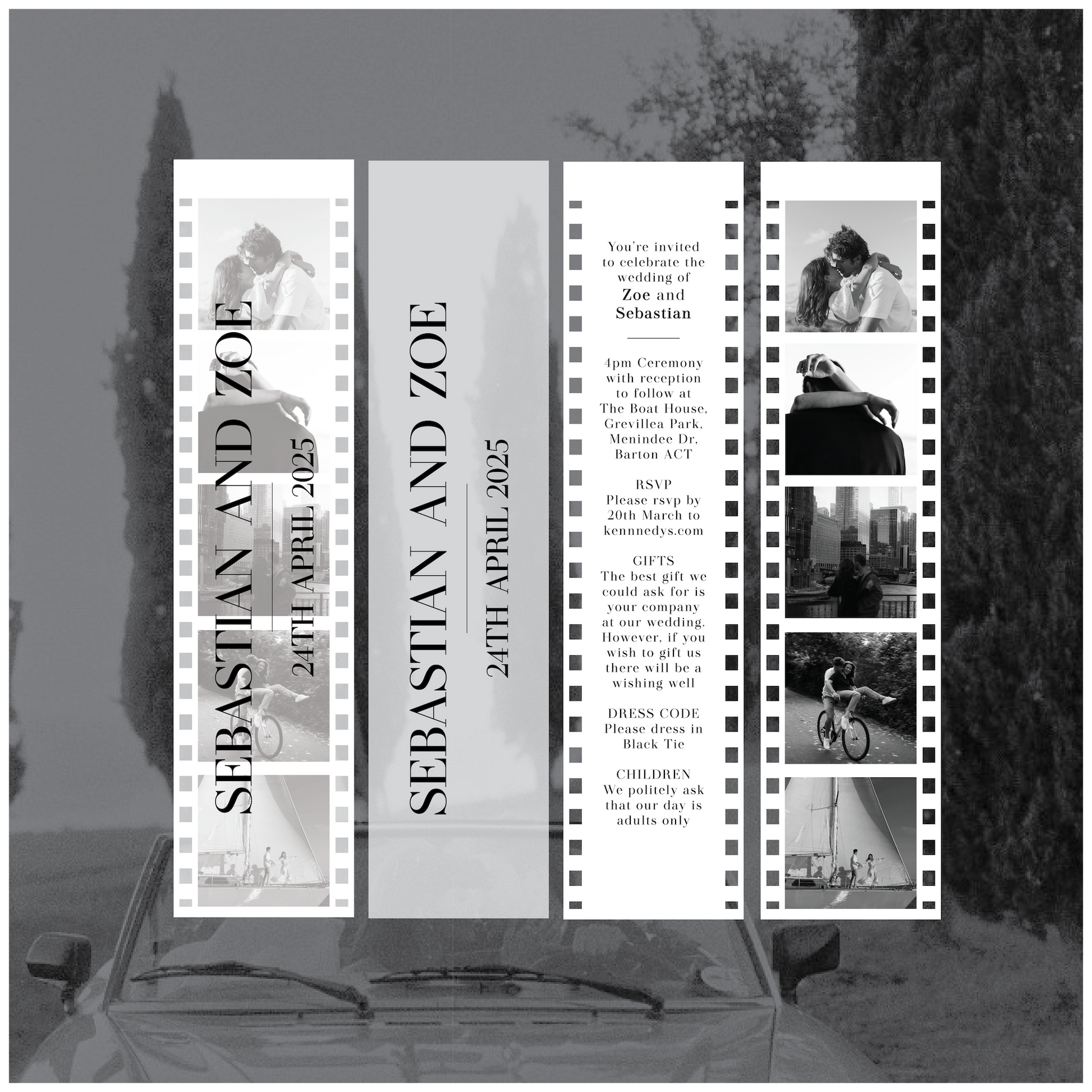 This stacked wedding invite mimics a vintage film strip. With your names and date on a transparent vellum top layer and your photos and details on the film strip cut out shape at the back.