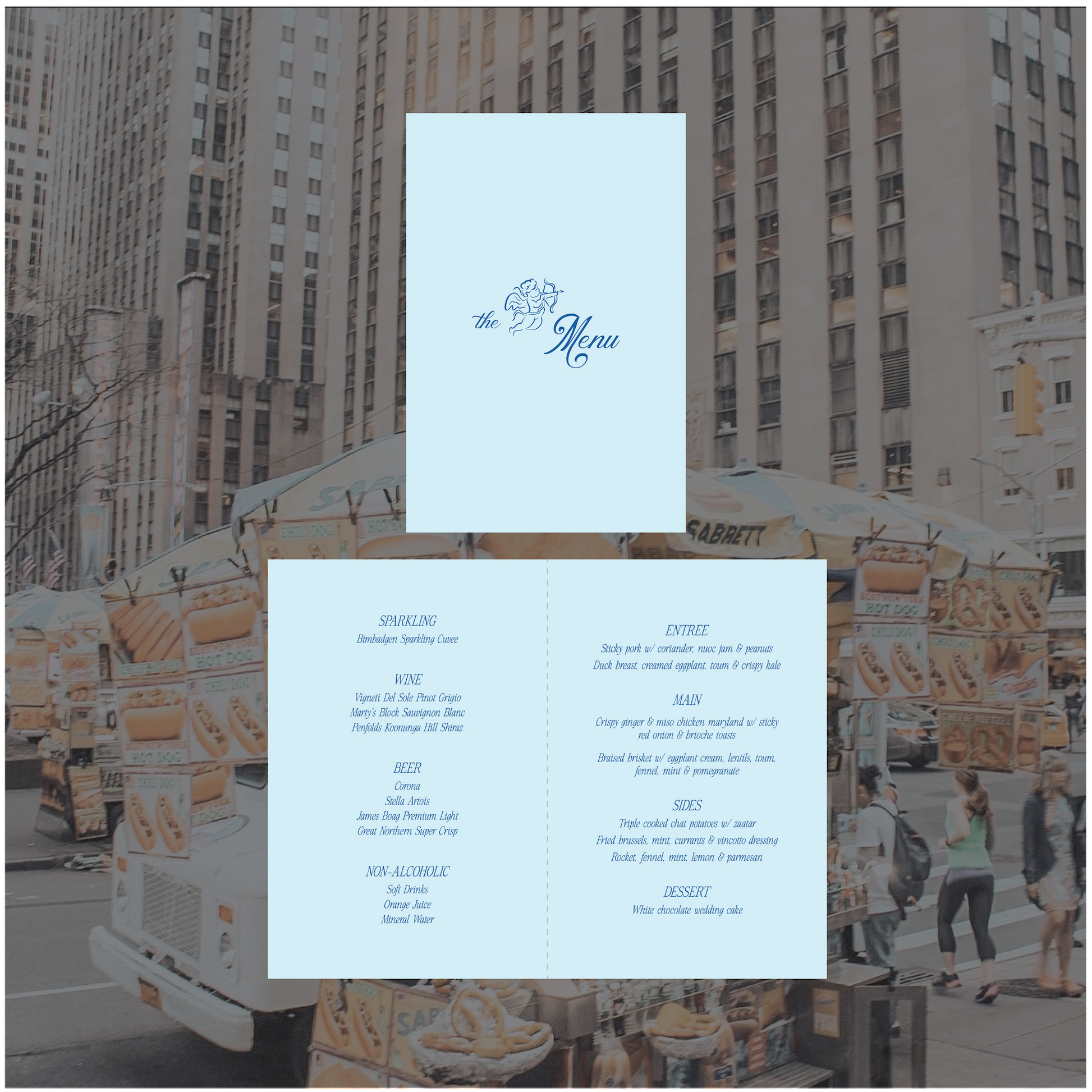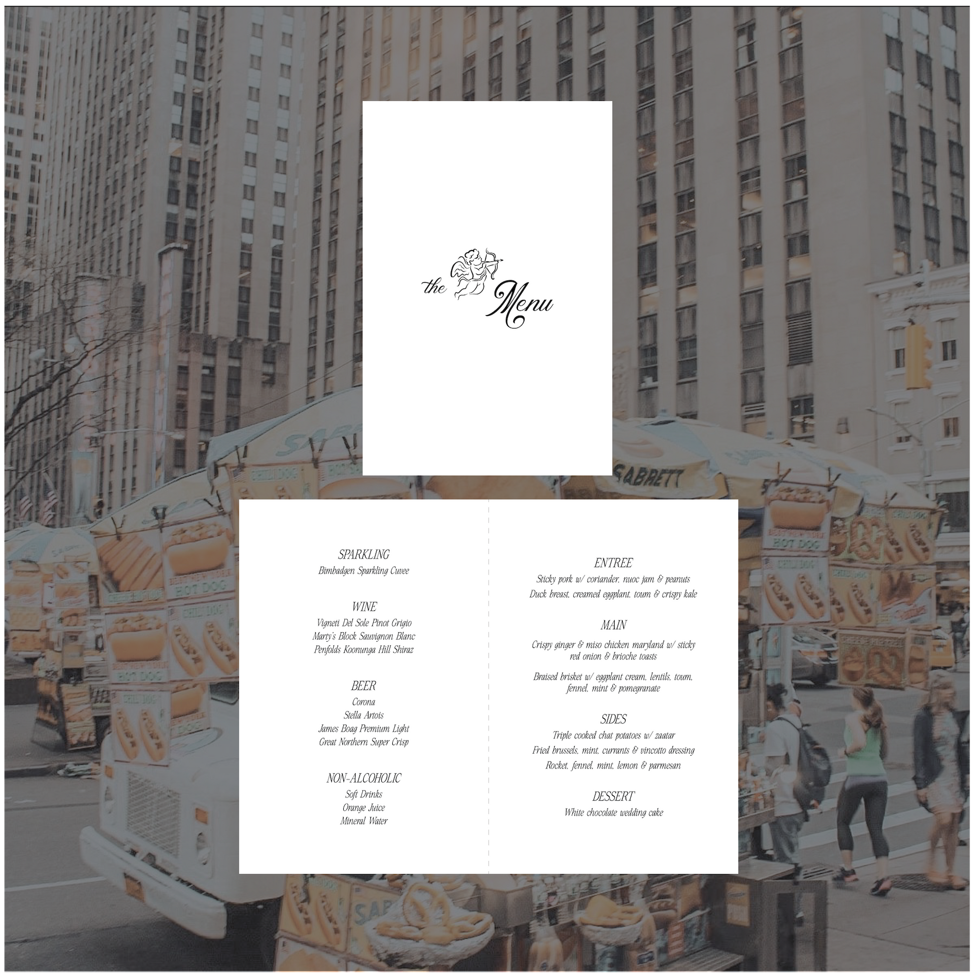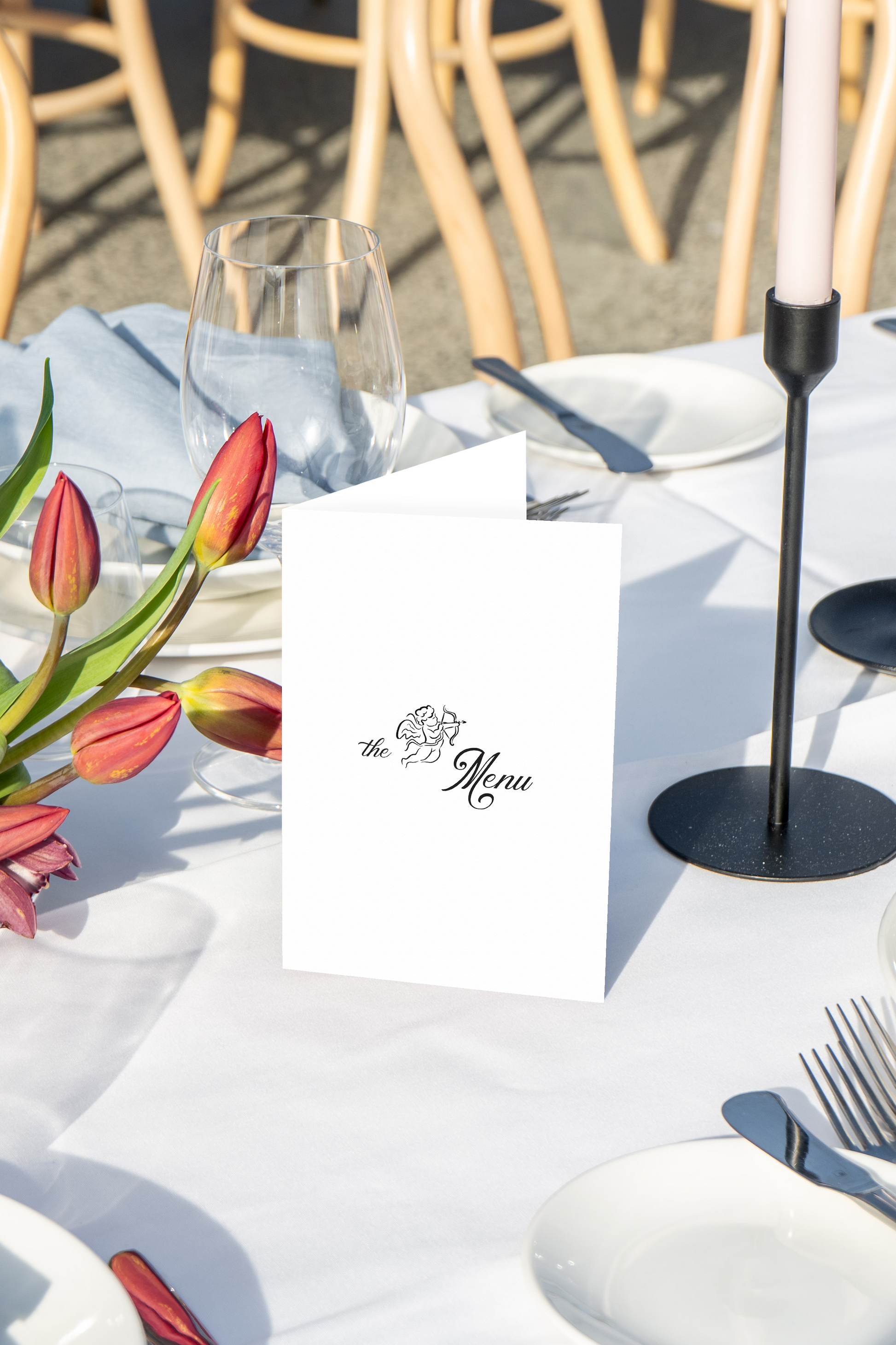 • Double Sided scored standing menu with your chosen quantity and colours. Menu is 120x180mm folded, 240x180mm unfolded. Inside can contain any menu item, saying quote etc. Example shows food and bar menu.