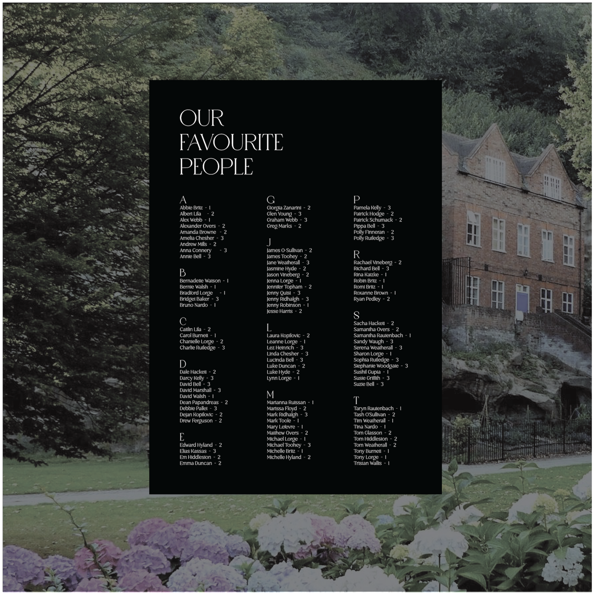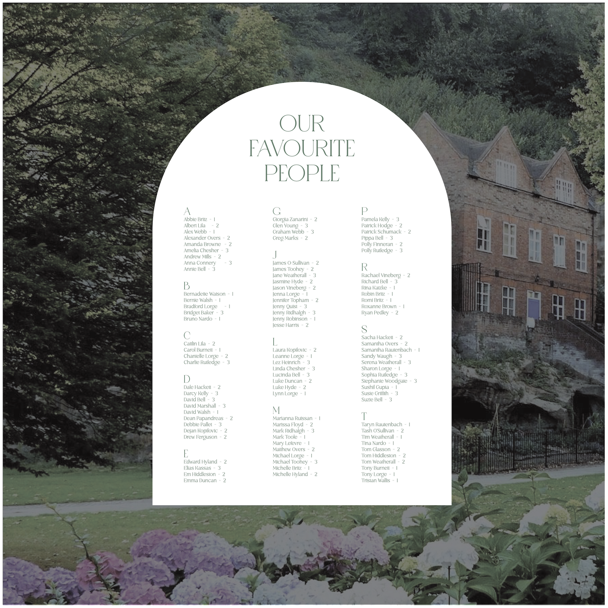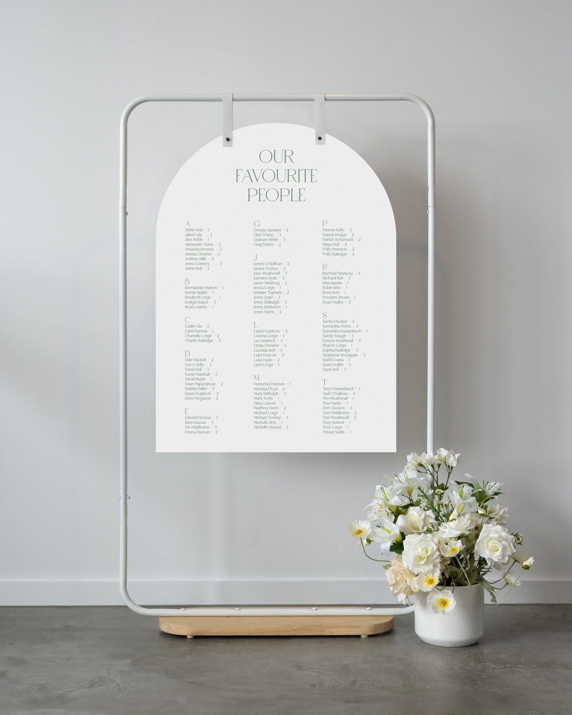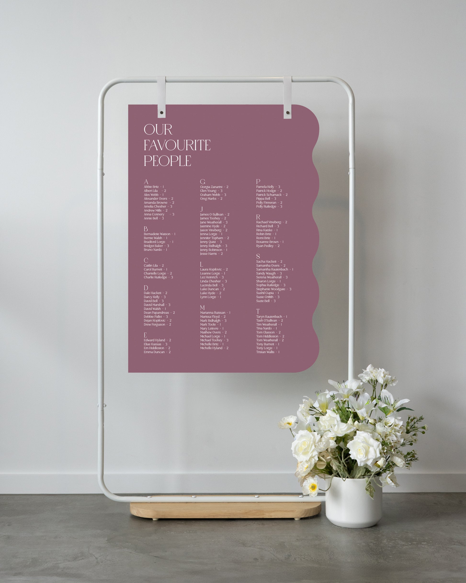 If you have over this number of guests and order a sign too small, a design fee may occur to re-work the design to fit the names otherwise an upgrade fee to a larger size to accomodate the guest list may occur.
