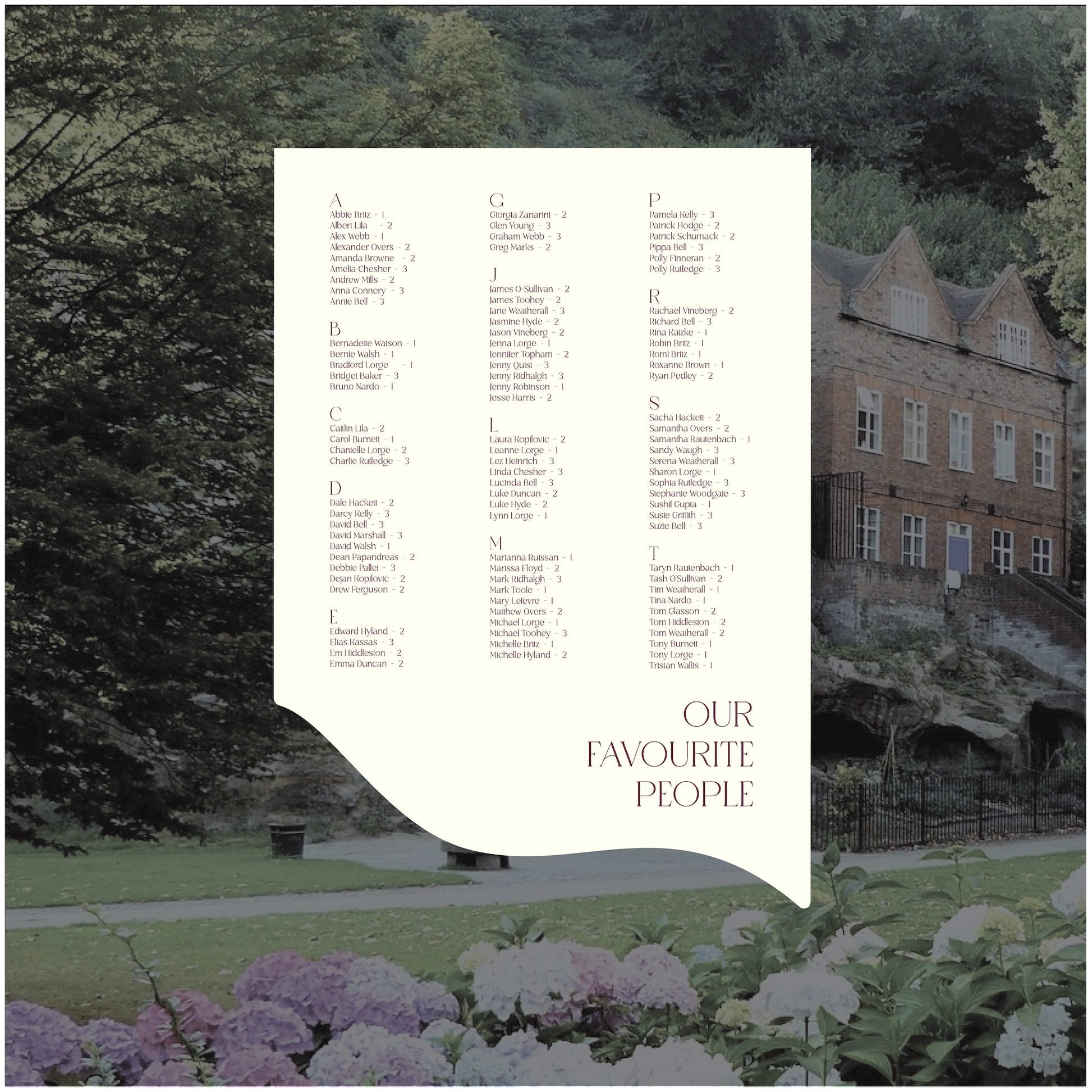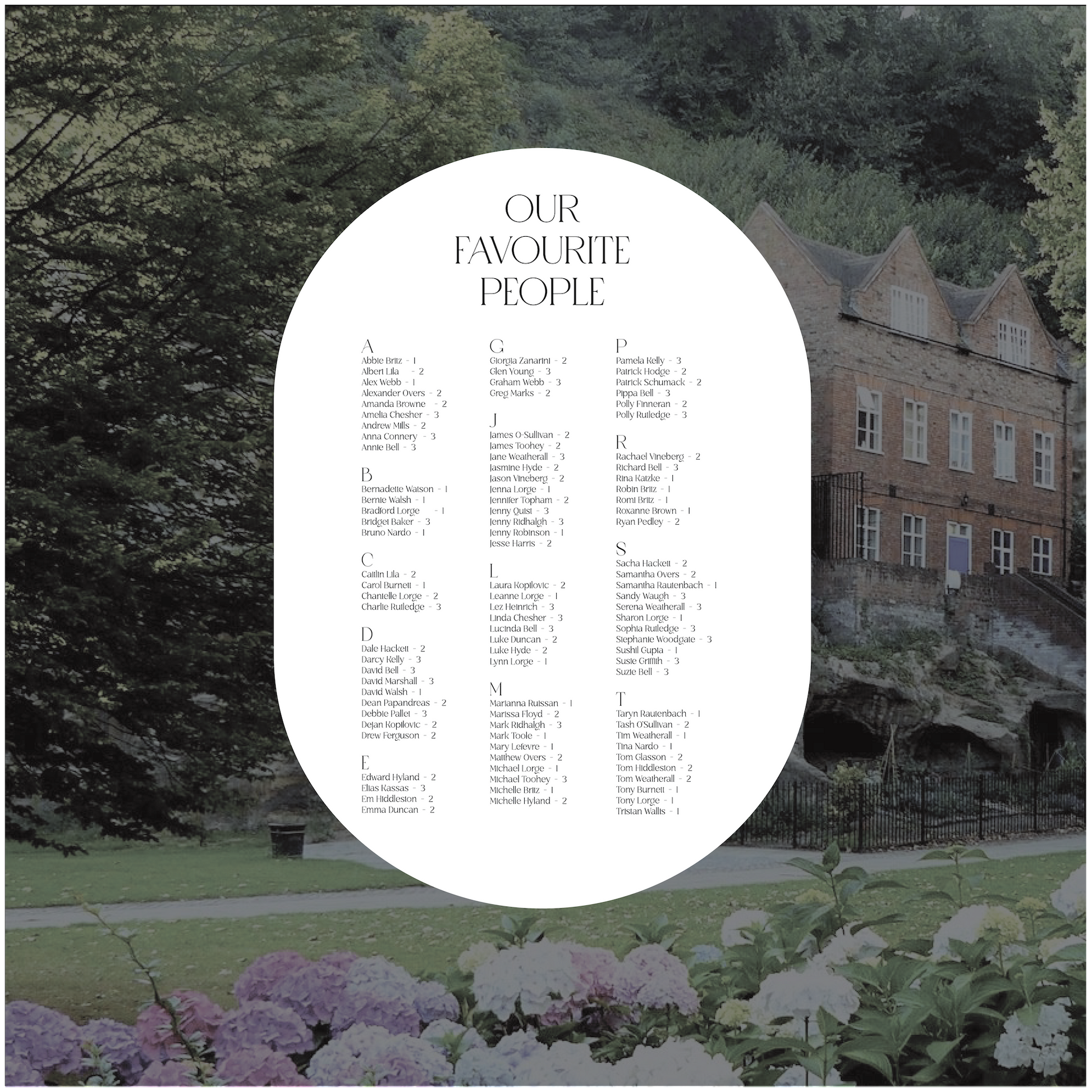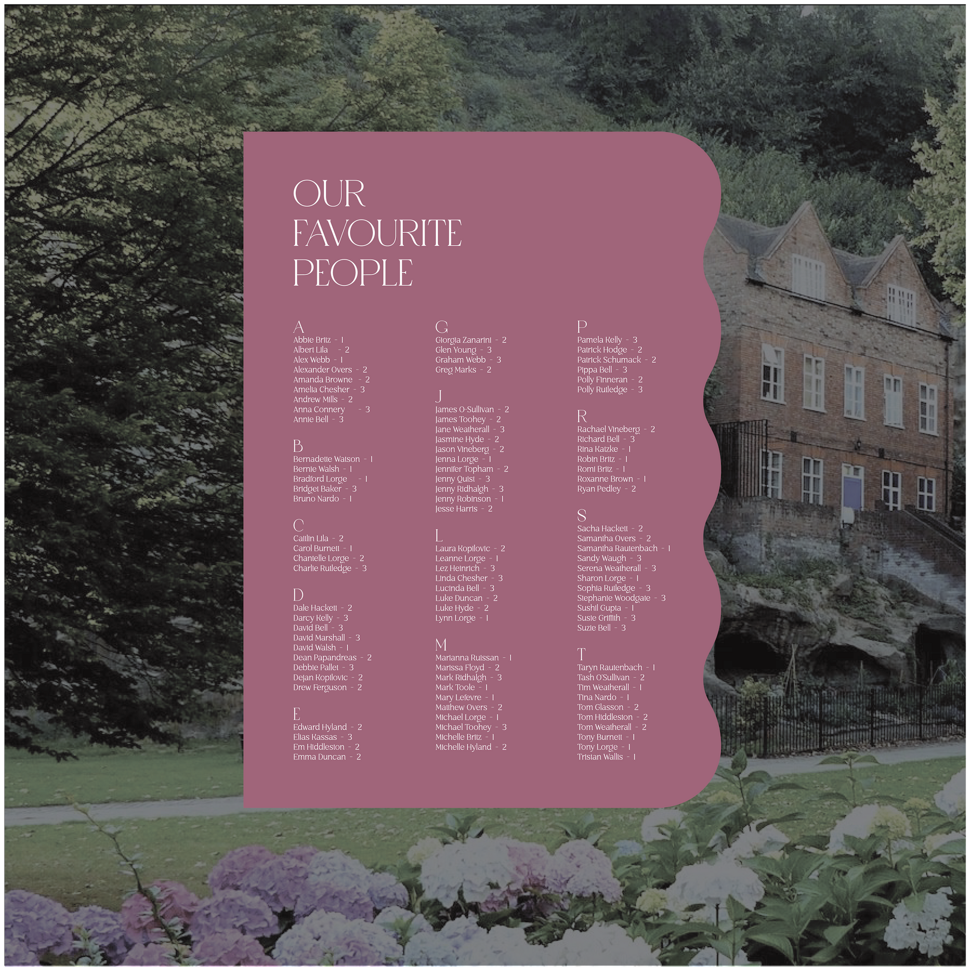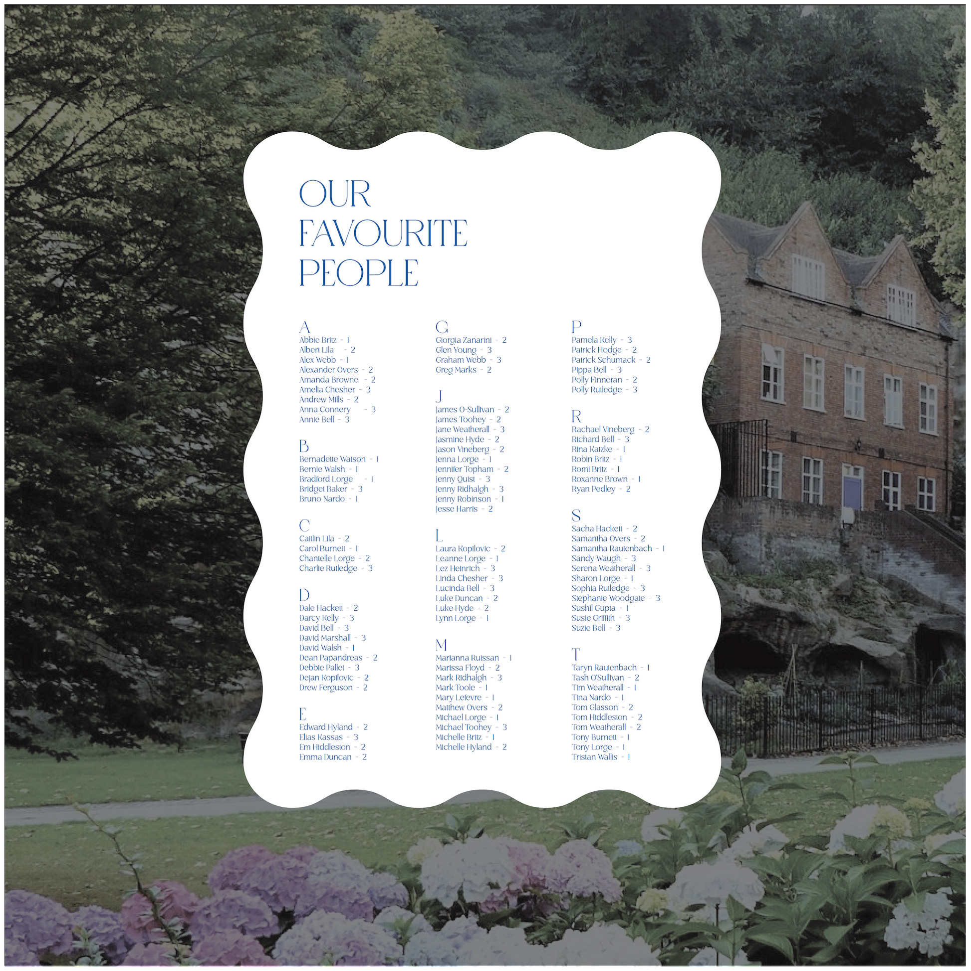 If you have over this number of guests and order a sign too small, a design fee may occur to re-work the design to fit the names otherwise an upgrade fee to a larger size to accomodate the guest list may occur.
