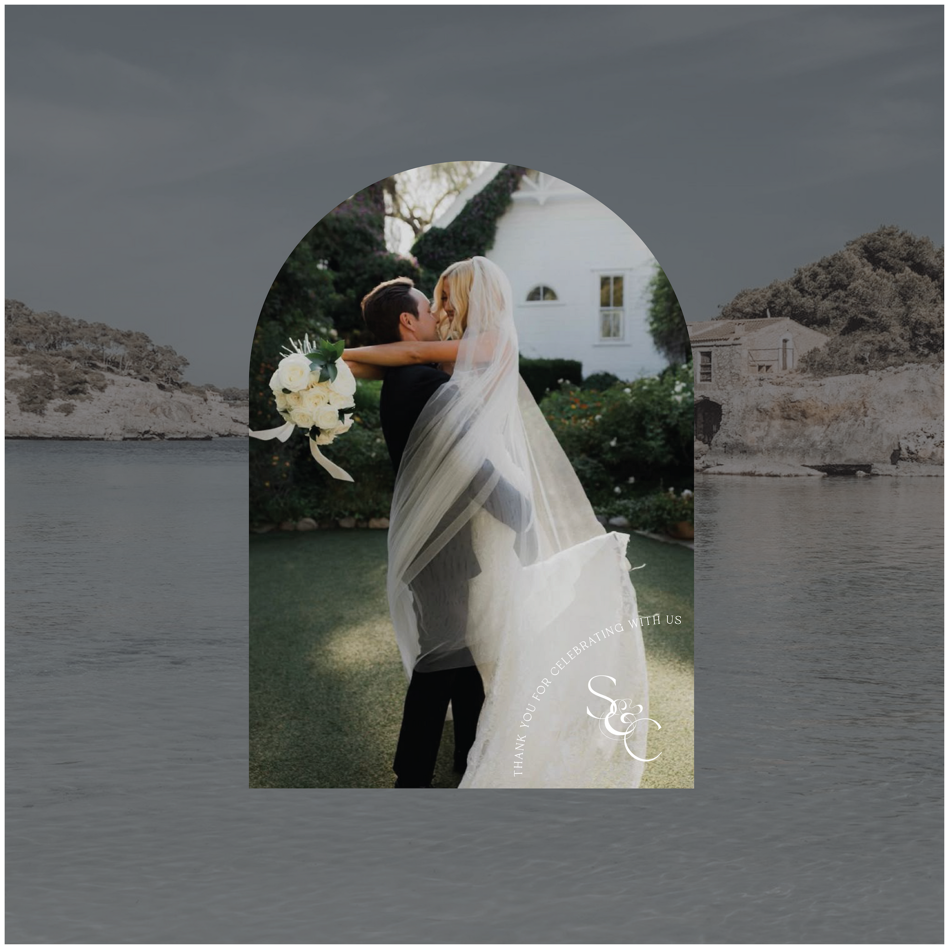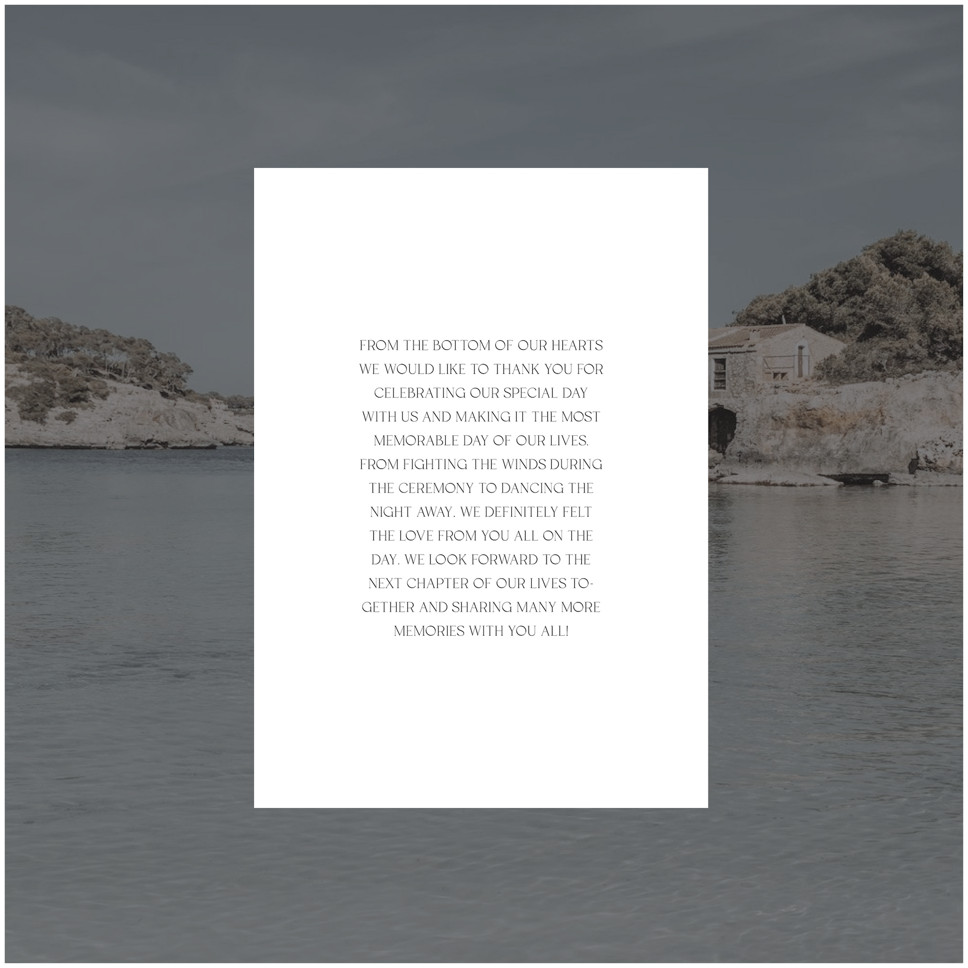Part of the Spain Collection, this thank you card contains the distinctive initial logo that is across the collection with fun curved text framing it in the corner. It is the perfect modern piece to send to your guests as a final thank you for being apart of your epic celebration.