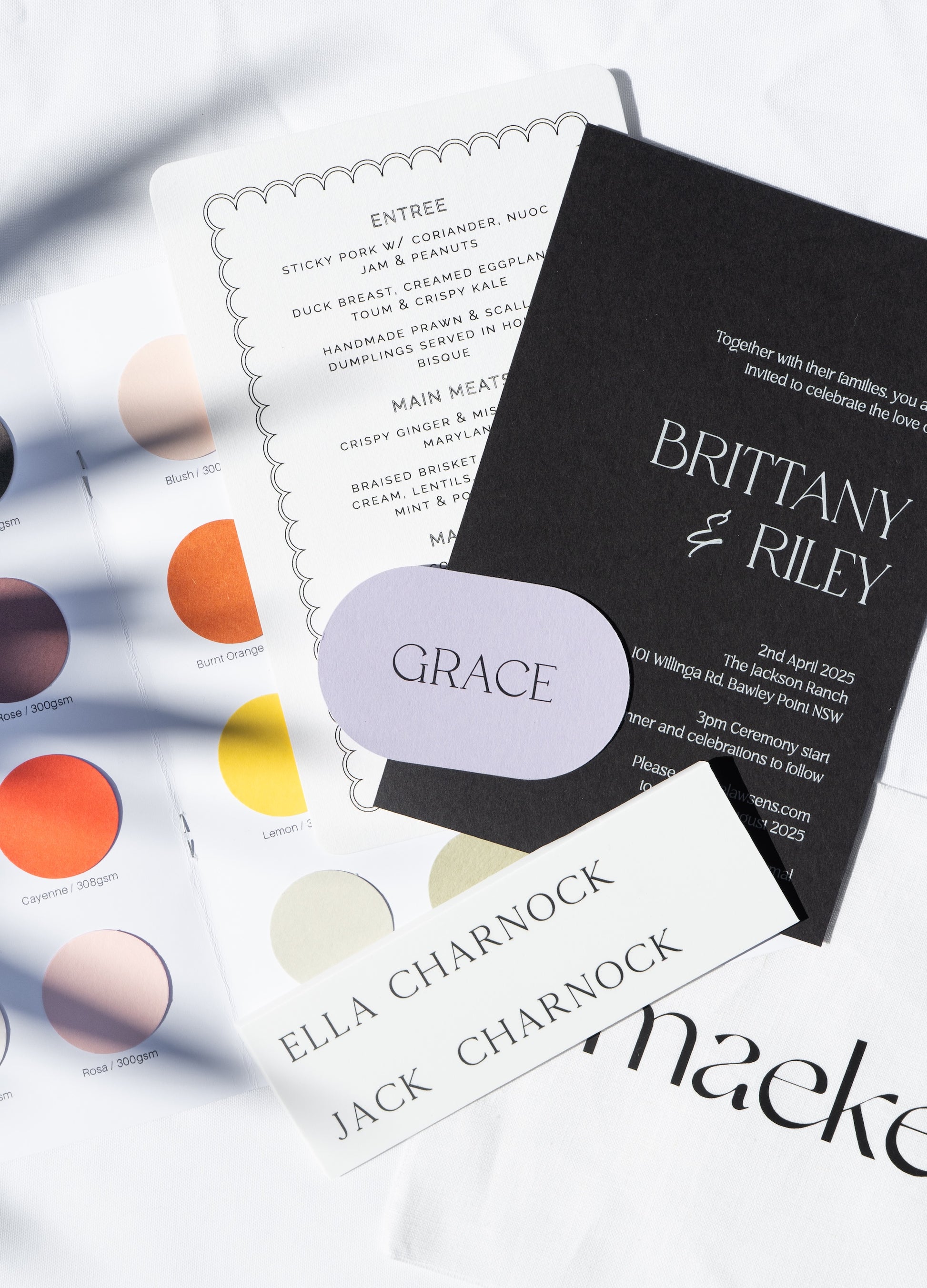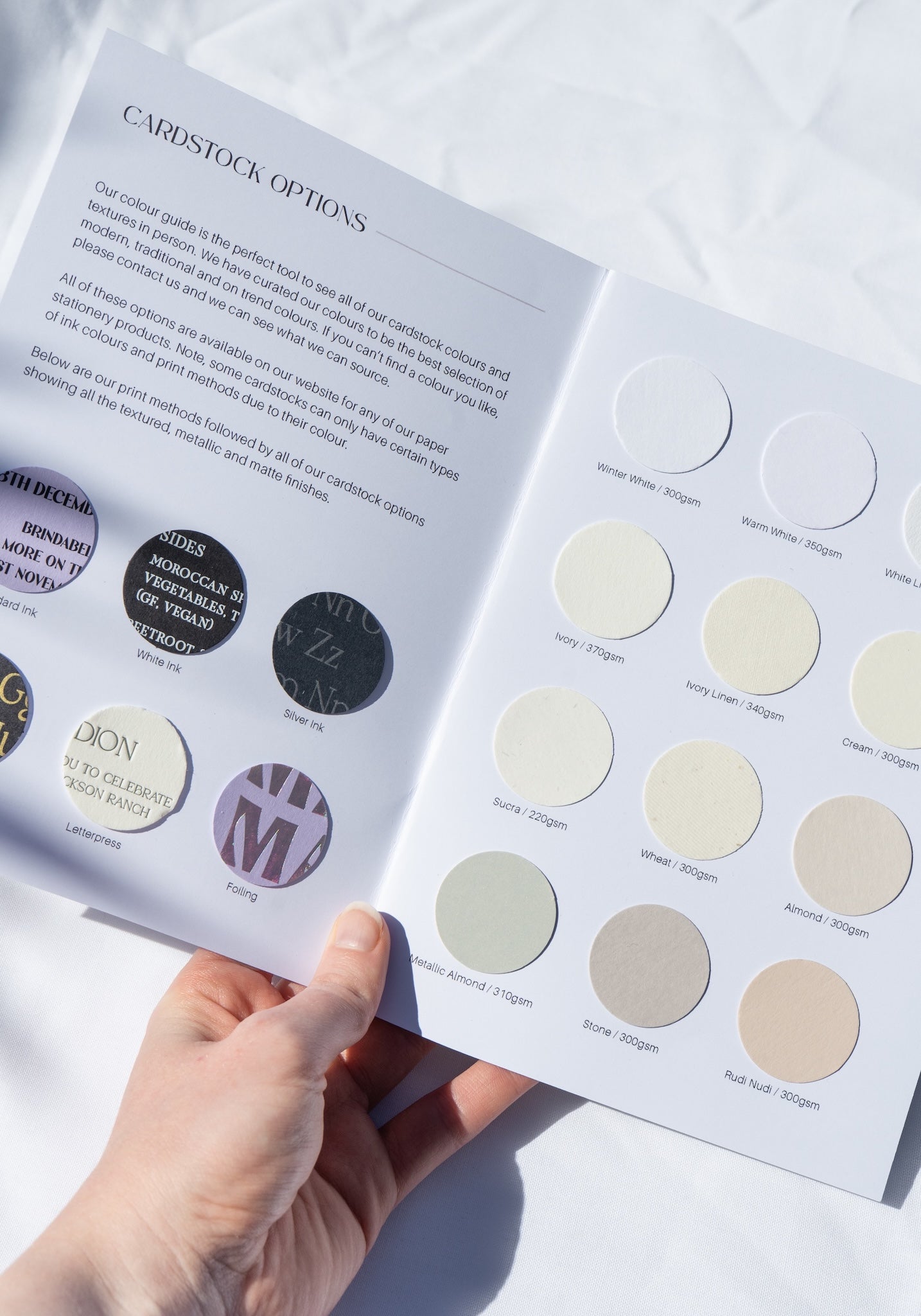 Our three sample pack options are the perfect tool to see all of our curated cardstock colour range (the best selection of modern, traditional and on trend colours) and textures in person as well as receiving items tailored to the stage of wedding planning you are up to.