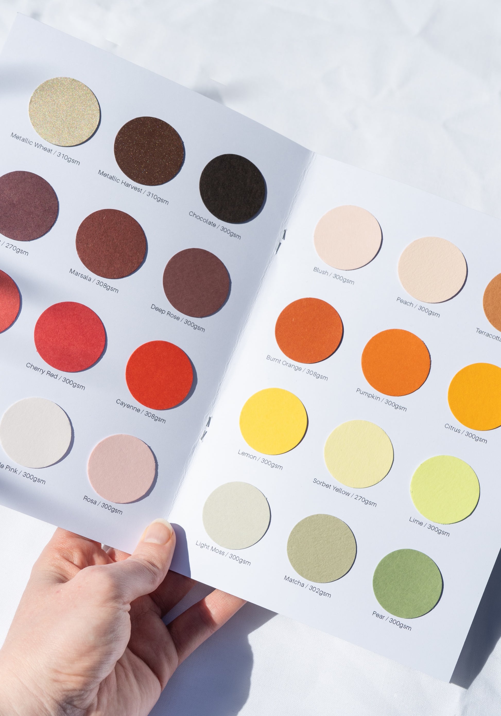 • A booklet that displays all our curated colour cardstock samples in a 3cm circle size. Along with 3cm circle size samples of our print methods.