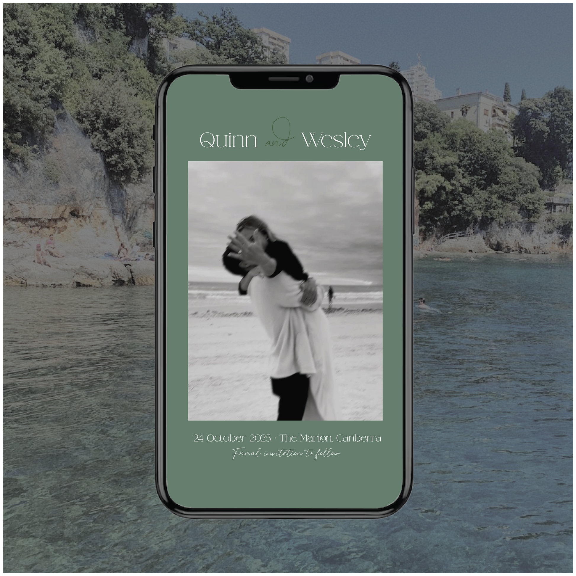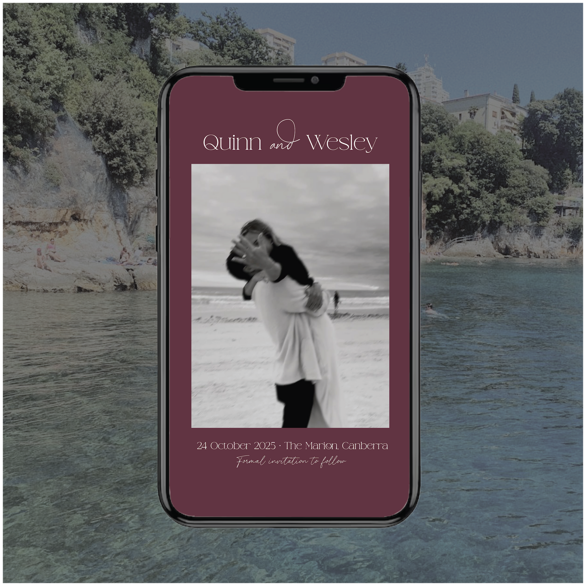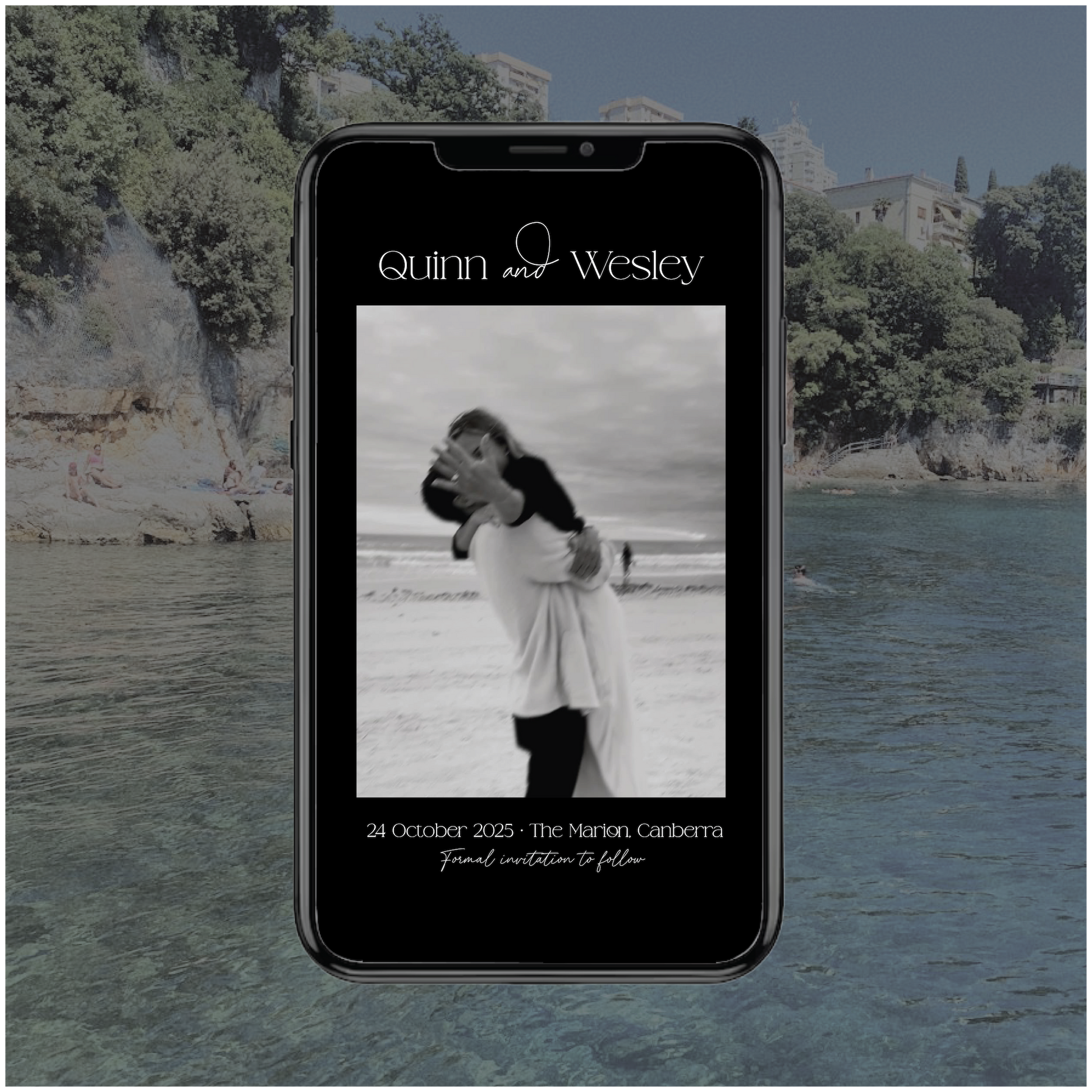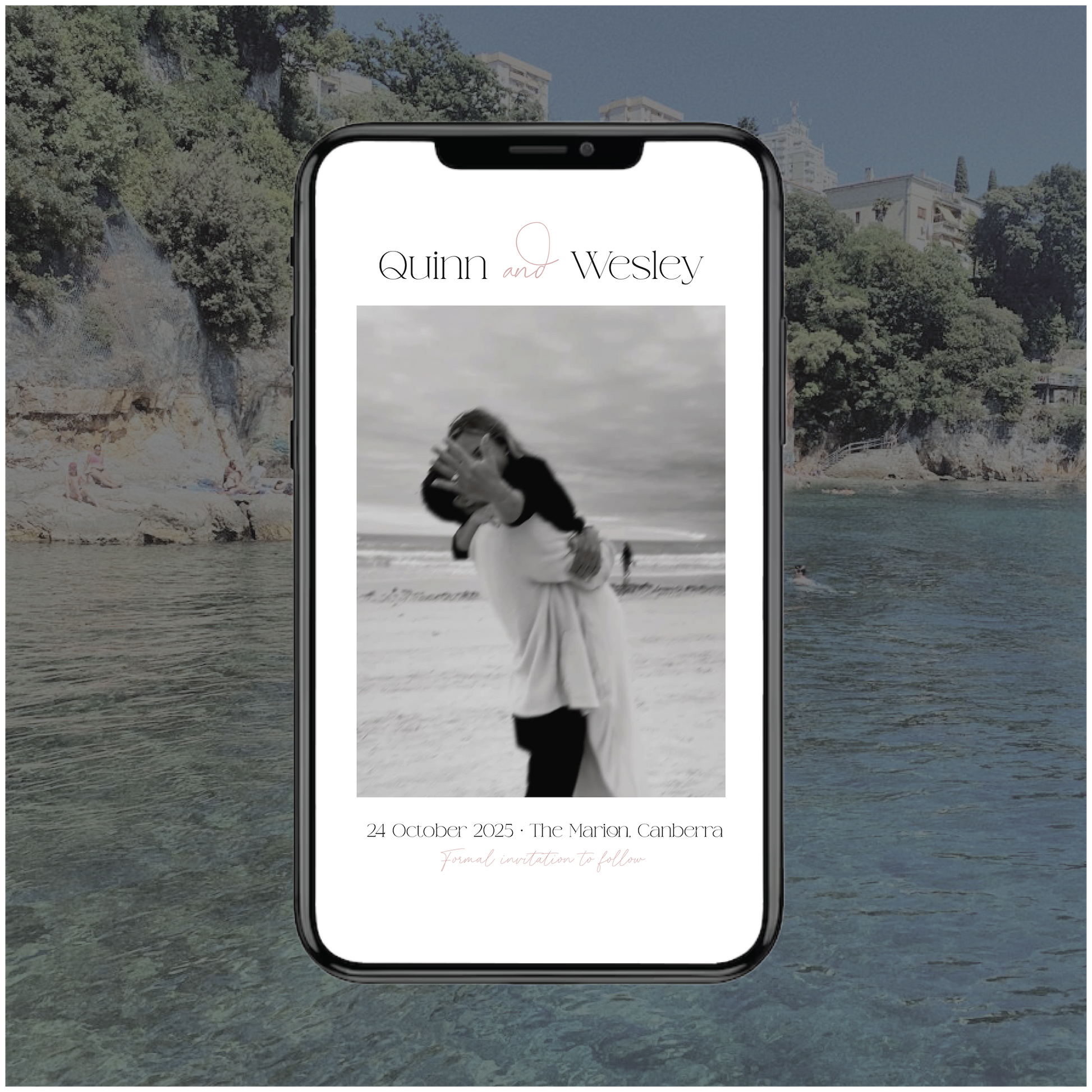 Part of the Croatia Collection, this digital save the date wedding invite is modern, romantic and a little bit fun with it's script elements and photo detail.