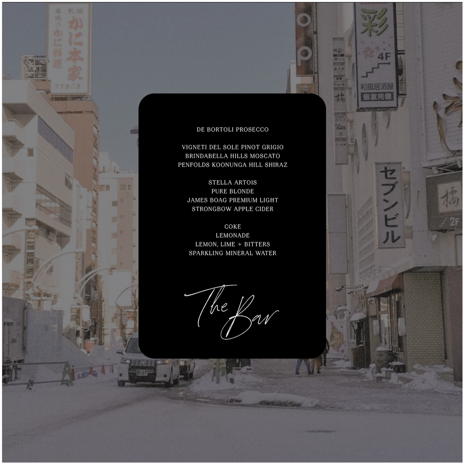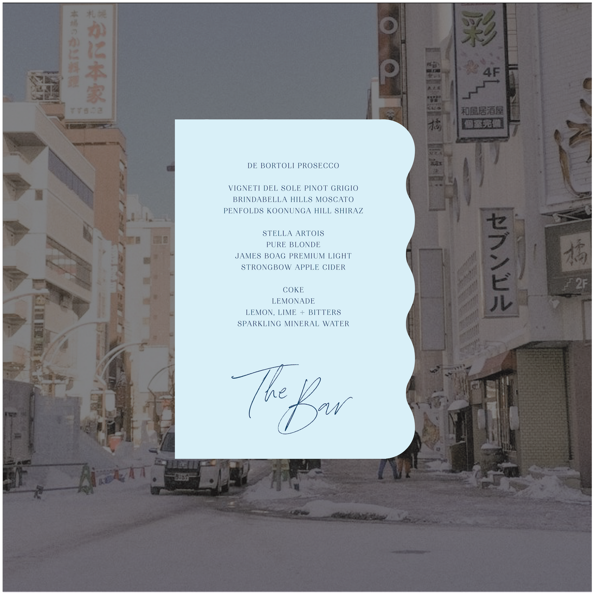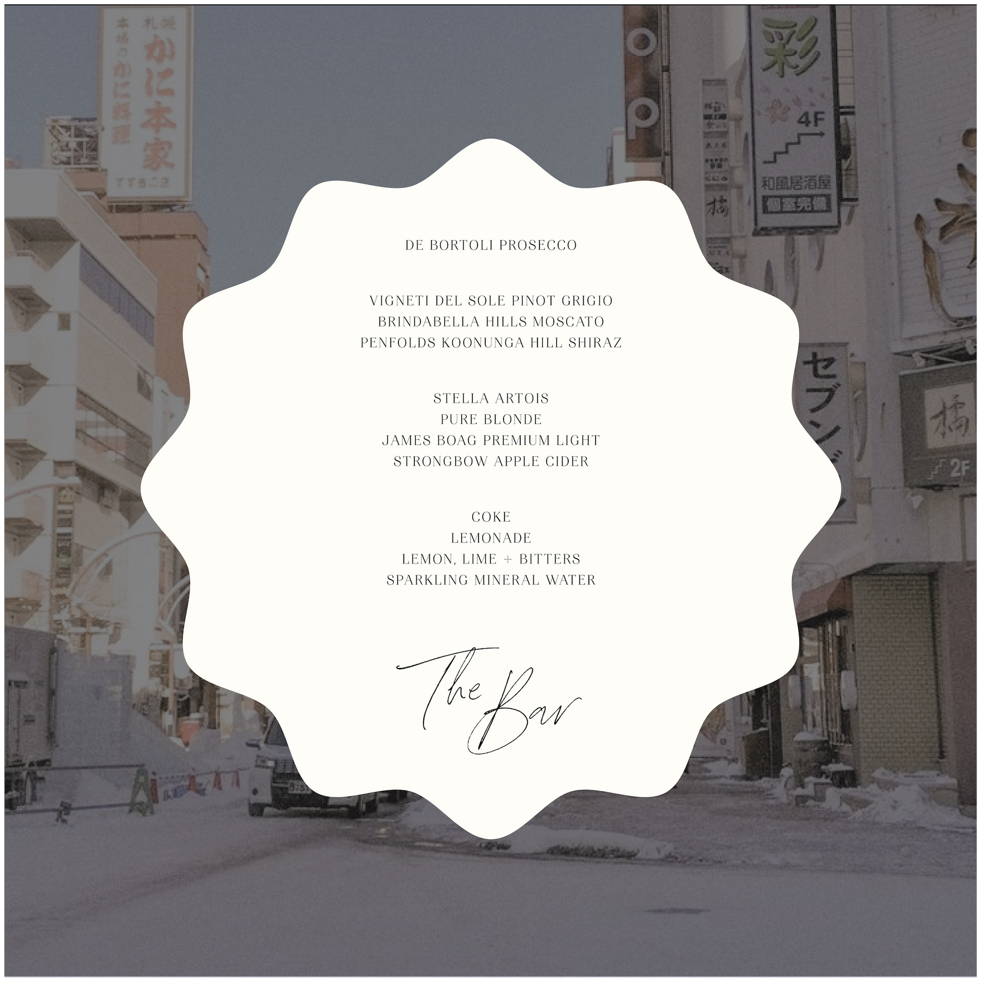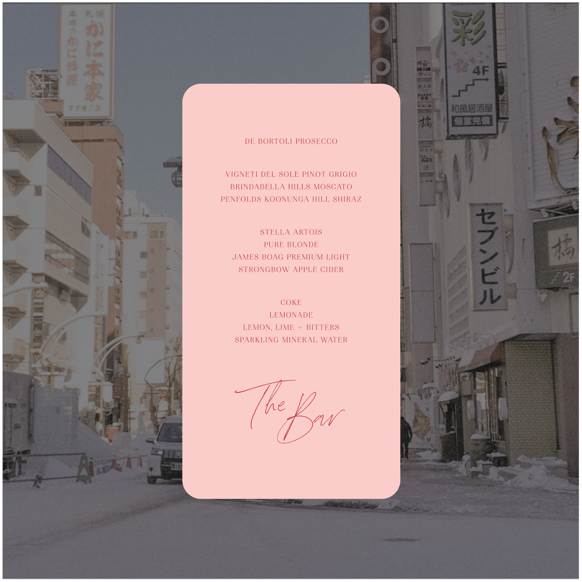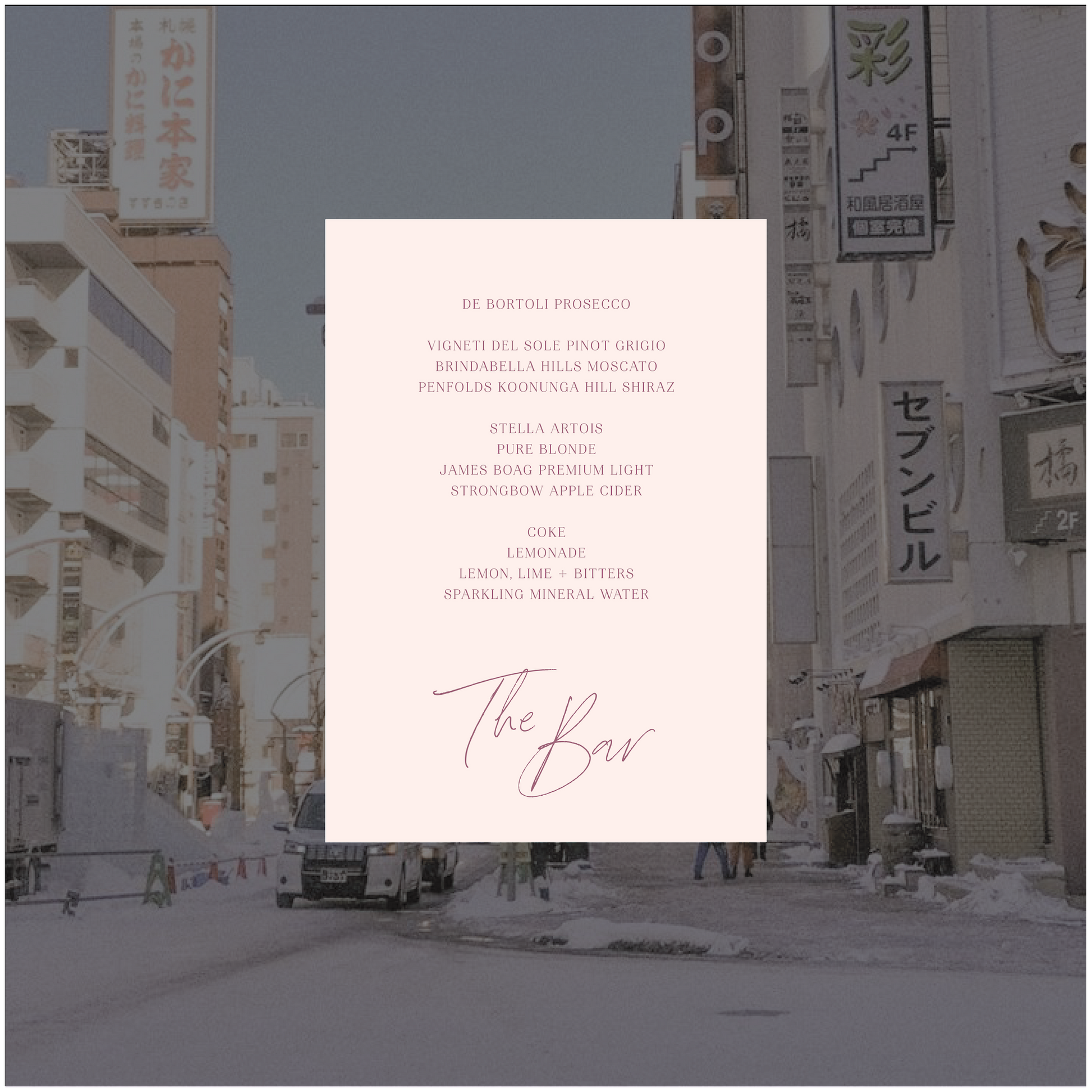 Part of the Japan Collection, this bar sign is giving whimsical, romantic vibes with a combination of cursive font and modern body text.