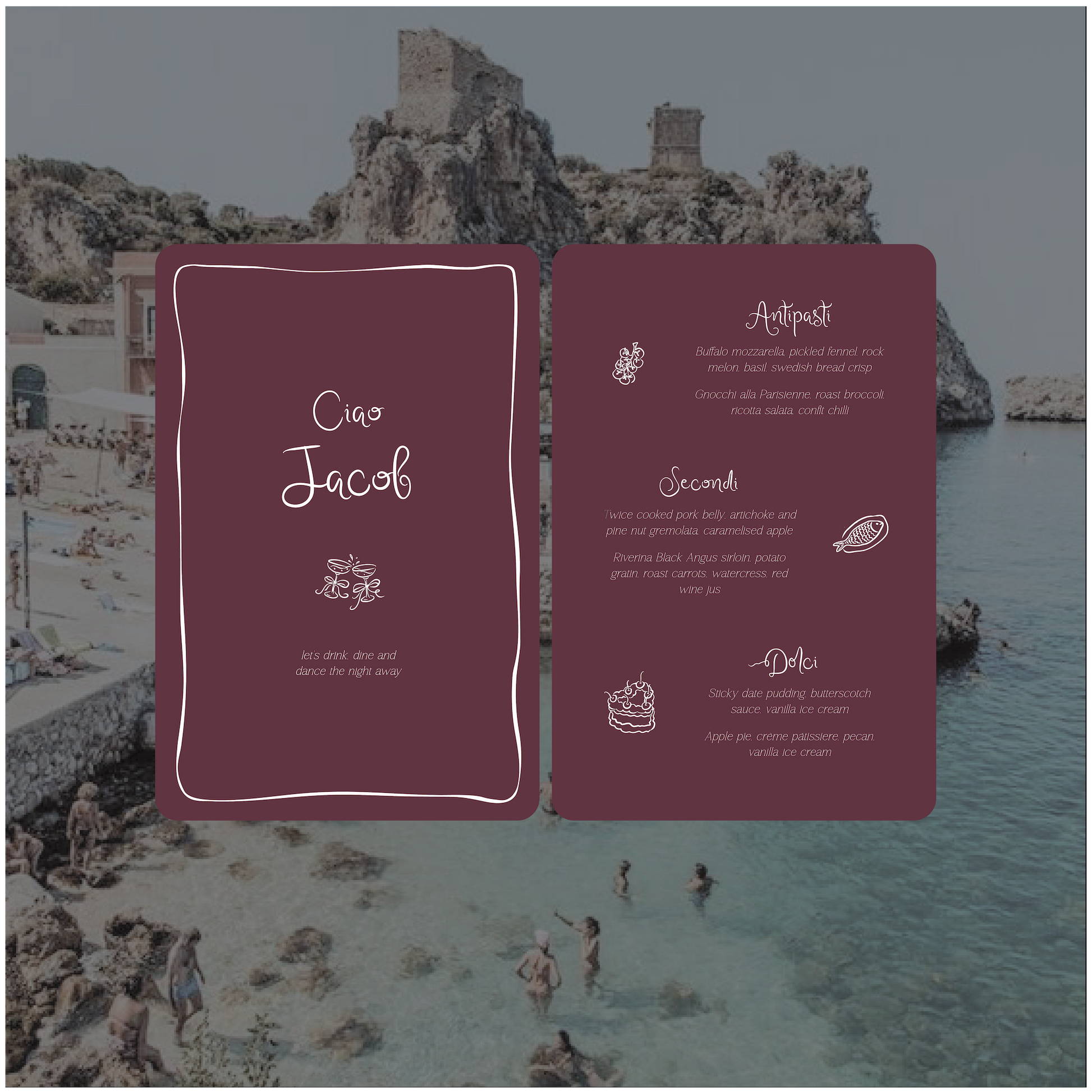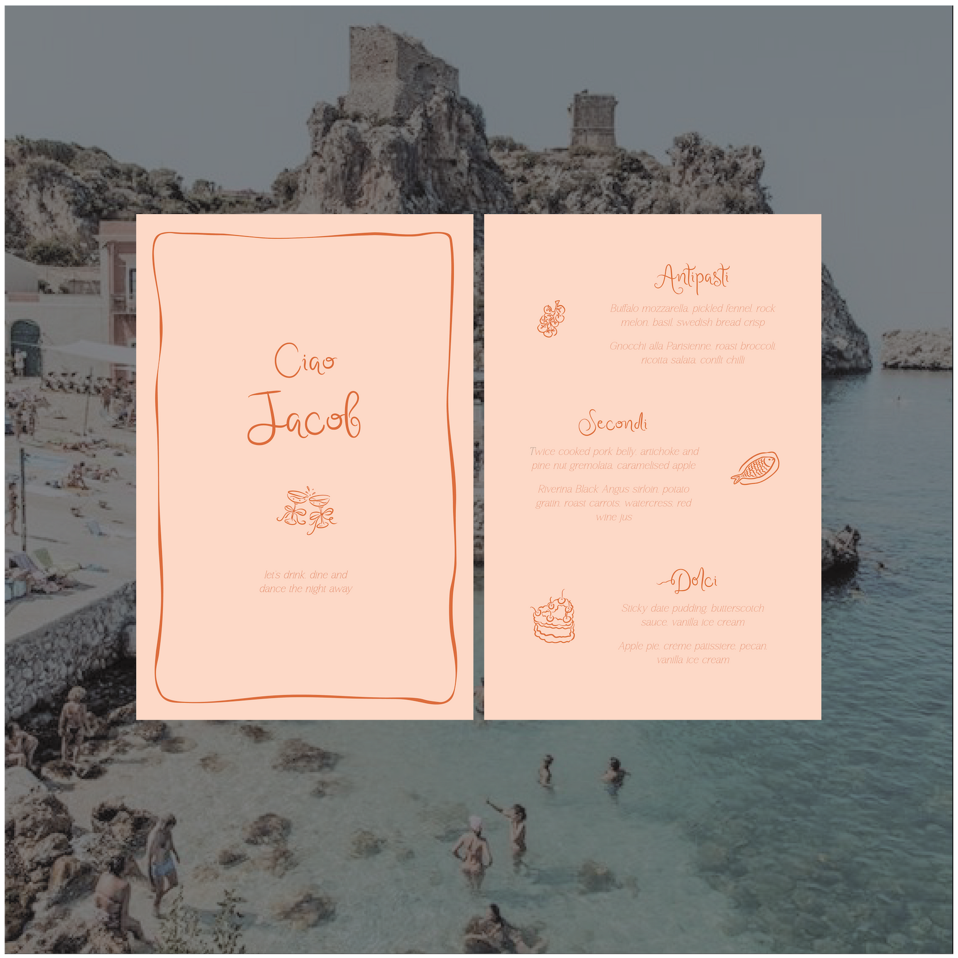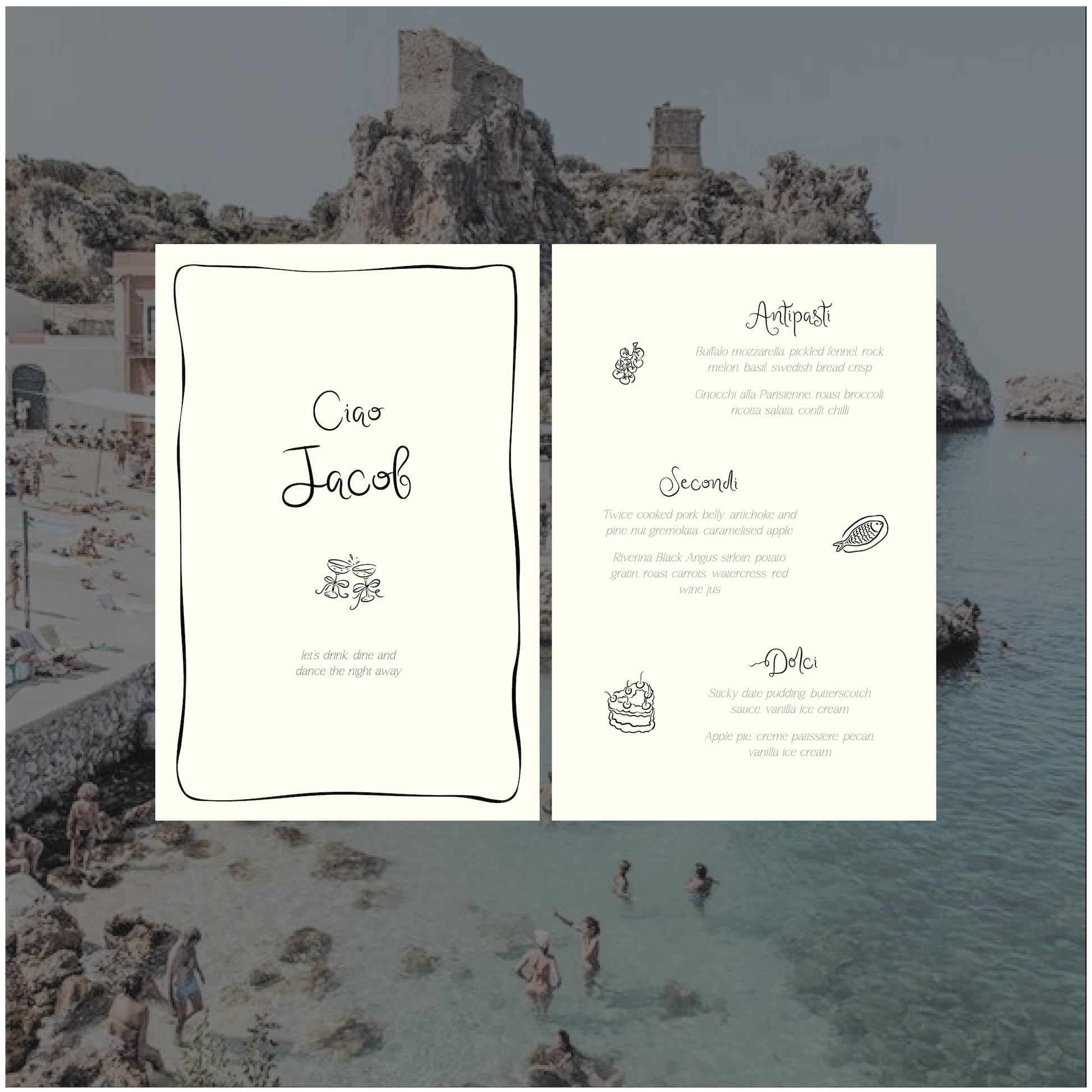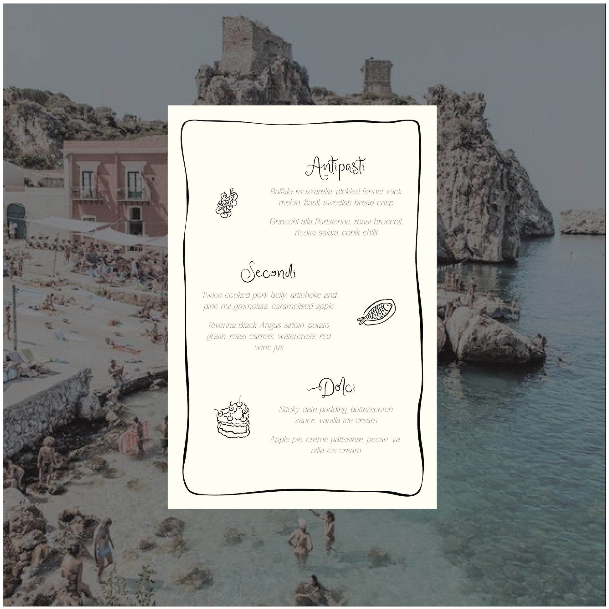 Part of the Italy Collection, this menu will transport you to Italy with our fun curly font and la dolce vita lifestyle vibes. Optional illustrations to make it that extra bit special.