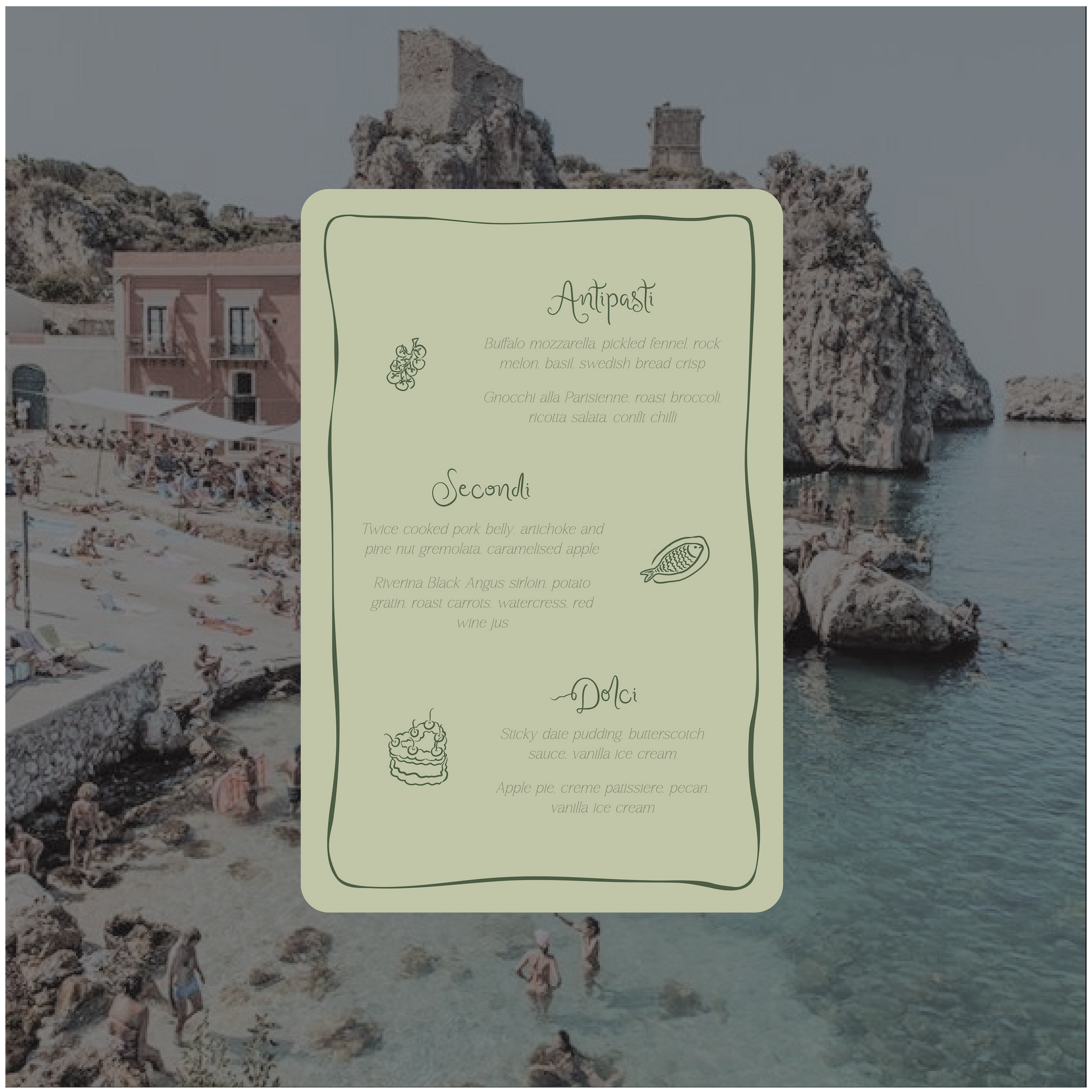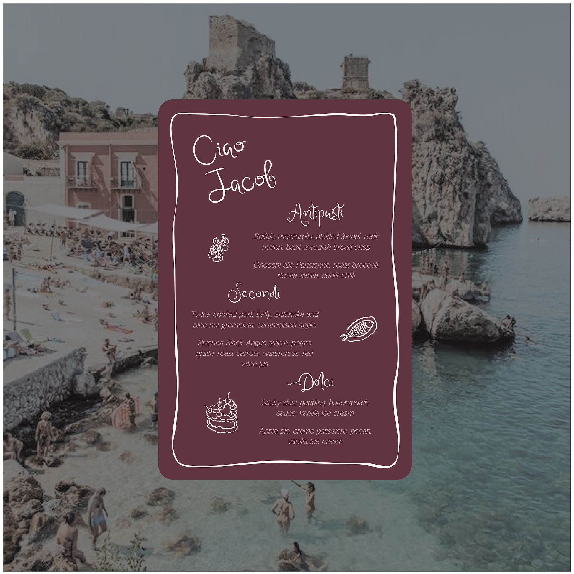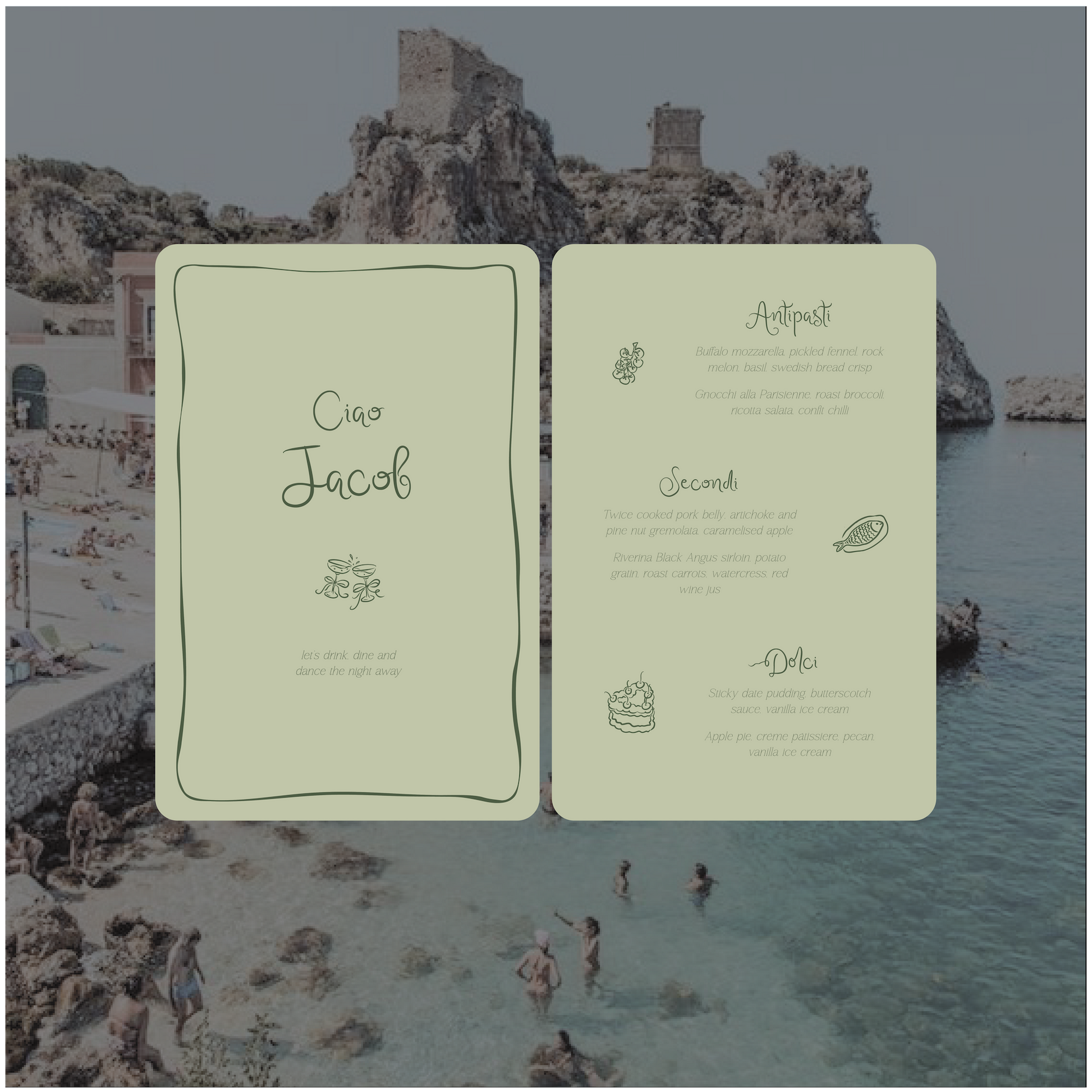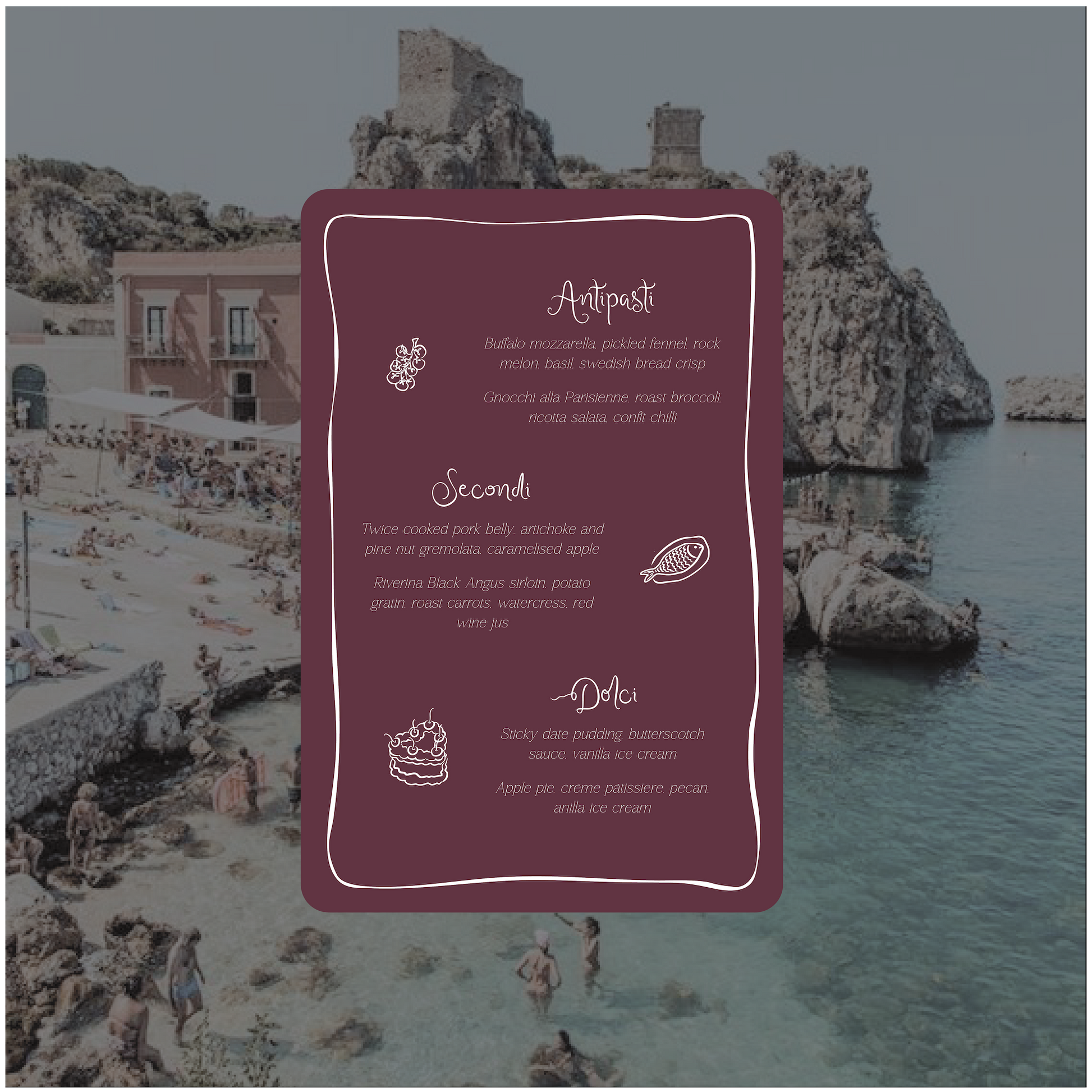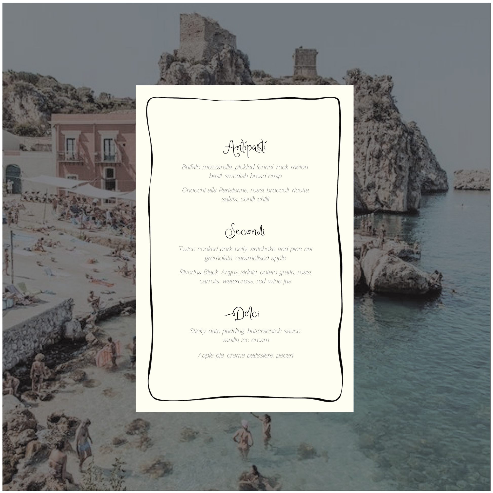 Part of the Italy Collection, this menu will transport you to Italy with our fun curly font and la dolce vita lifestyle vibes. Optional illustrations to make it that extra bit special.