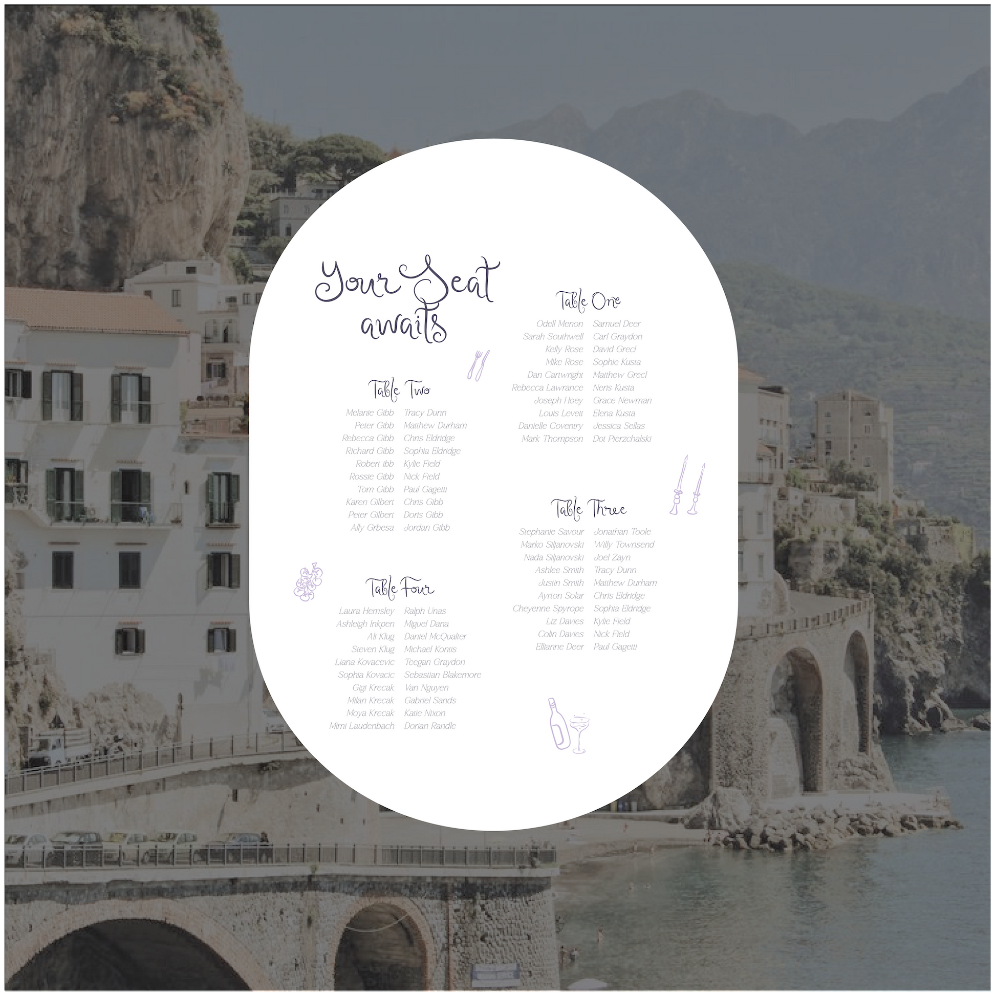 Part of the Italy Collection, this wedding seating chart will transport you to Italy with our fun curly font and la dolce vita lifestyle vibes. Optional illustrations to make it that extra bit special.