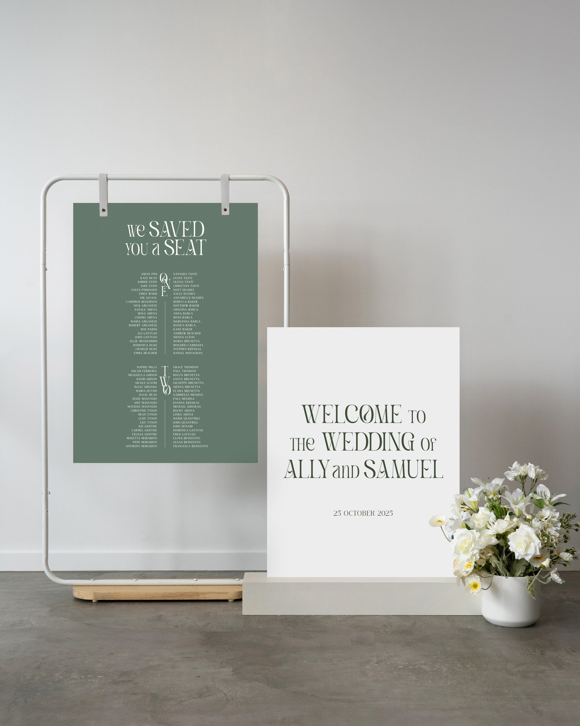 This Thailand wedding welcome and seating chart signage package uses strong graphic typography with leaf like details as it's hero element.