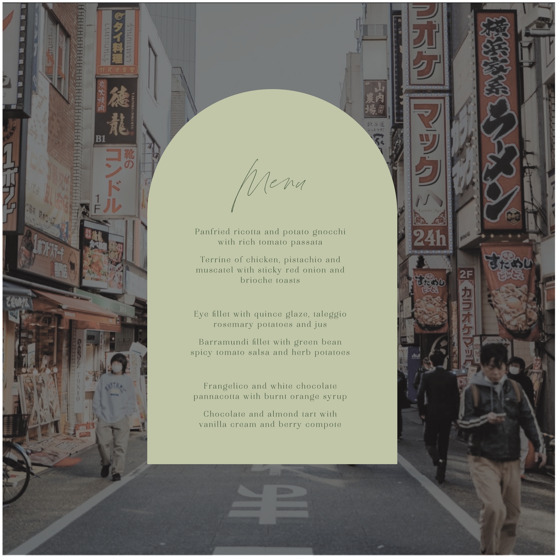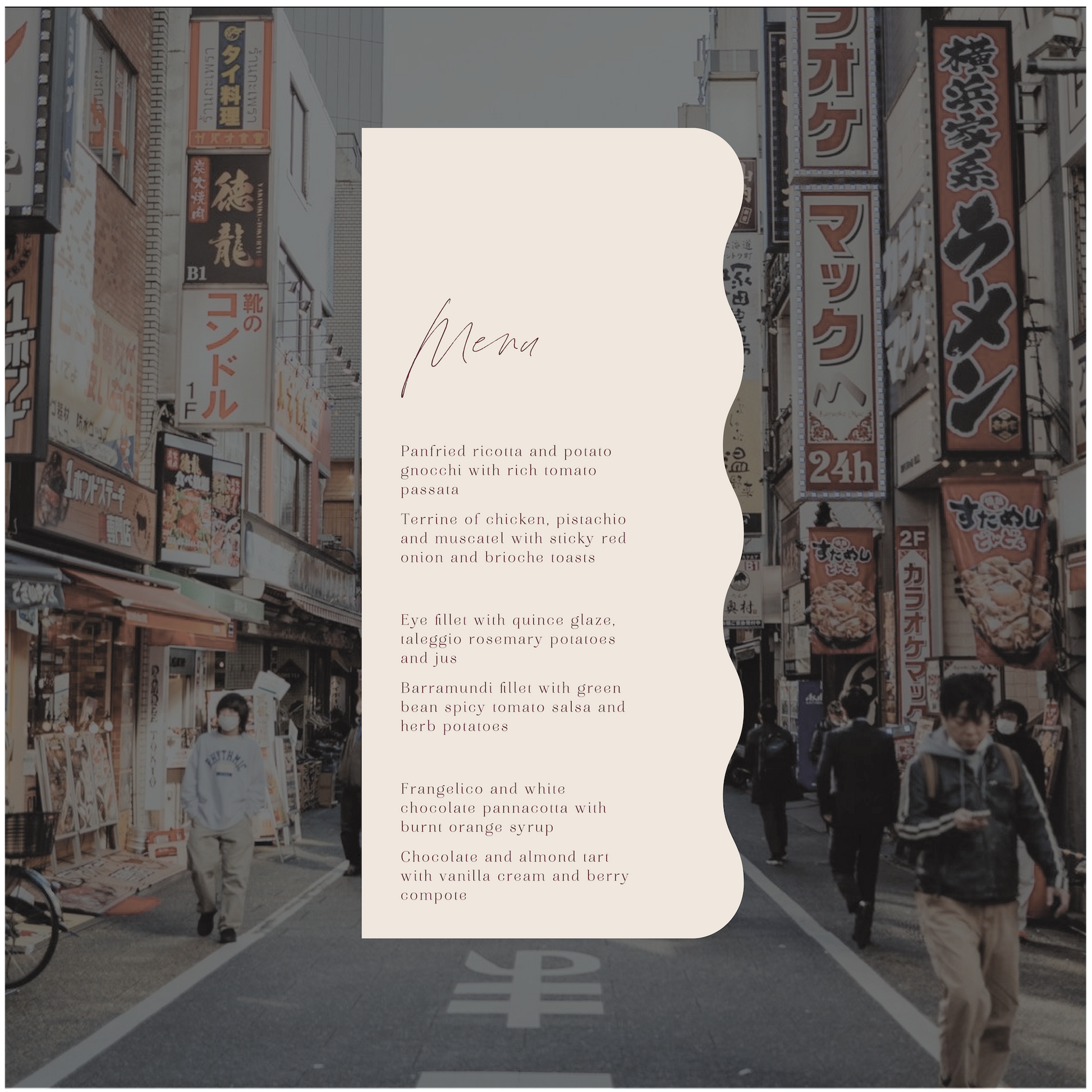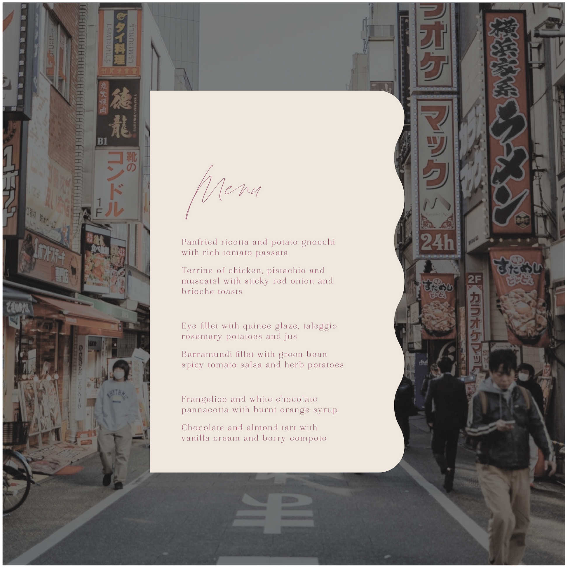 Part of the Japan Collection, this menu is giving whimsical, romantic vibes with a combination of cursive font and modern body text.