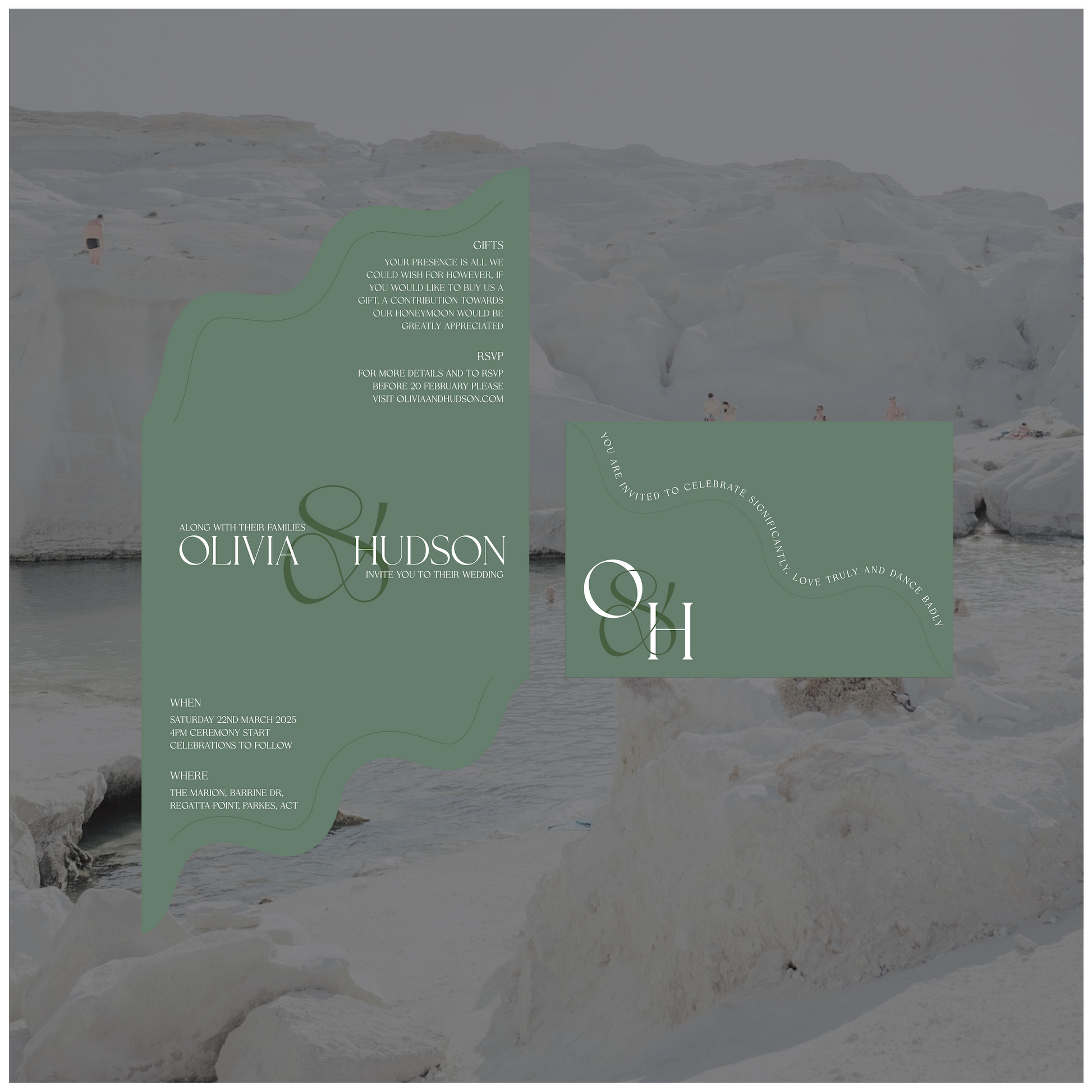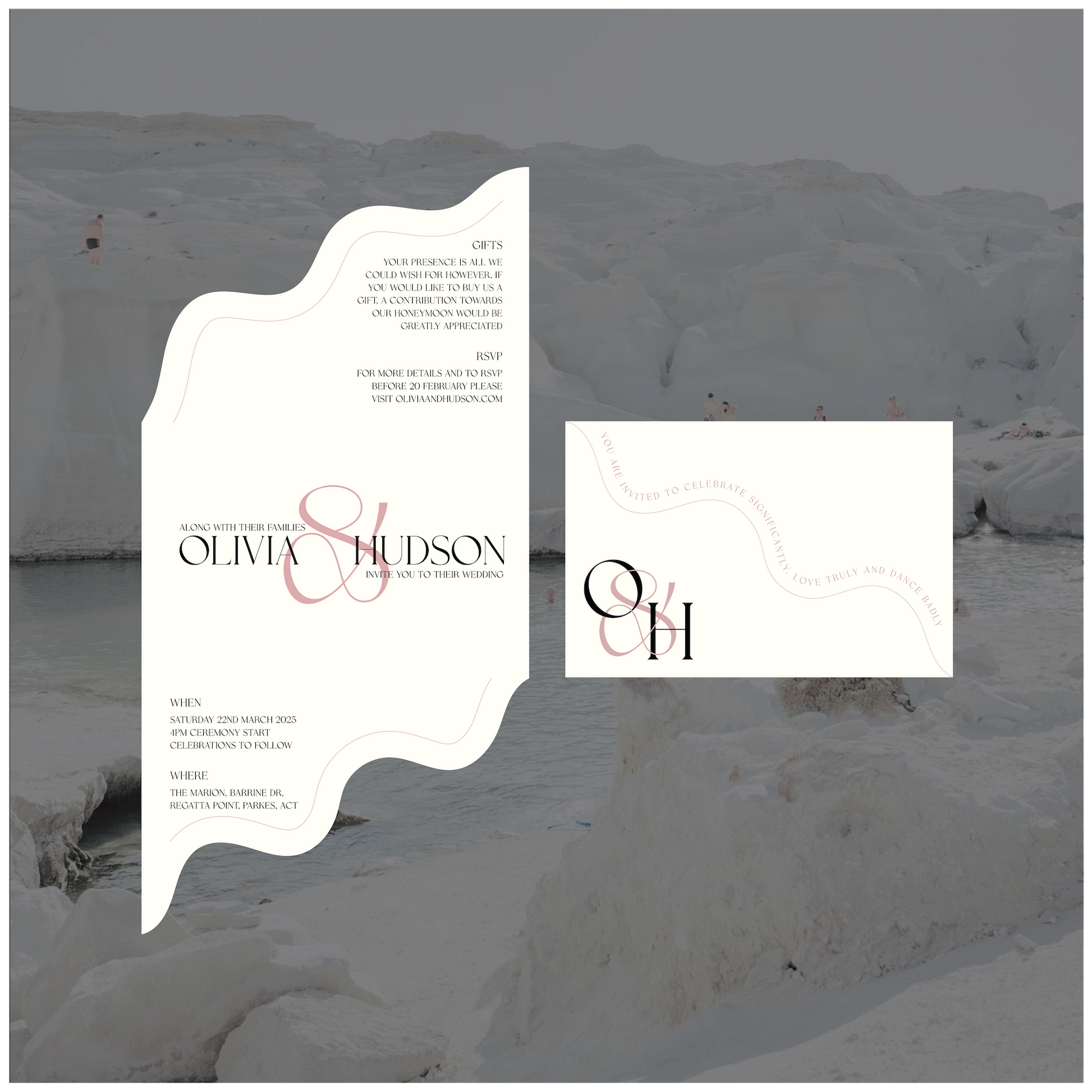 Part of the Greece Collection, this folded wedding invite is modern yet will stand the test of time with flowing texture elements, a feature & symbol and a unique wave shape that folds together and holds with a little tuck cut in the corner.